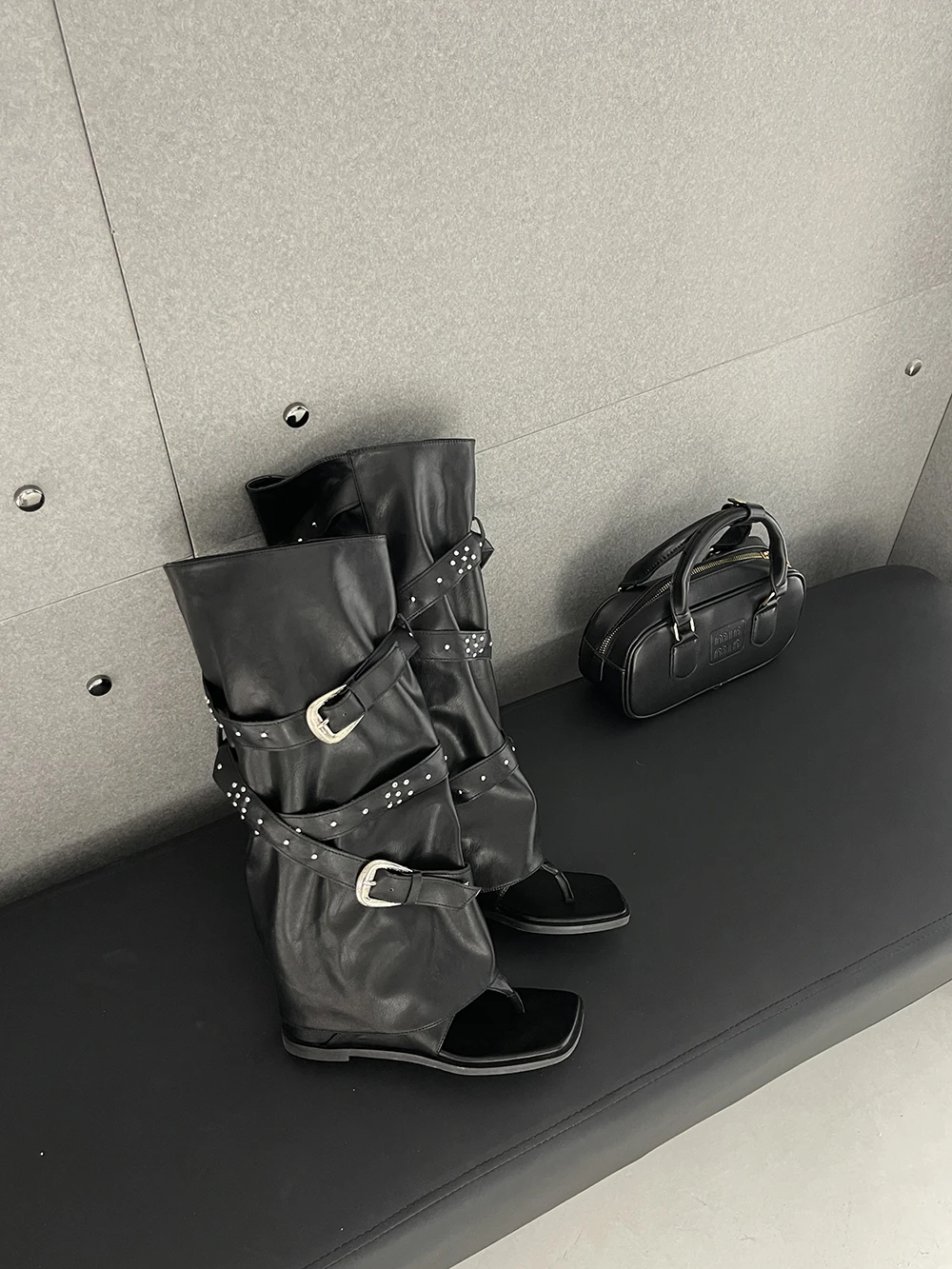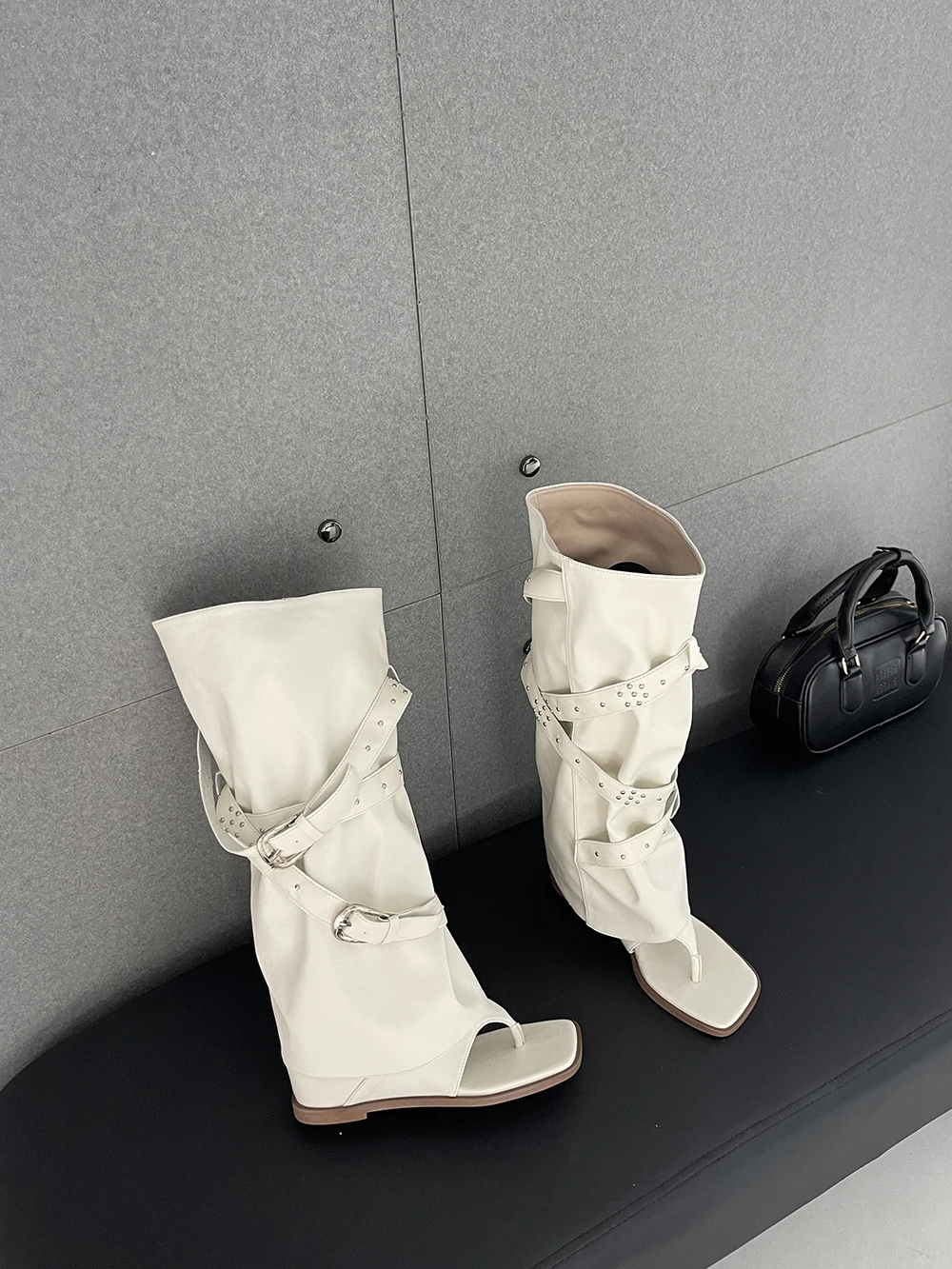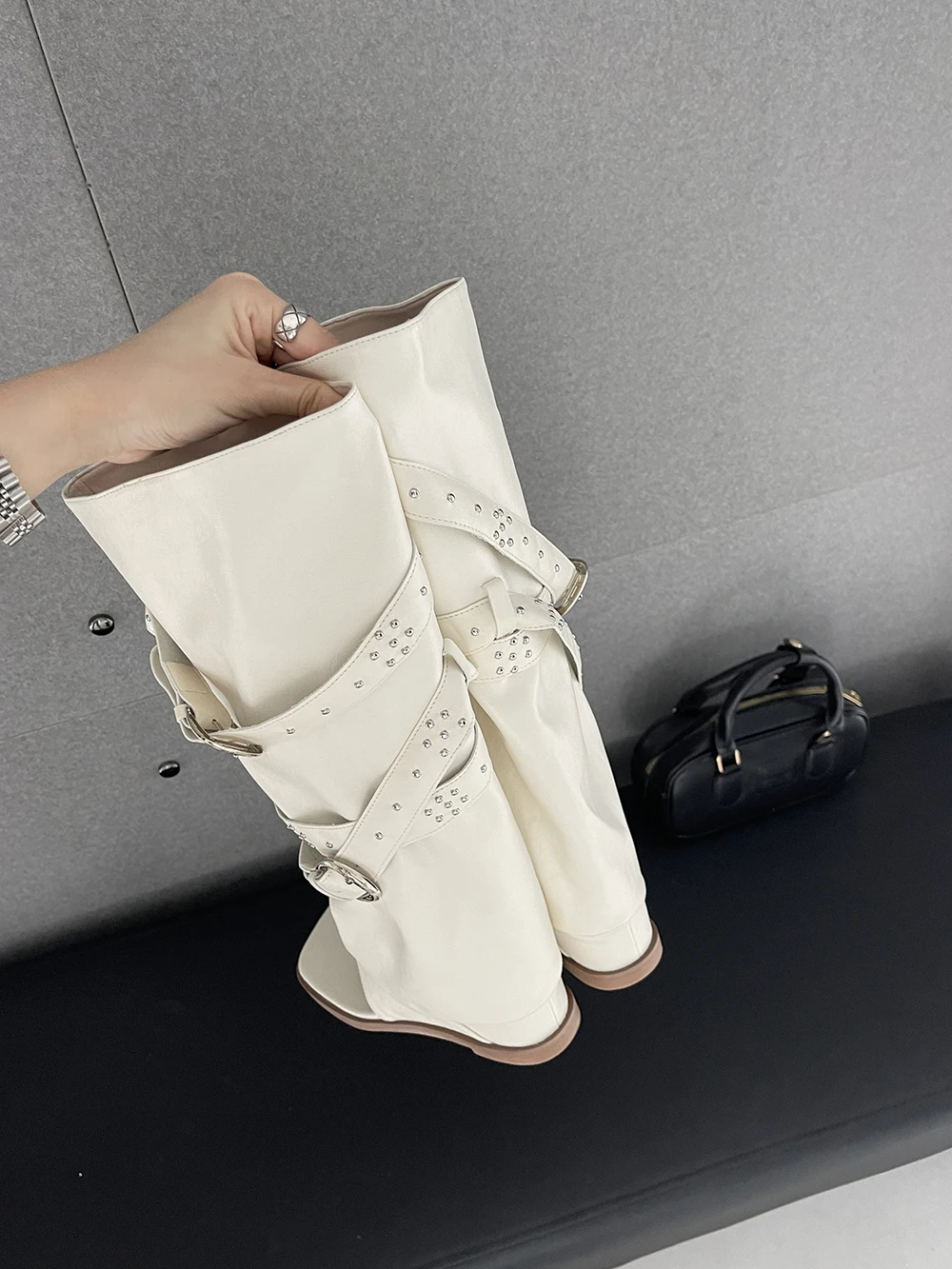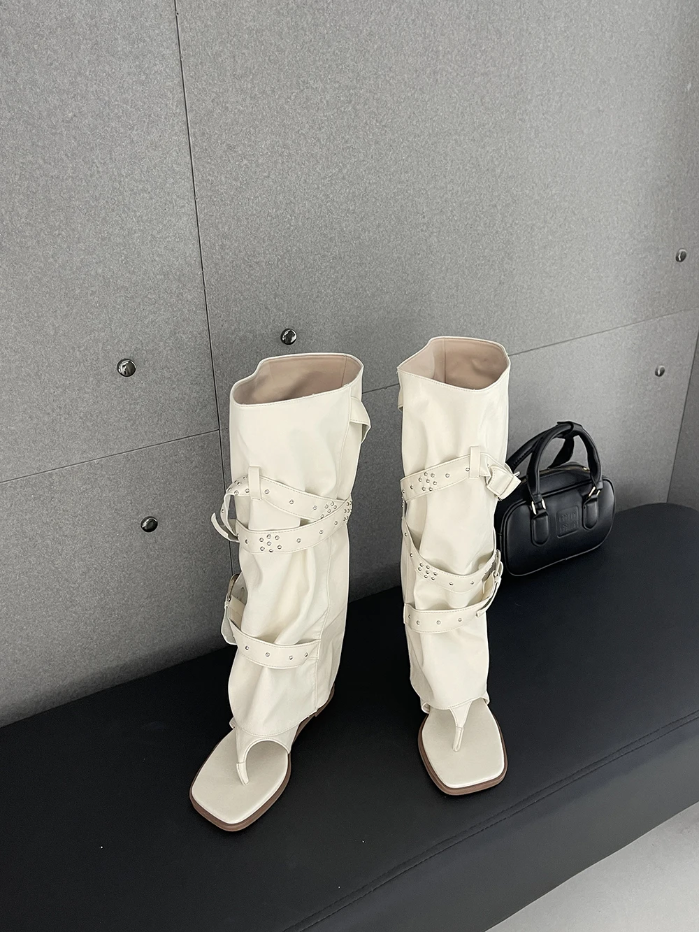 LBSFY - Clip Toe Women Knee High Heels Black White Rivet Design White Black Flat Low Heels Knight Heeled Side Zipper Fashion Party Pumps