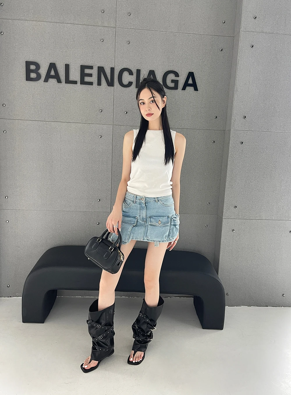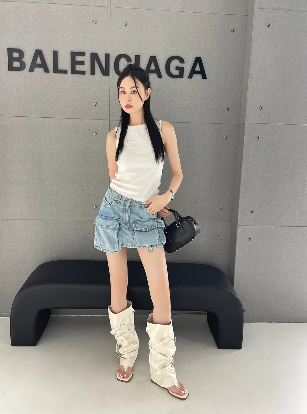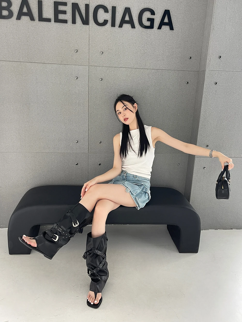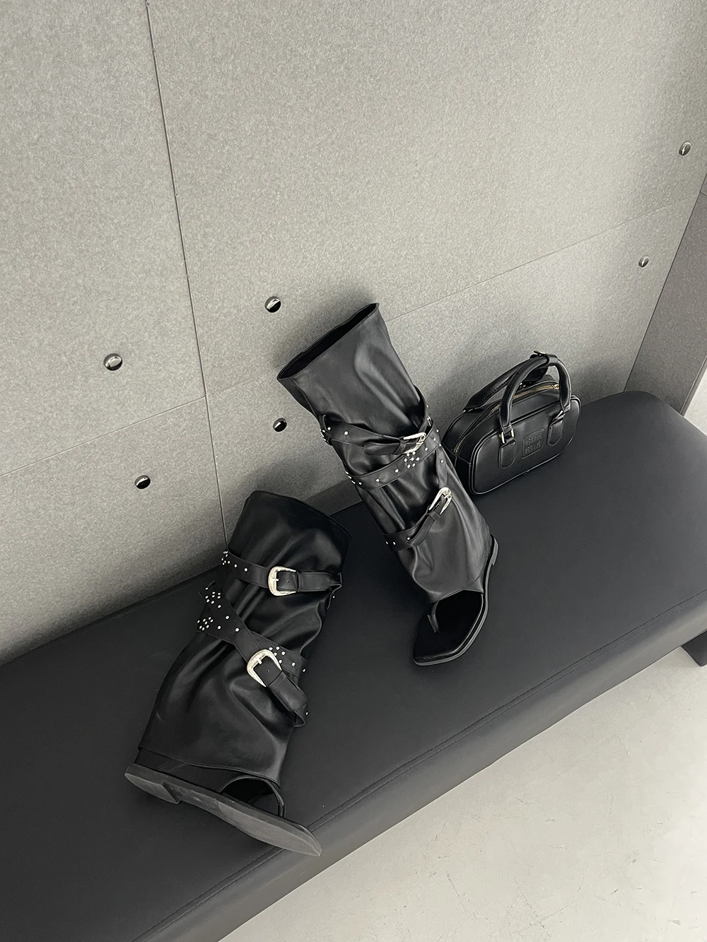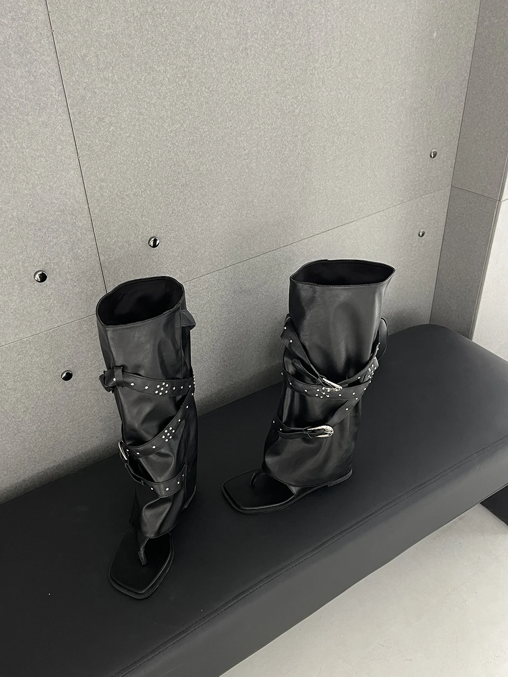 LBSFY - Clip Toe Women Knee High Heels Black White Rivet Design White Black Flat Low Heels Knight Heeled Side Zipper Fashion Party Pumps