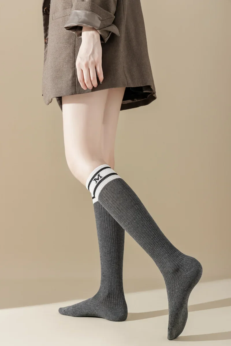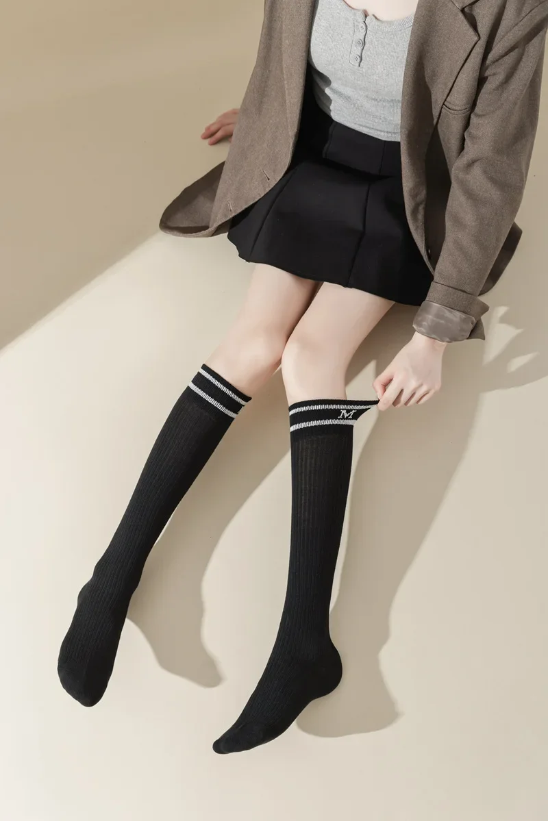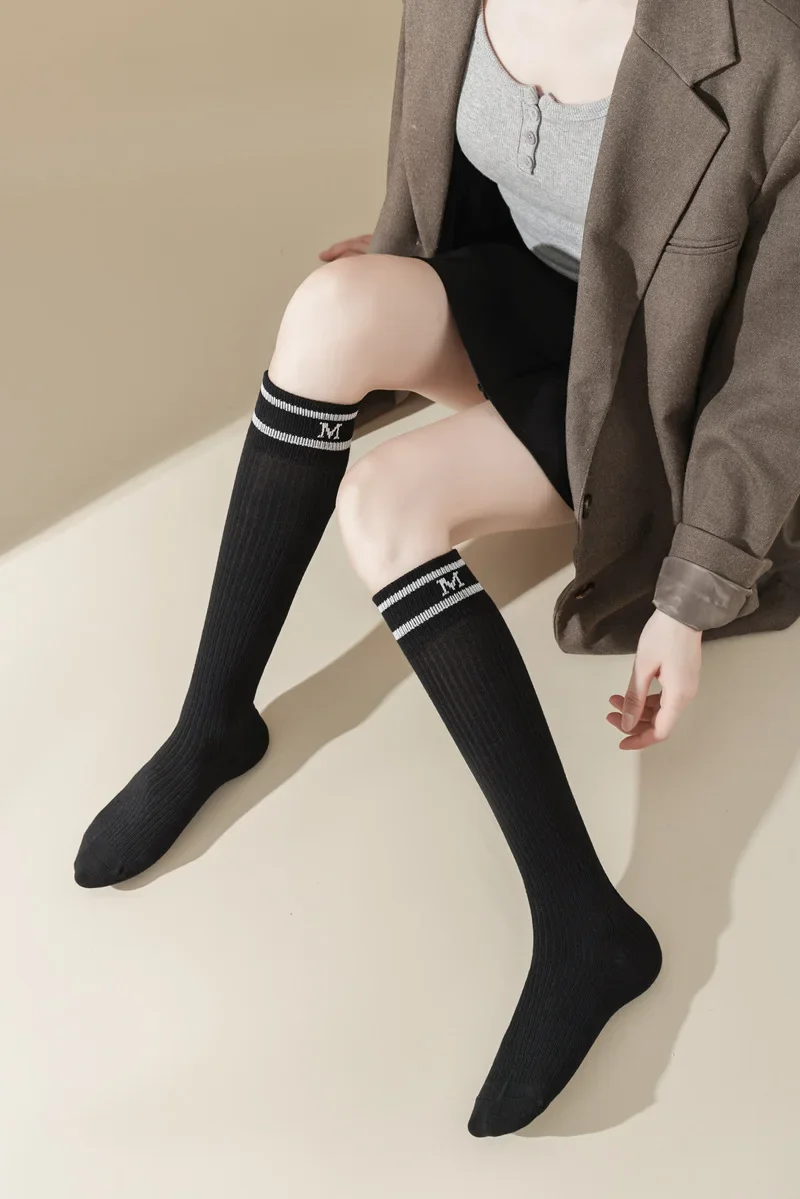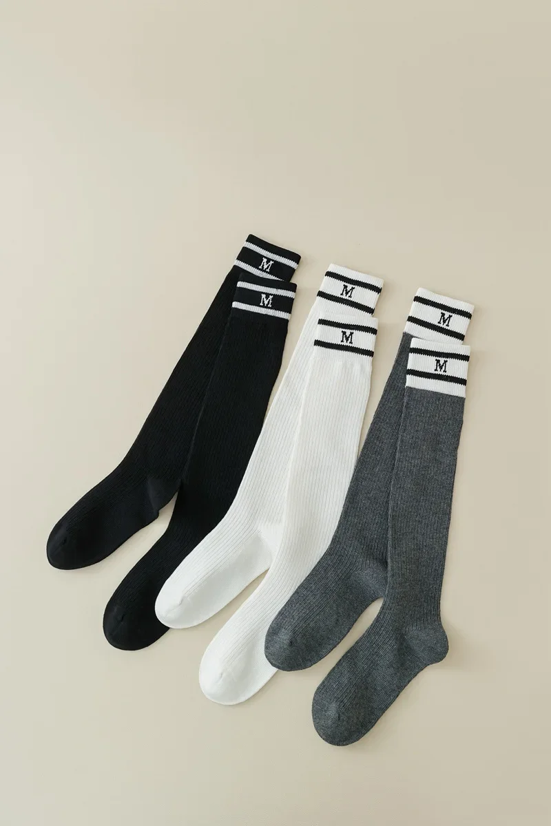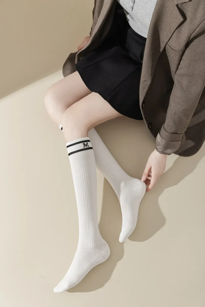 Lbsfy Cotton Women Stockings Japanese Style School Girls Long Socks Stocking Letter Embroidery Solid Color Black White Gray Knee Socks