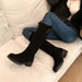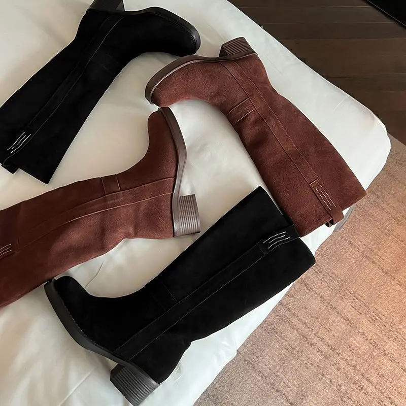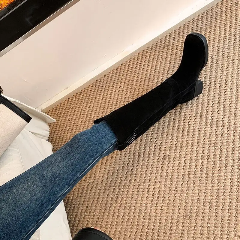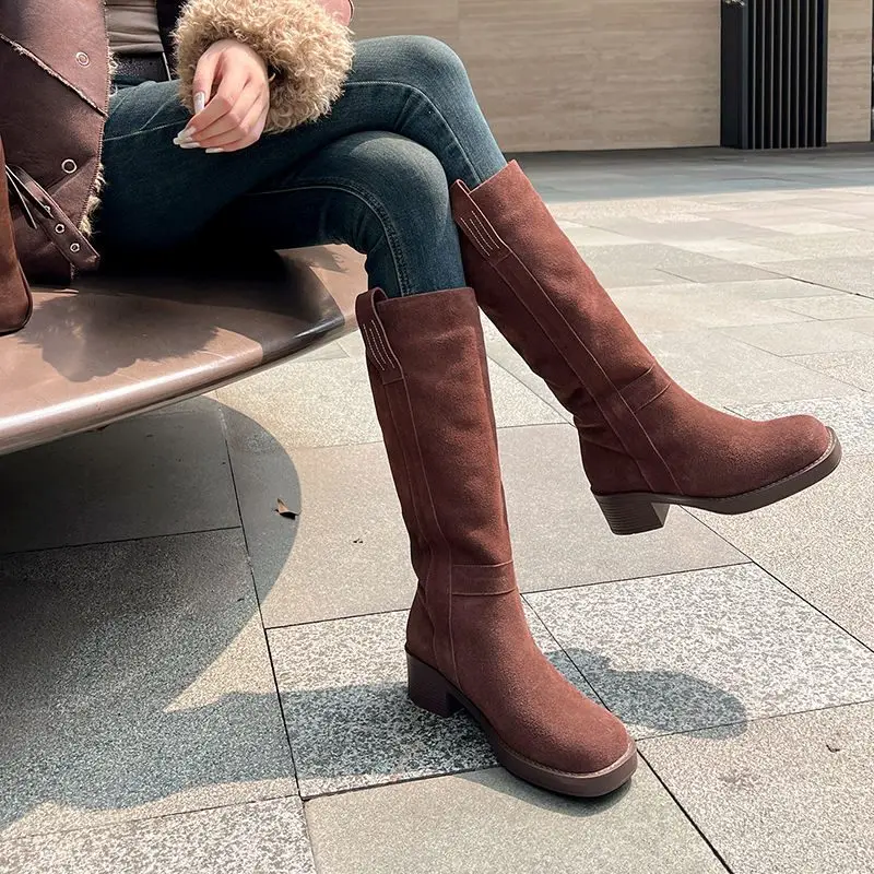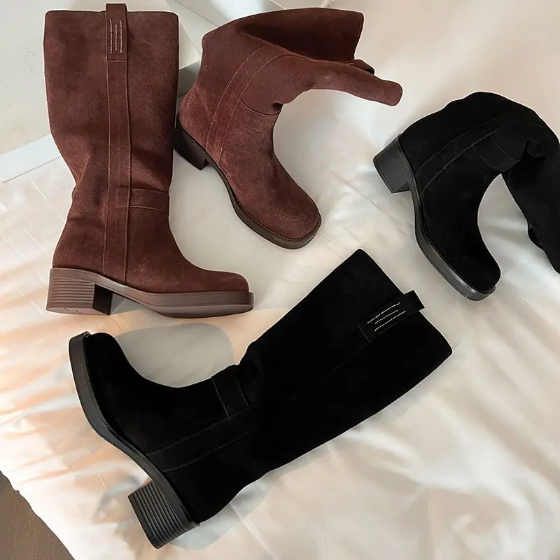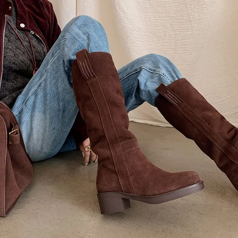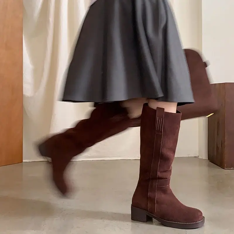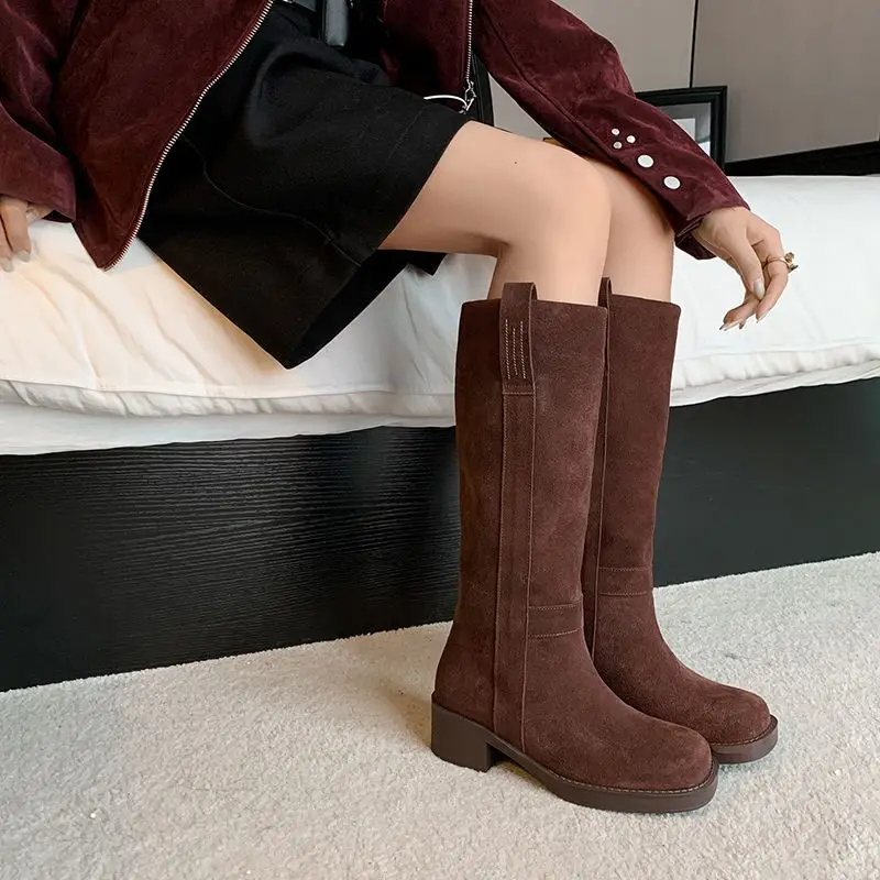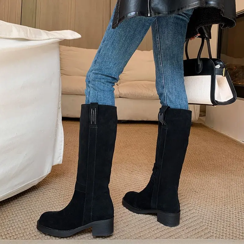 LBSFY - Cow Suede Knee High Boots Women Slip On Square Mid Heels Thick Fur Warm Winter Boots Handmade Retro Shoes