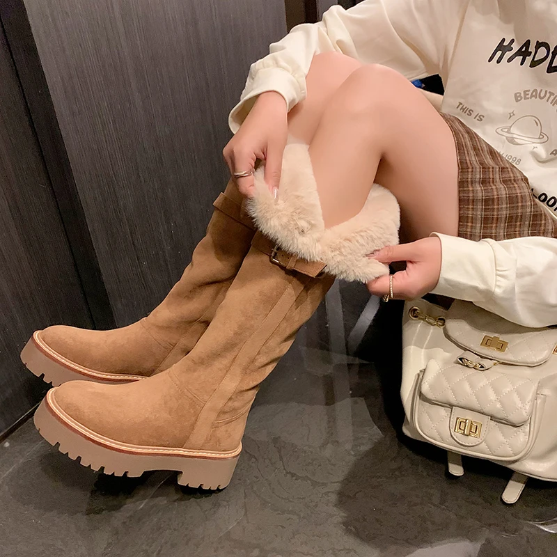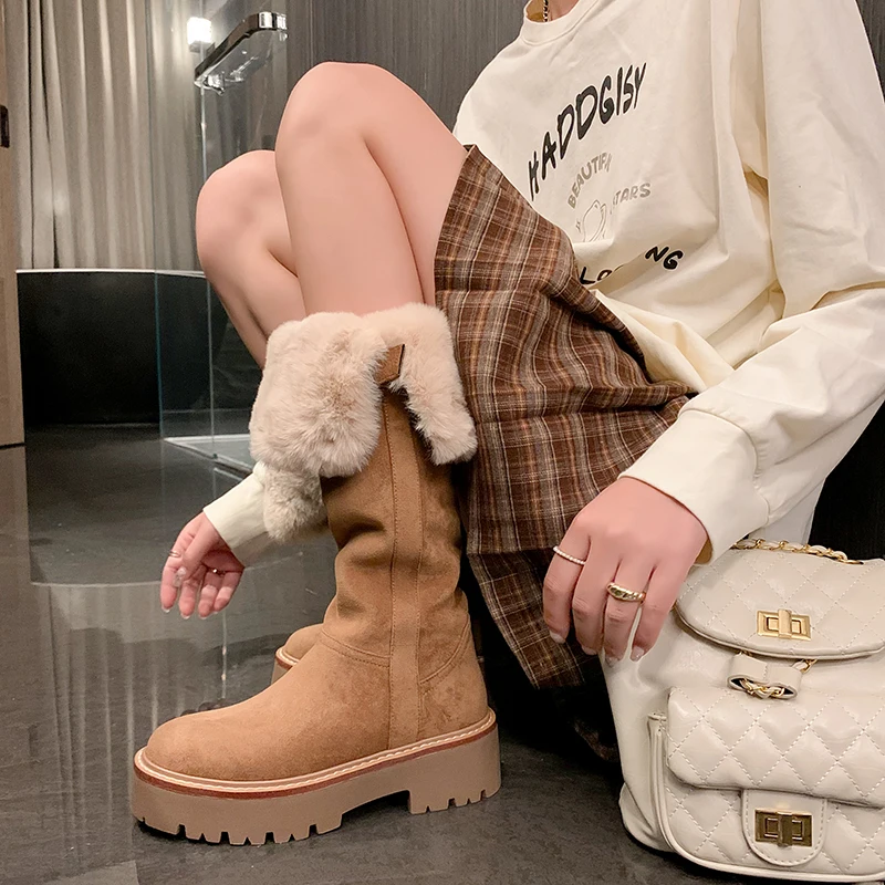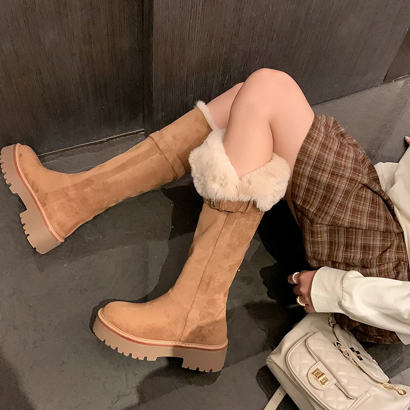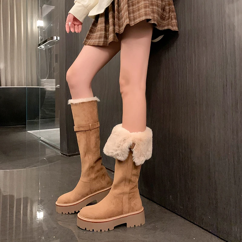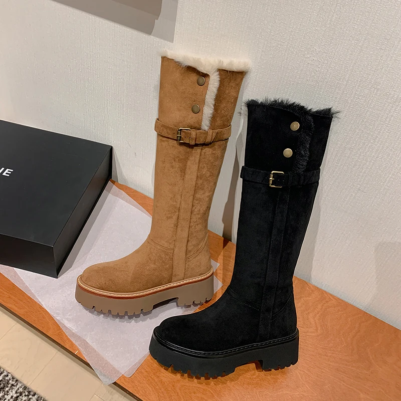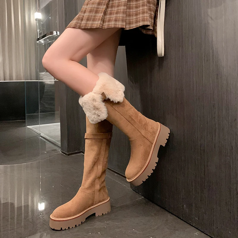 LBSFY - Cow Suede Leather Boots Women Slip On Wool Warm Winter Knee High Boots Handmade Ladies Platform Snow Boots Shoes