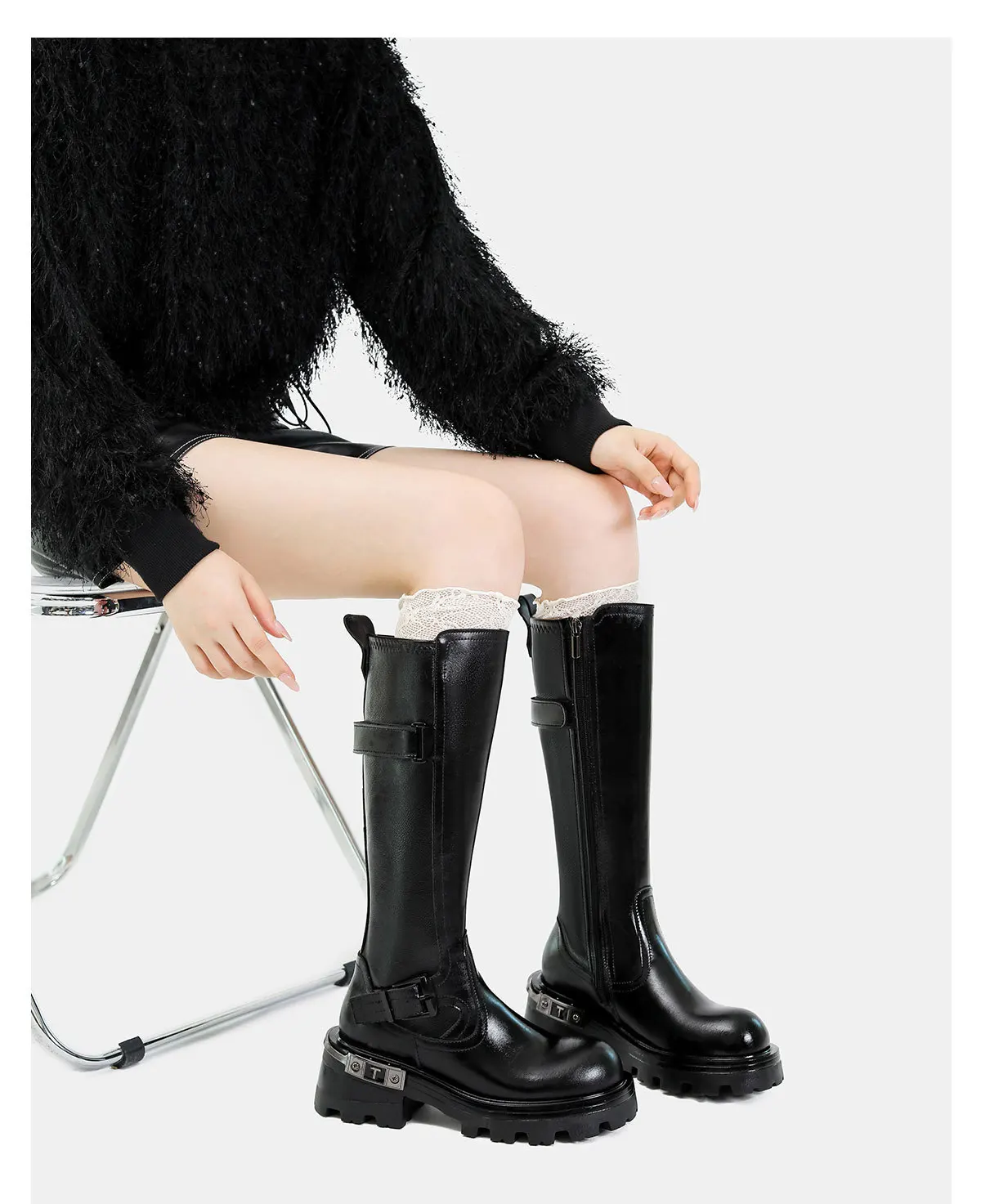 LBSFY  -  Denim Boots for Women Motorcycle Boots Retro Belt Buckle Round Head High Women Boots Ladies Platform Boot Shoes for Women