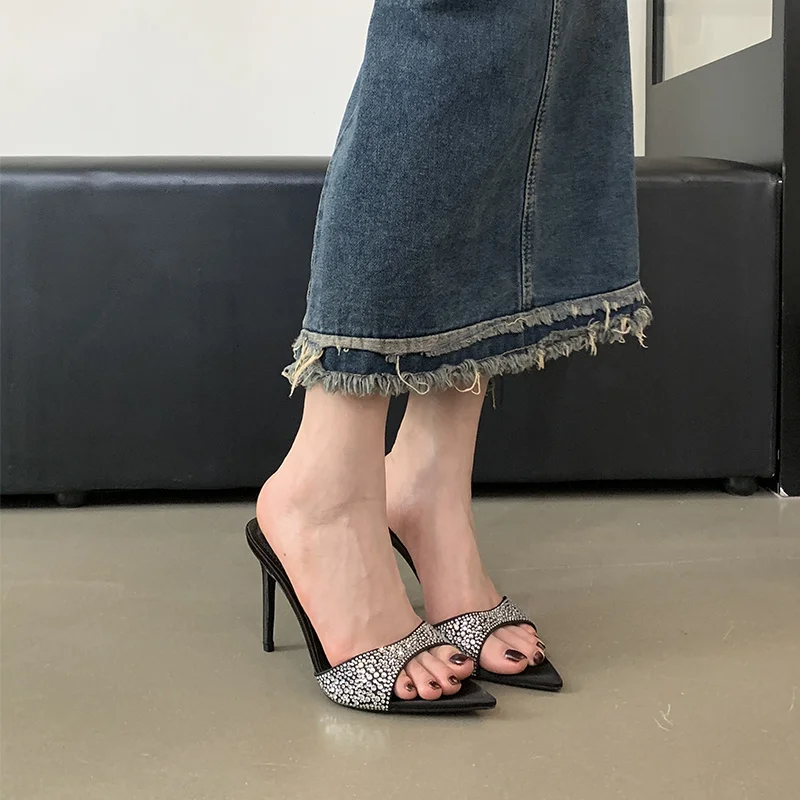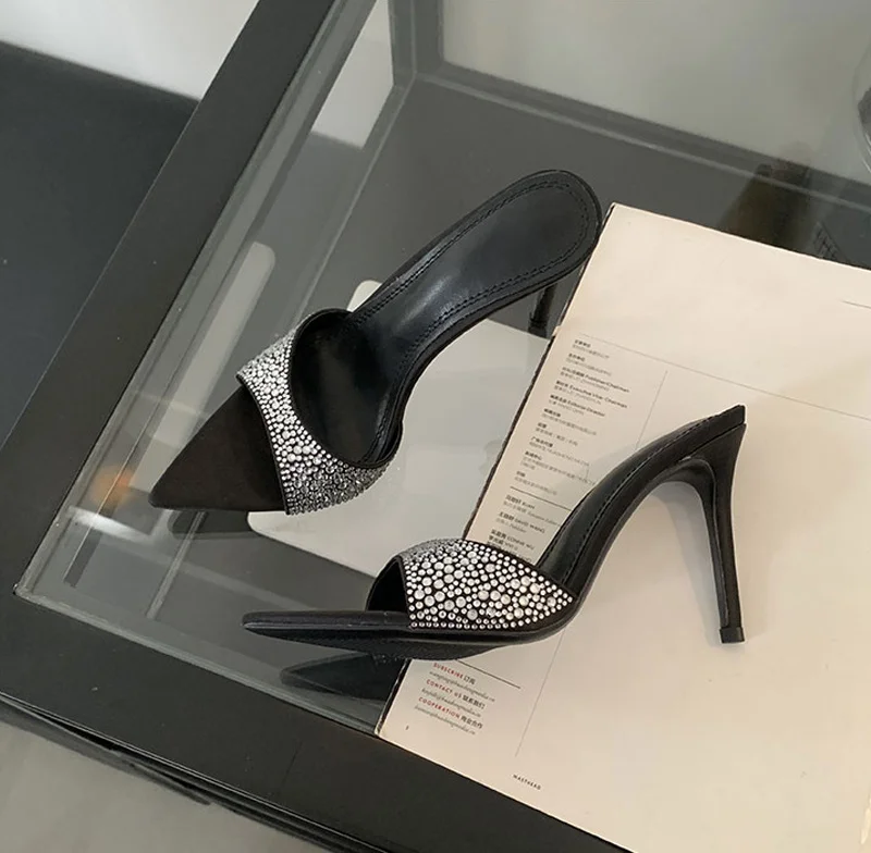 LBSFY - Designer Crystal Rhinestone High Heels Slippers For Woman Sexy Leopard Print Pointed Toe Dress Party Shoes Mules Slides
