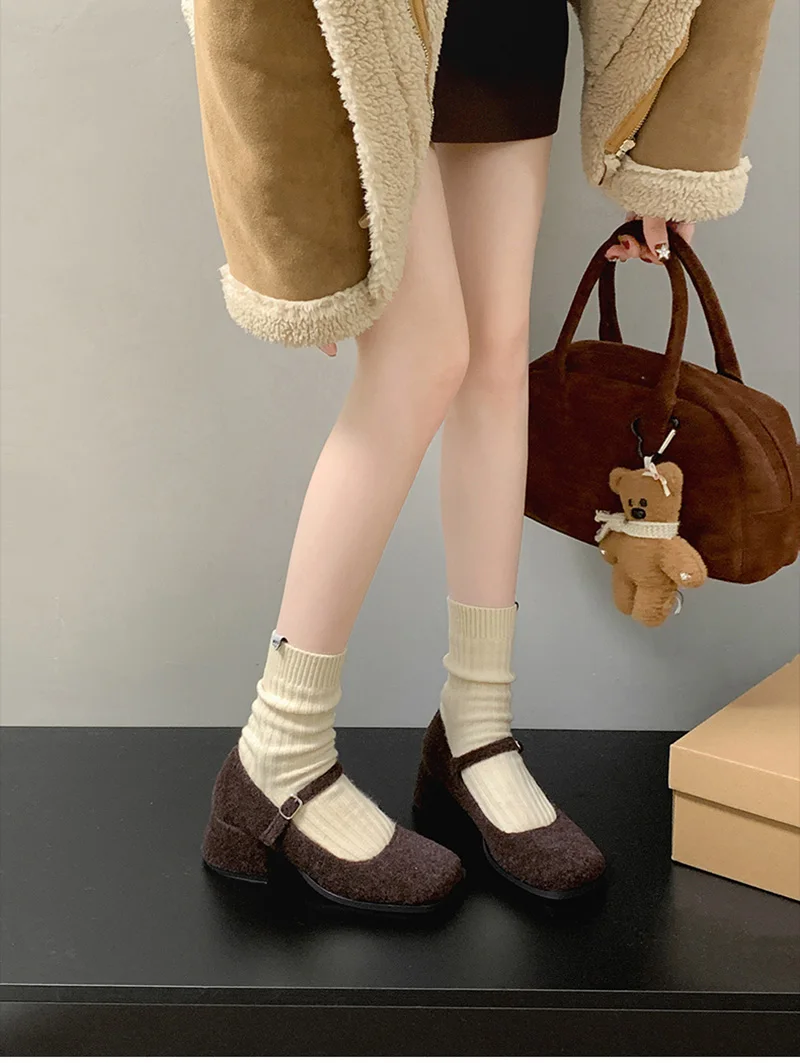 LBSFY - Designer Spring Square Toe Women Lamb Wool Mary Jane Shoes Fashion Shallow Thick Heel Shoes Concise Outdoor Lady Shoes
