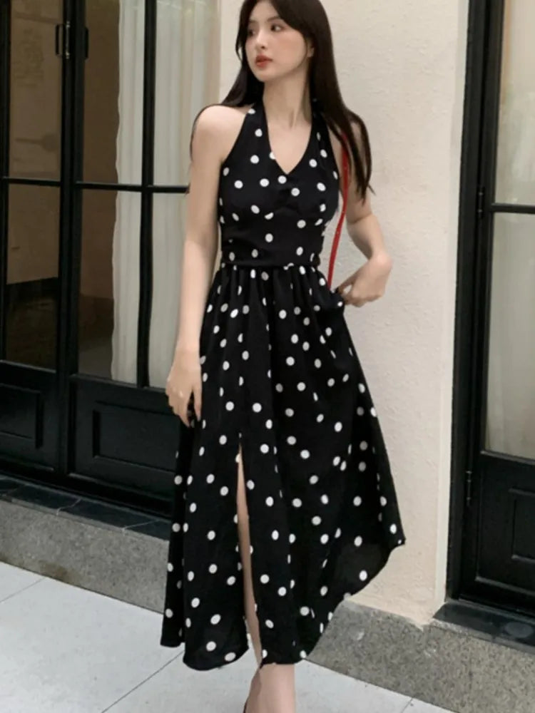 LBSFY -Dot Chic Retro Elegant French Style Polka Sling Dresses Bow Backless Slim Waist Halter-neck Split Dress Spring Summer 2025 New