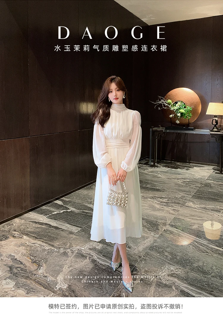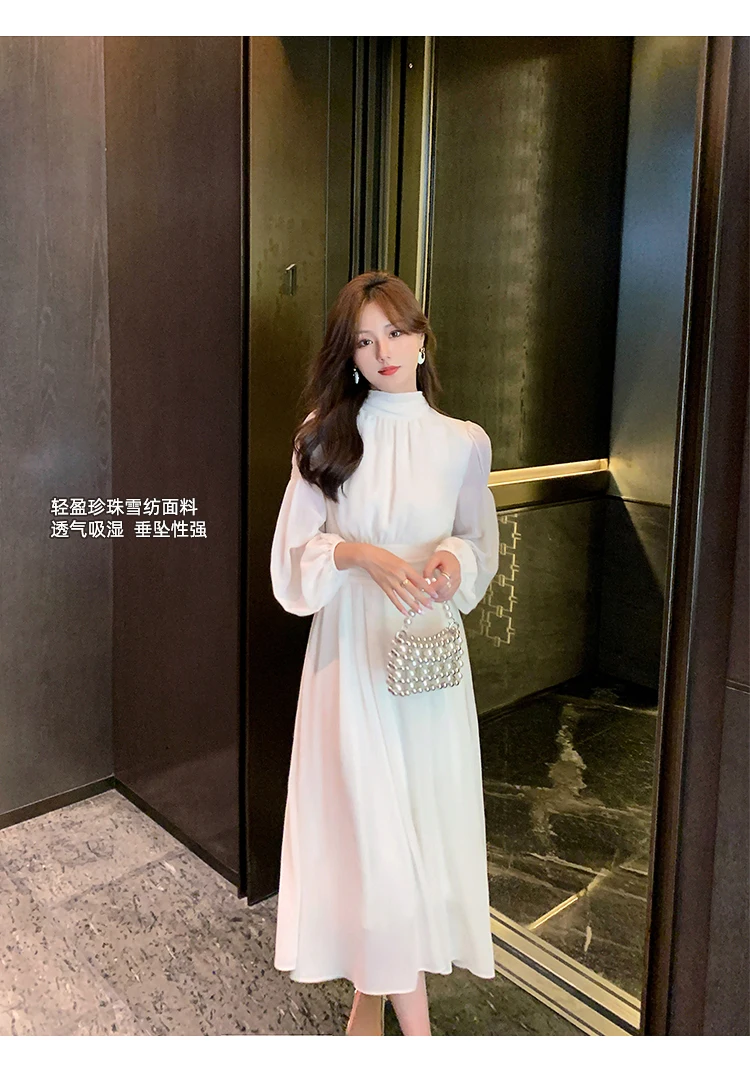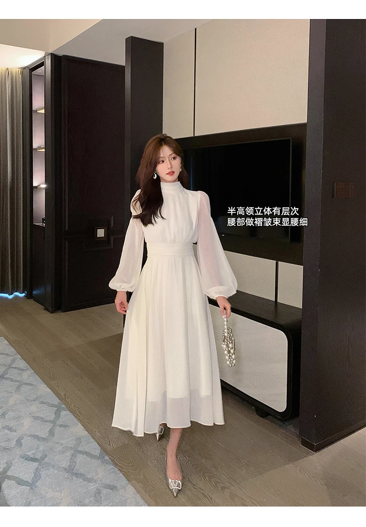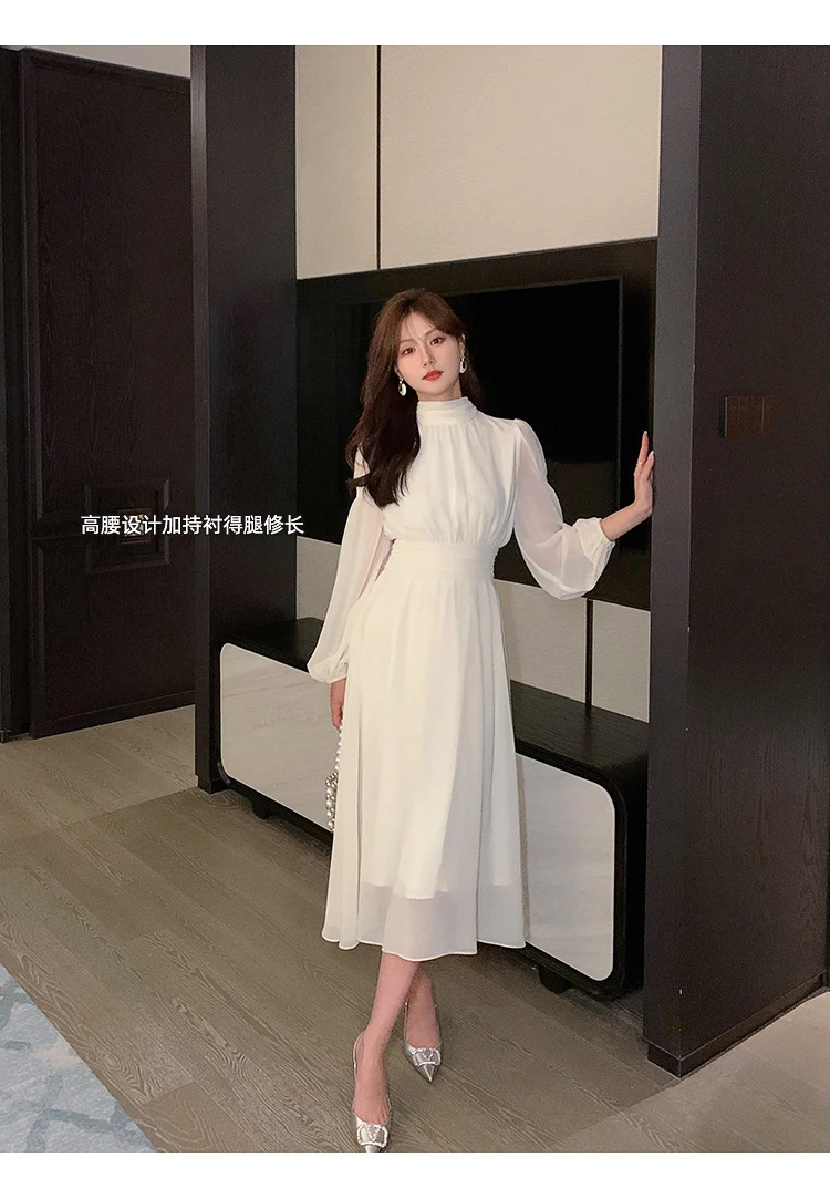 LBSFY -Elegant Long Sleeve Evening Dresses for Women Autumn Slim Lace Up A-Line Party Prom White Dress Autumn French Female Clothes New