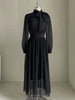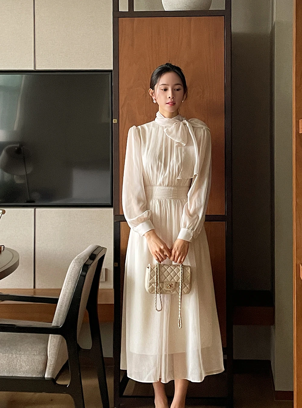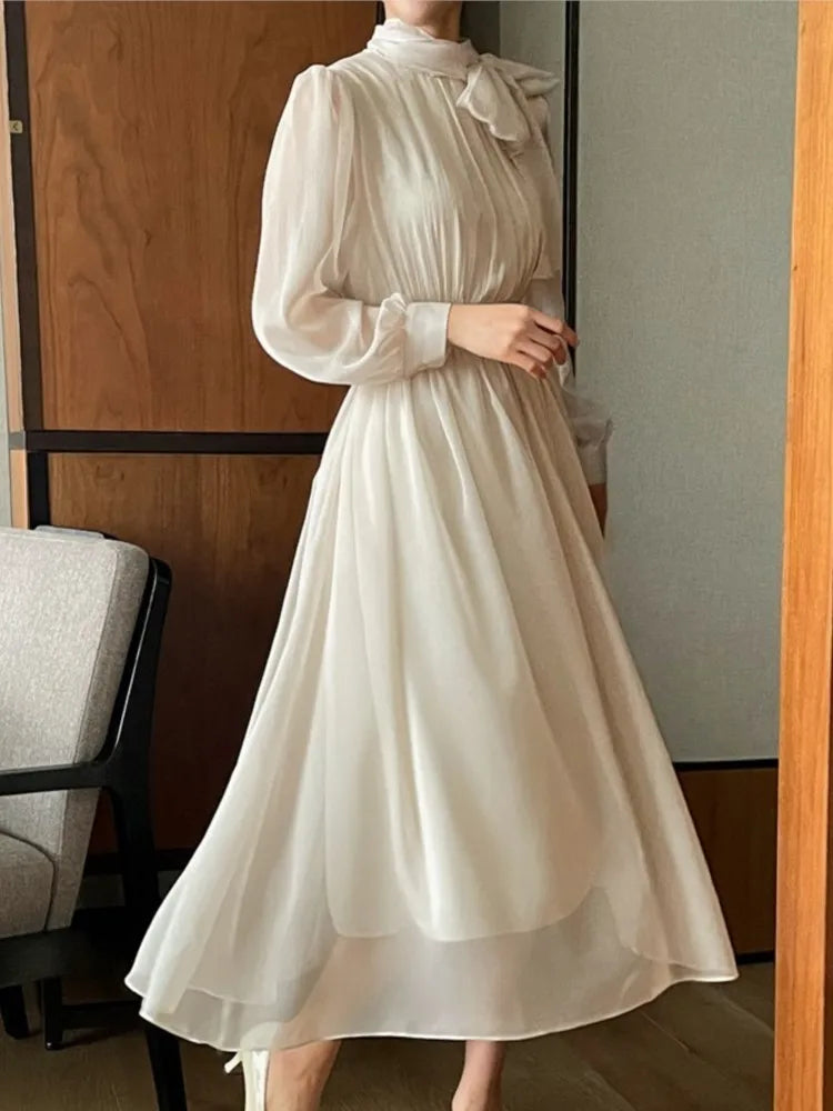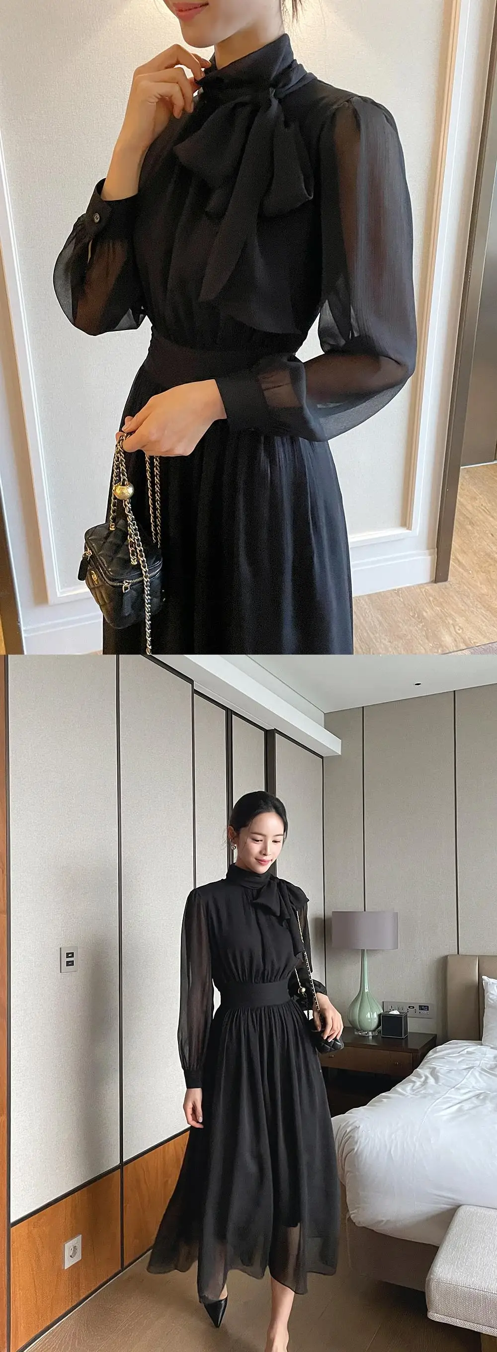 LBSFY -Elegant Midi Dresses for Women Korean Long Sleeves Half High Collar Lace-up A-line One Piece Vestido Mujer Autumn Fashion New