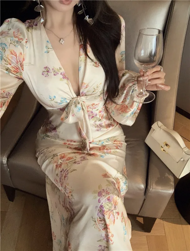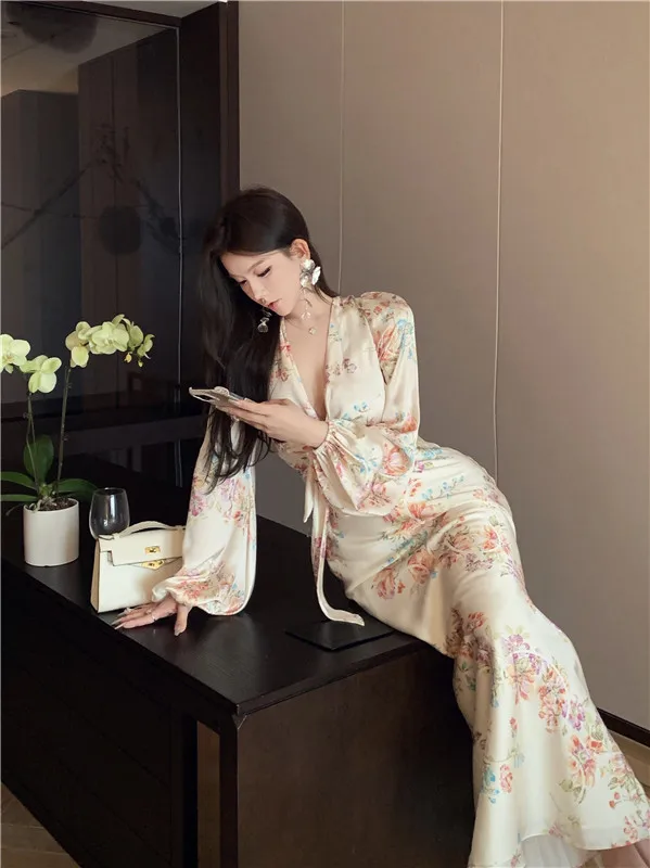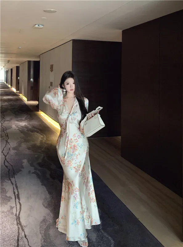 LBSFY -Elegant Sexy Bodycon Floral Long Dresses for Women Lantern Sleeve V-neck Slim Mermaid Evening Party Dress Prom Robe New Vestidos