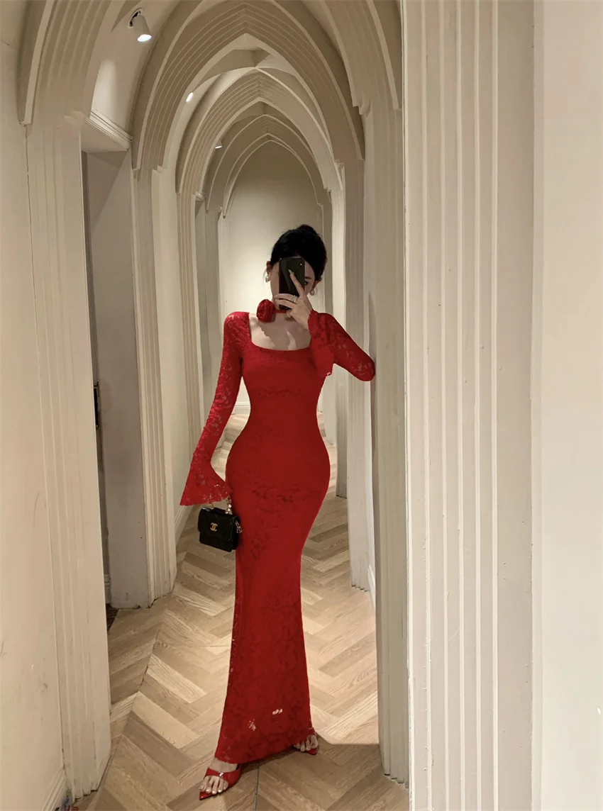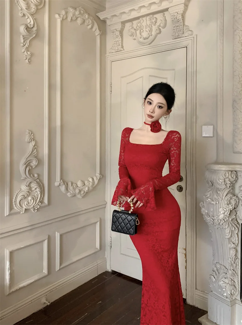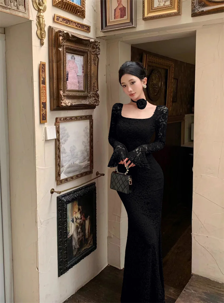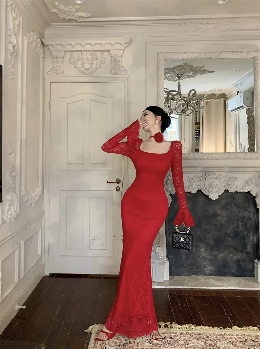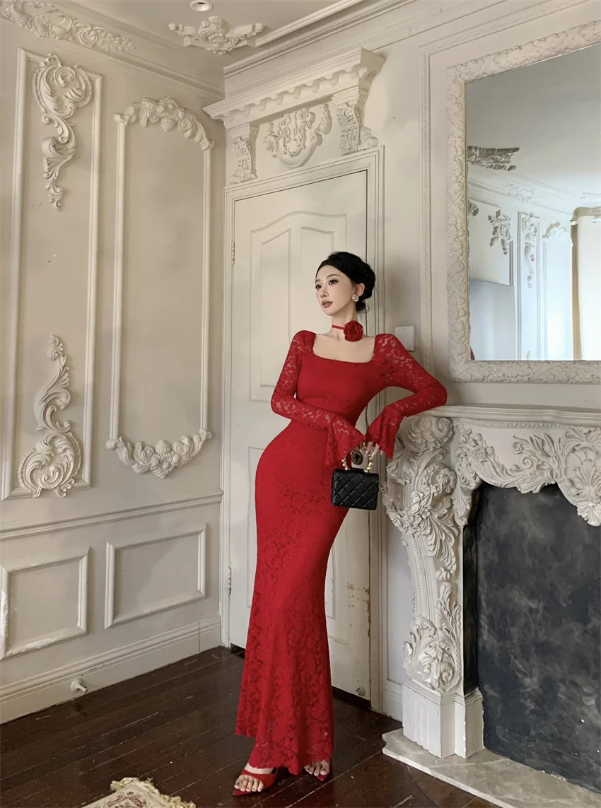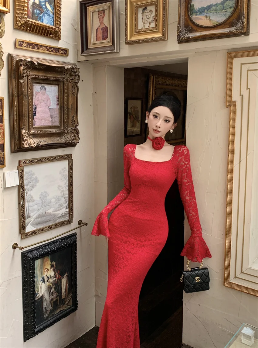 LBSFY -Elegant Tie Flowers Solid Evening Dresses Square Collar Flare Sleeve Lace Mermaid Long Dress Slim Party Vestidos Women's Clothes