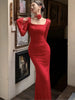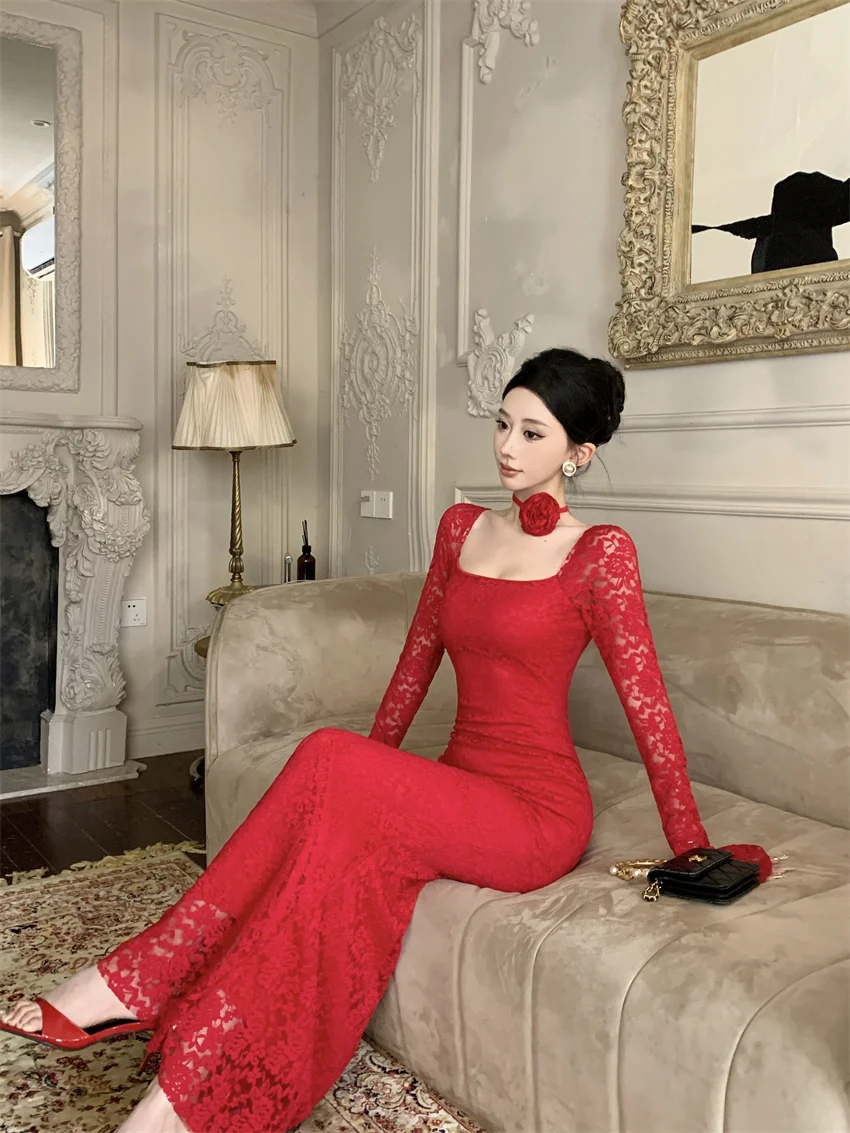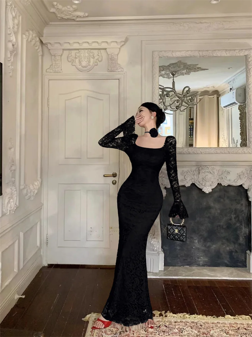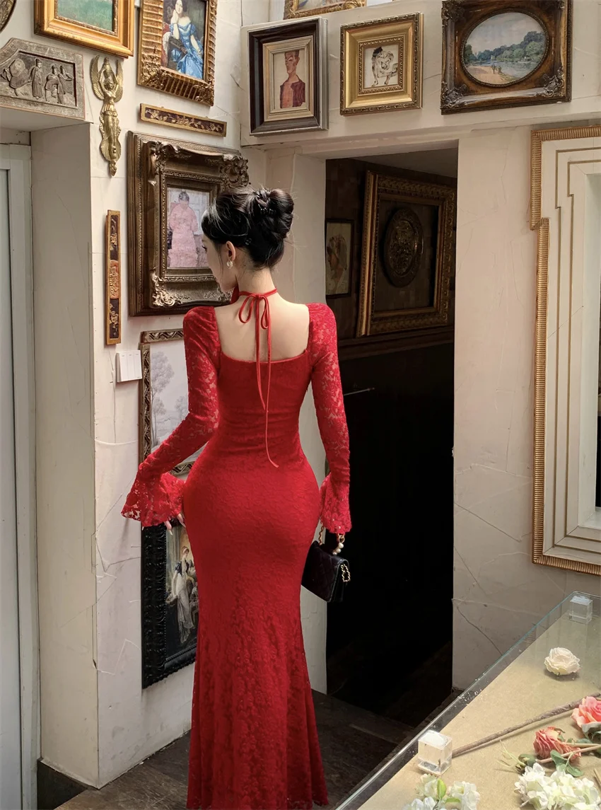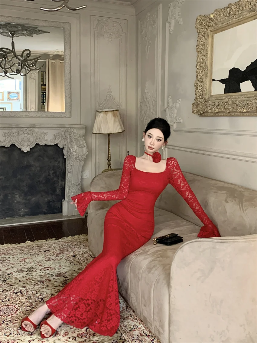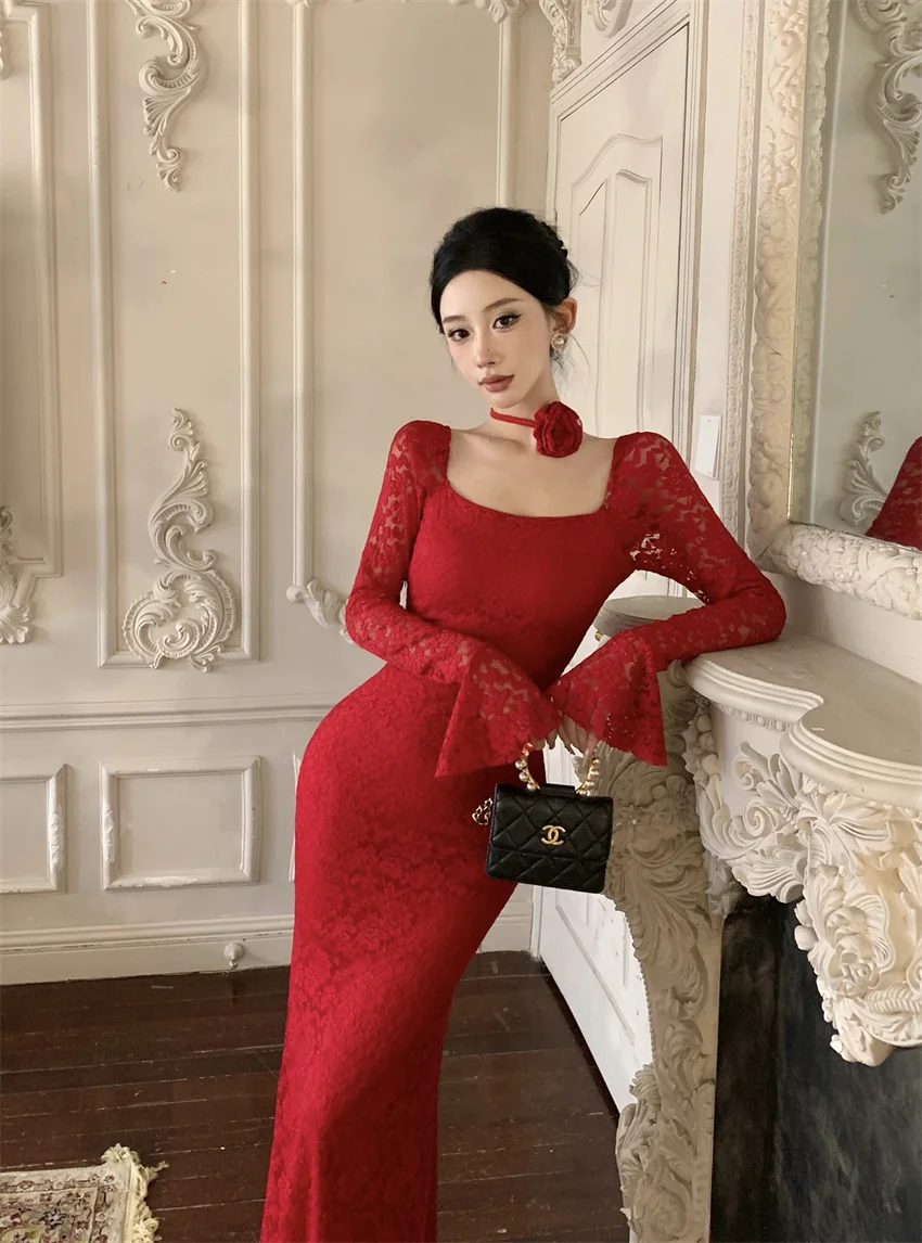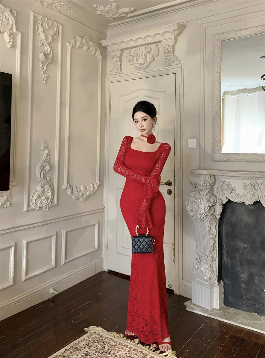 LBSFY -Elegant Tie Flowers Solid Evening Dresses Square Collar Flare Sleeve Lace Mermaid Long Dress Slim Party Vestidos Women's Clothes
