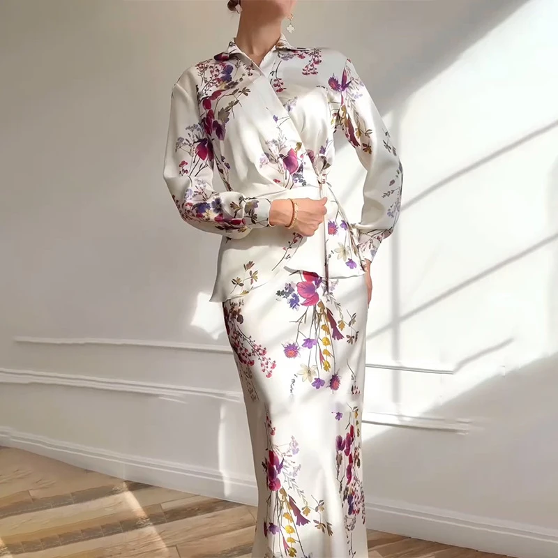 LBSFY  -  Elegant V-neck Lace-up Tops & Long Skirts Suits Women Casual Long Sleeve Slim Bohe Party Outfits Fashion Floral Printed 2Pc Sets