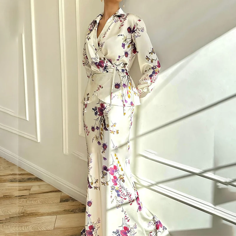 LBSFY - Elegant V-neck Lace-up Tops & Long Skirts Suits Women Casual Long Sleeve Slim Bohe Party Outfits Fashion Floral Printed 2Pc Sets