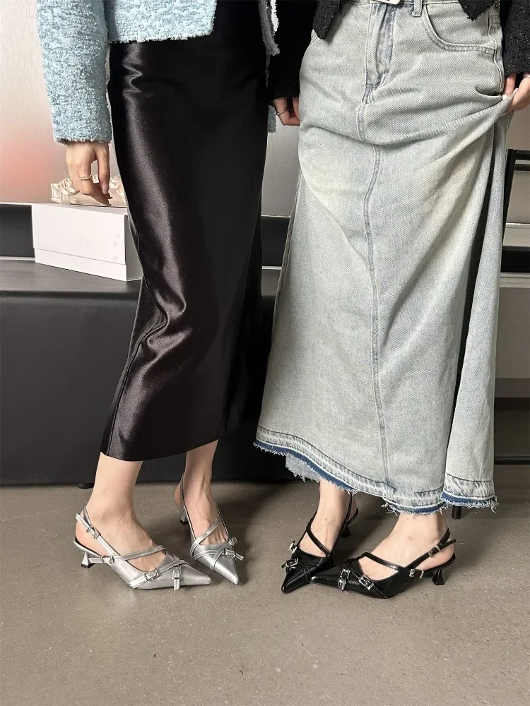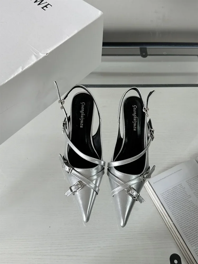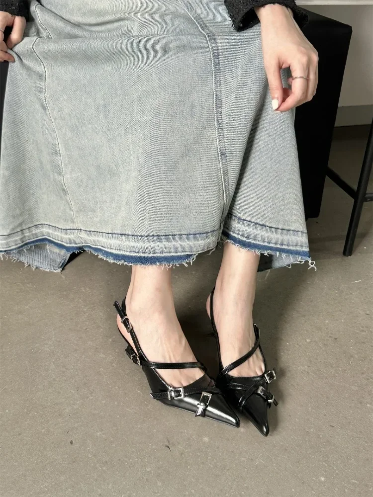 Lbsfy Fashion Belt Buckle Design Slingback Low Heel Sandals Women Sexy Pointed Toe Thin High Heels Summer Elegant Party Dress Shoes