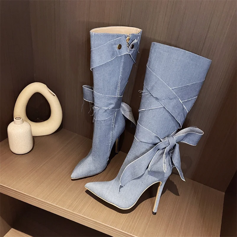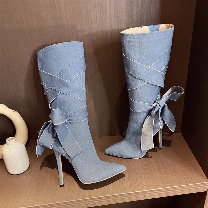 LBSFY - Fashion Design Blue Denim Butterfly Knot Women Knee High Boots Sexy Pointed Toe Stiletto Heels Party Shoes Zip Booties