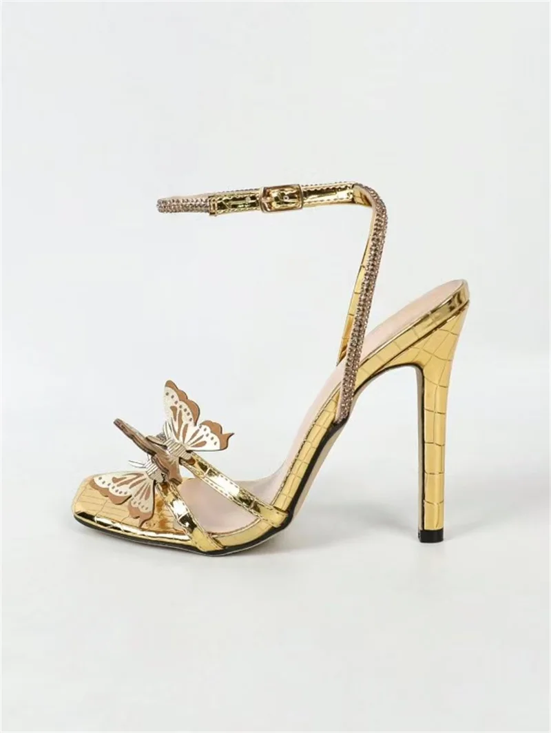 LBSFY -Fashion Design Crystal Rhinestone Ankle Strap Sandals Women Sexy Square Toe Party Stripper Shoes Gold High Heels Sandalias