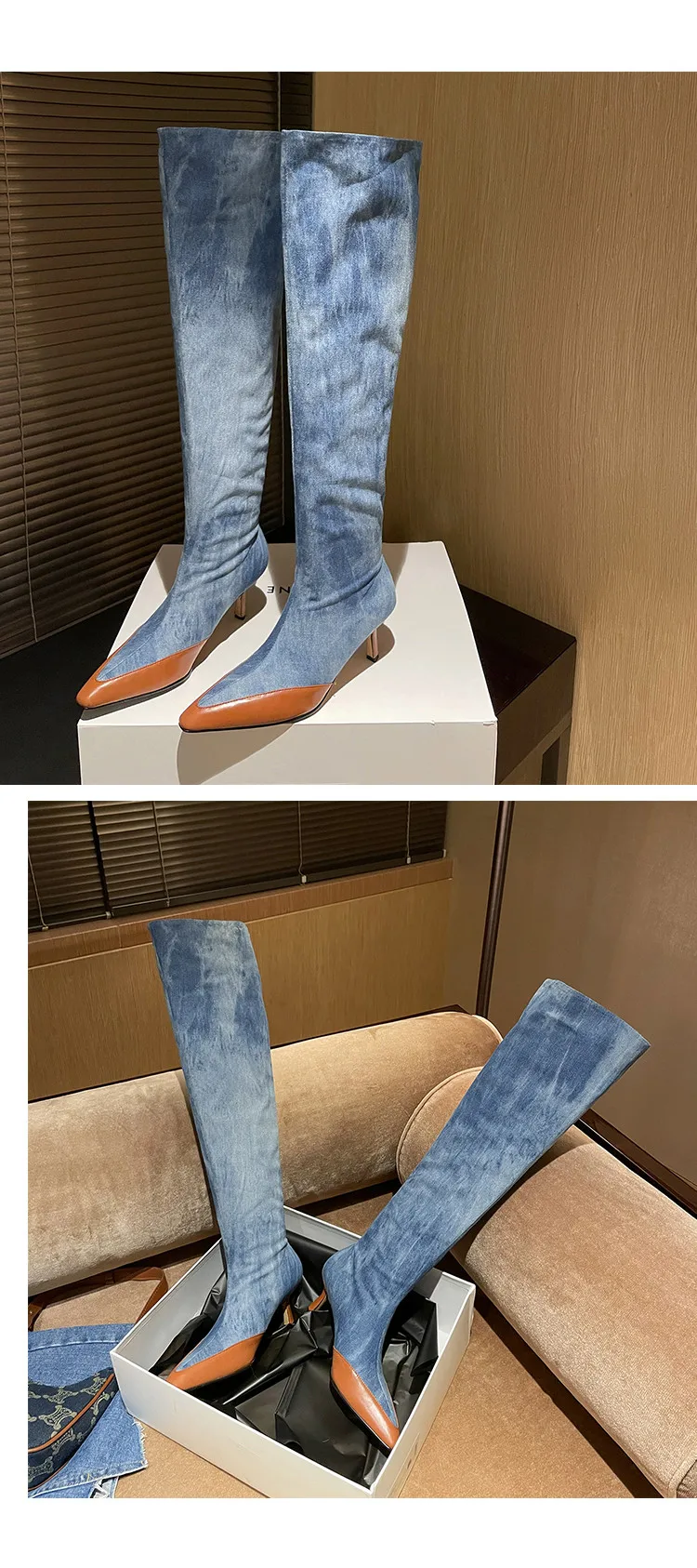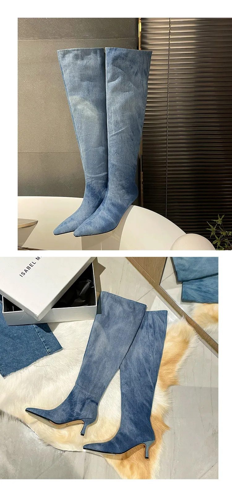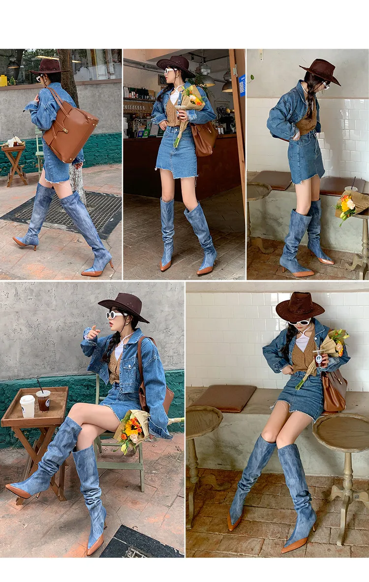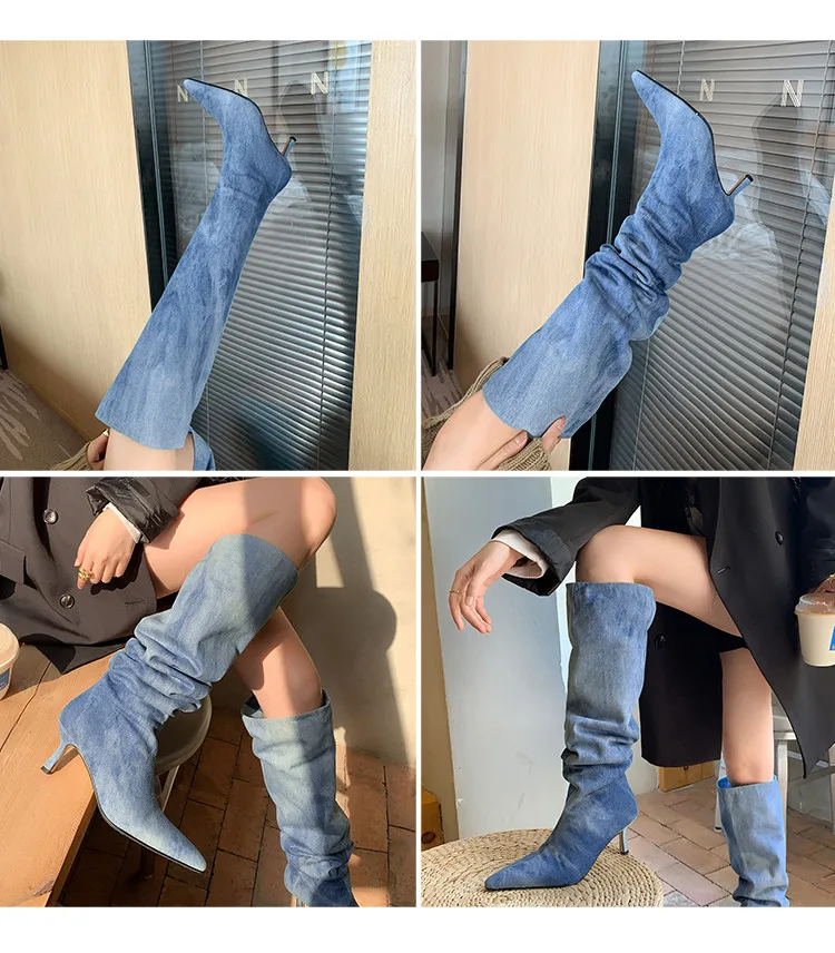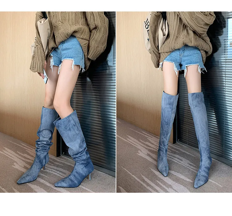LBSFY - Fashion Knee-High Women Boots New High Quality Denim Boots Pointed Toe Wide Tube High Heel High Boots Street Hot Girl