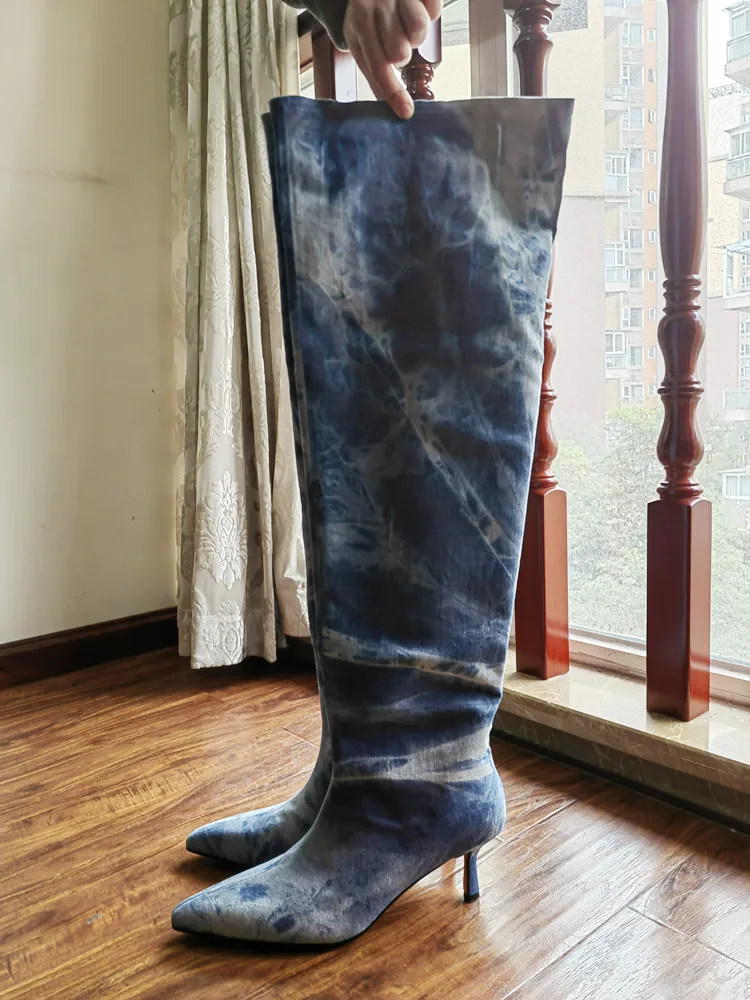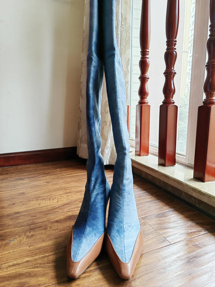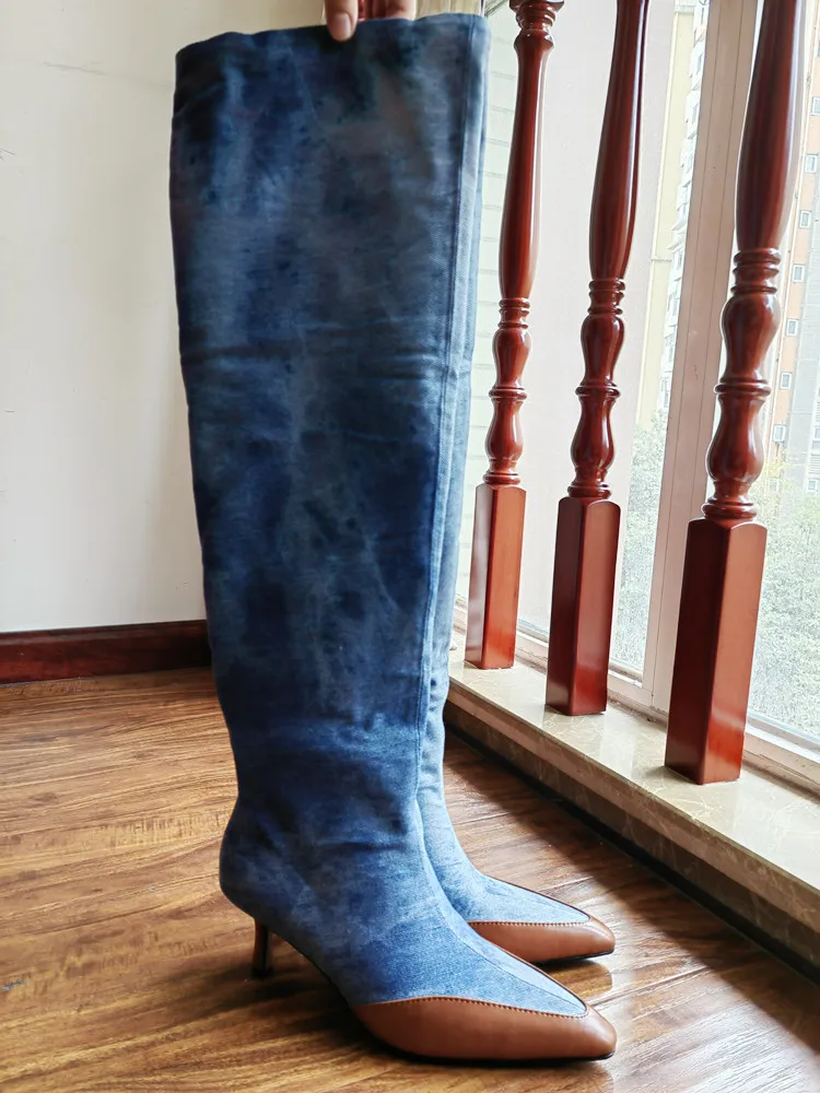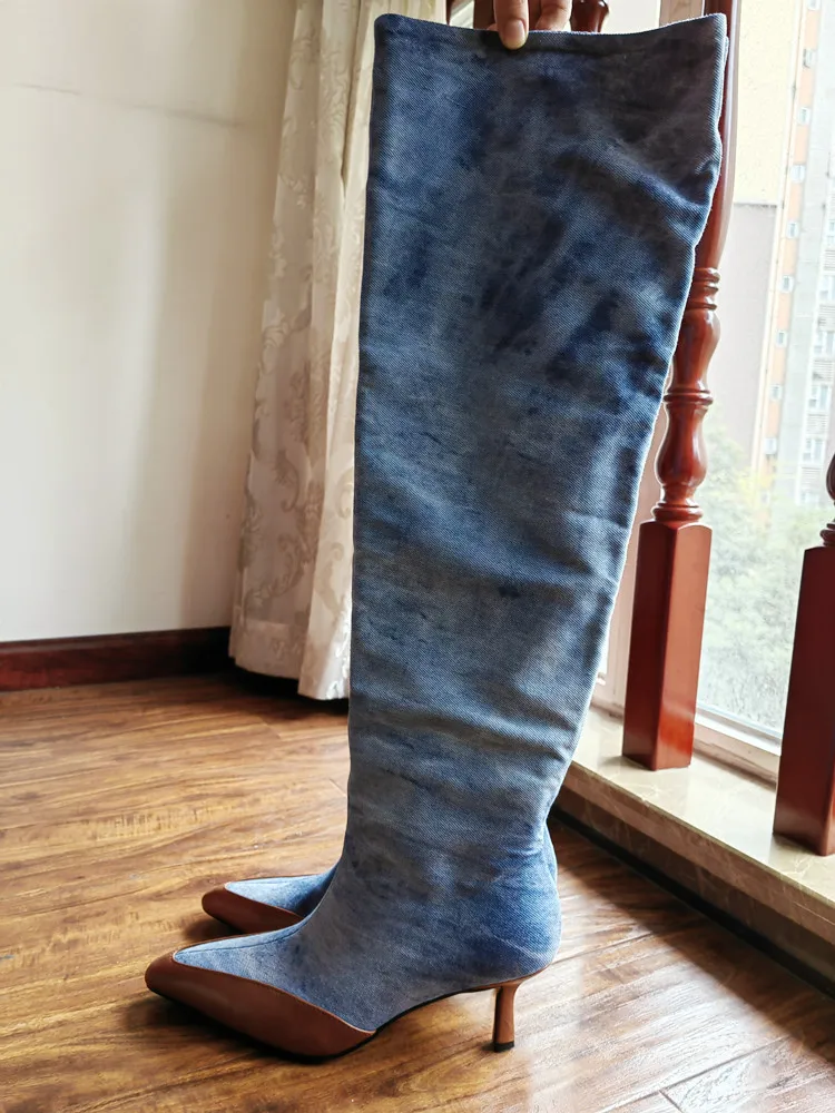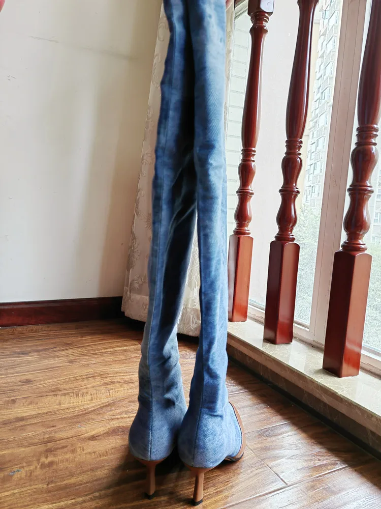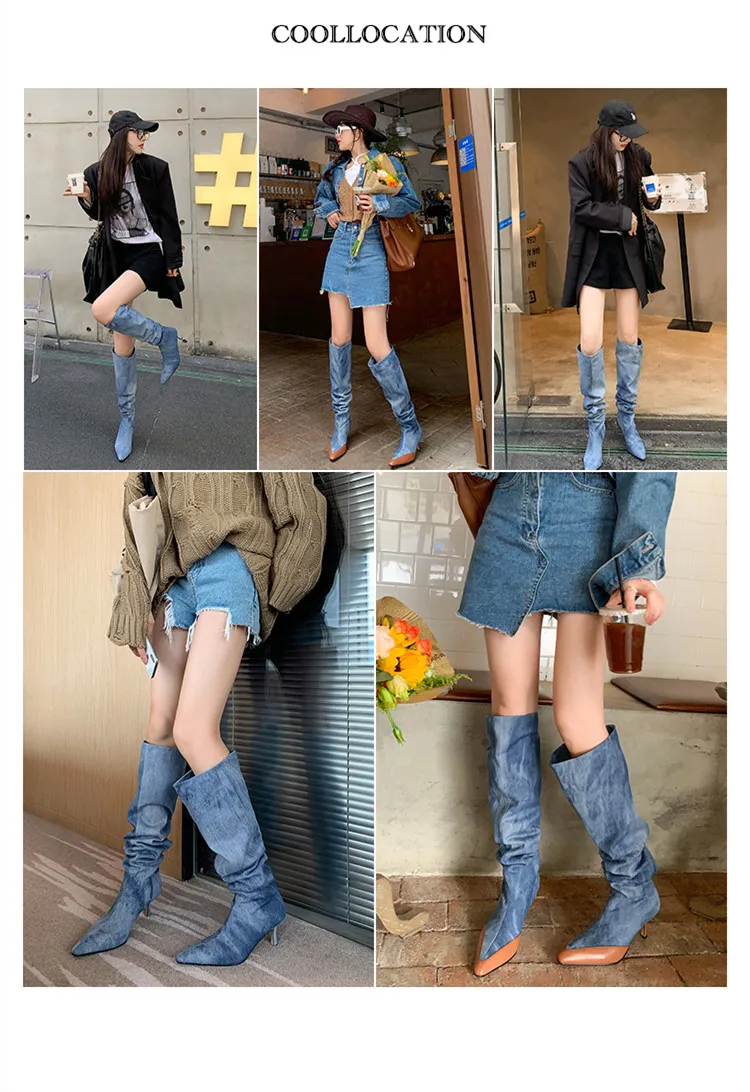 LBSFY - Fashion Knee-High Women Boots New High Quality Denim Boots Pointed Toe Wide Tube High Heel High Boots Street Hot Girl
