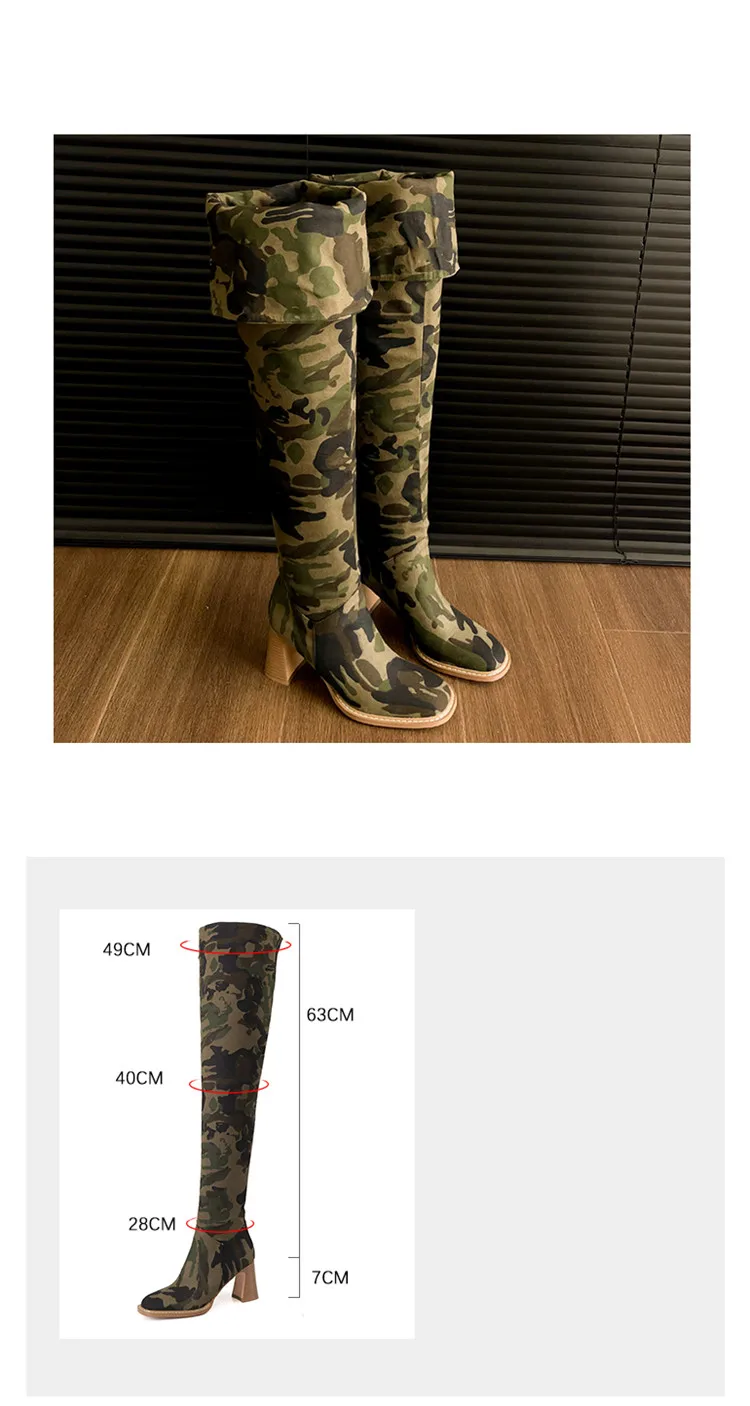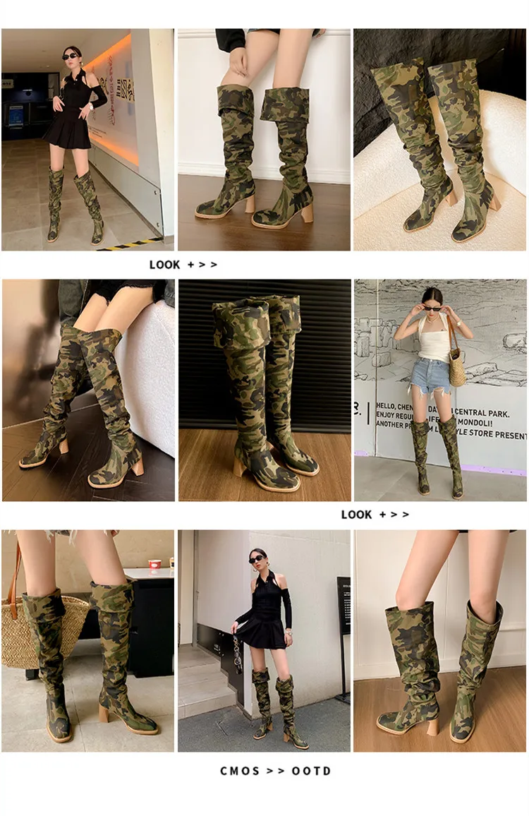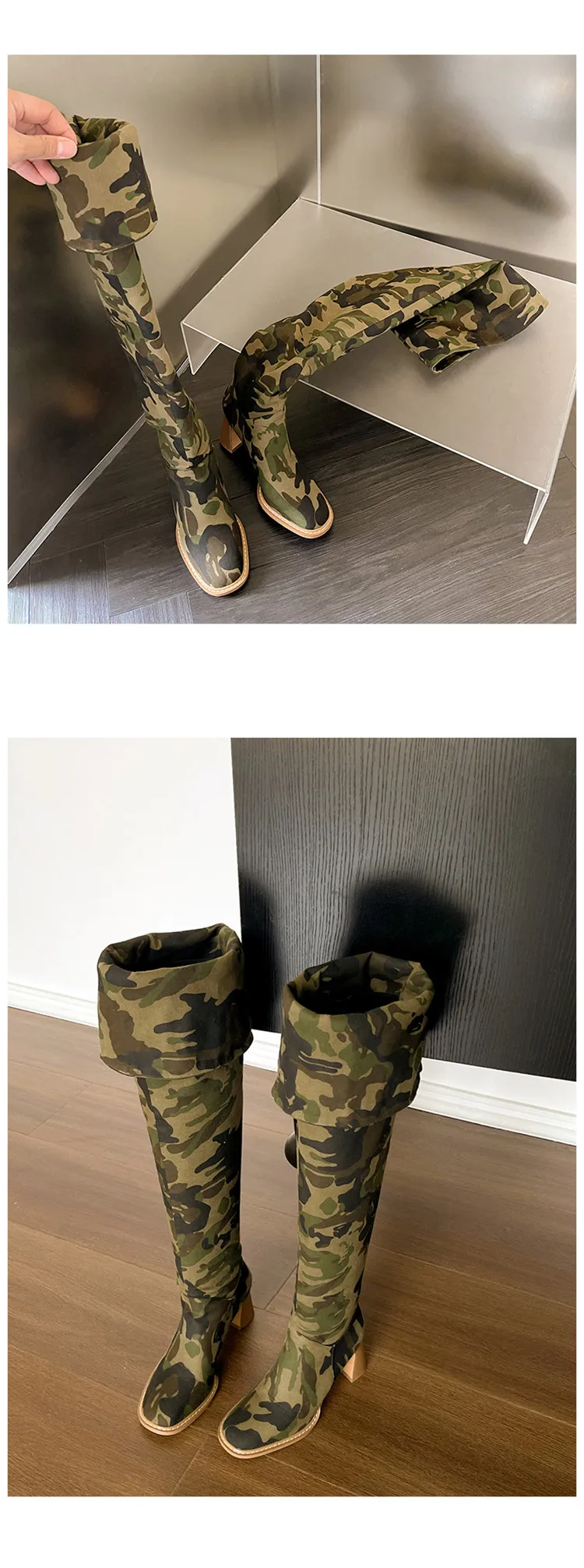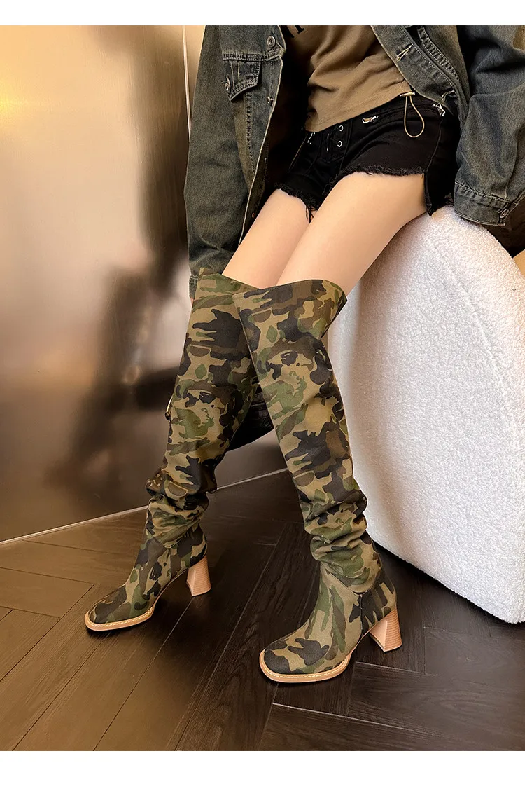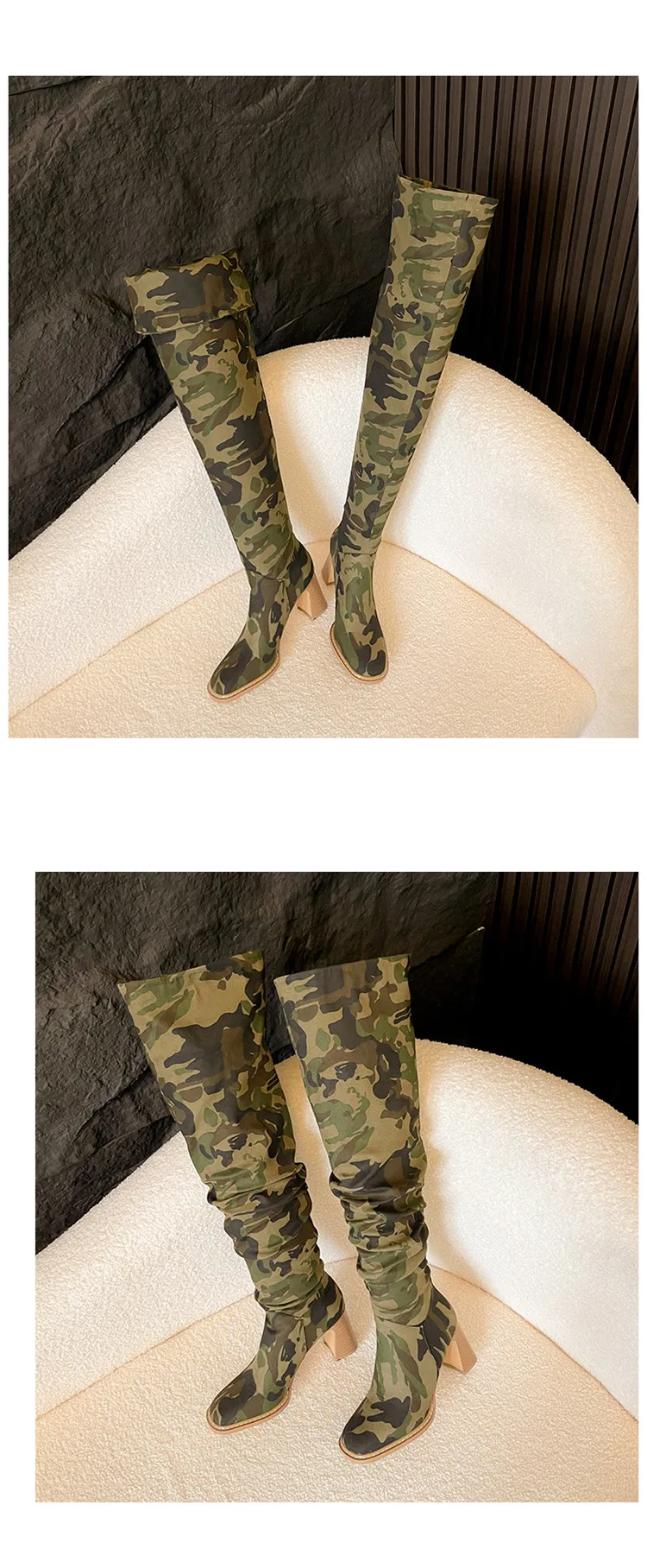 LBSFY - Fashion Over Knee Boots Women New High Quality Camo Boots Round Head Pleated High Heel Boots Street Hot Girl Modern Boots