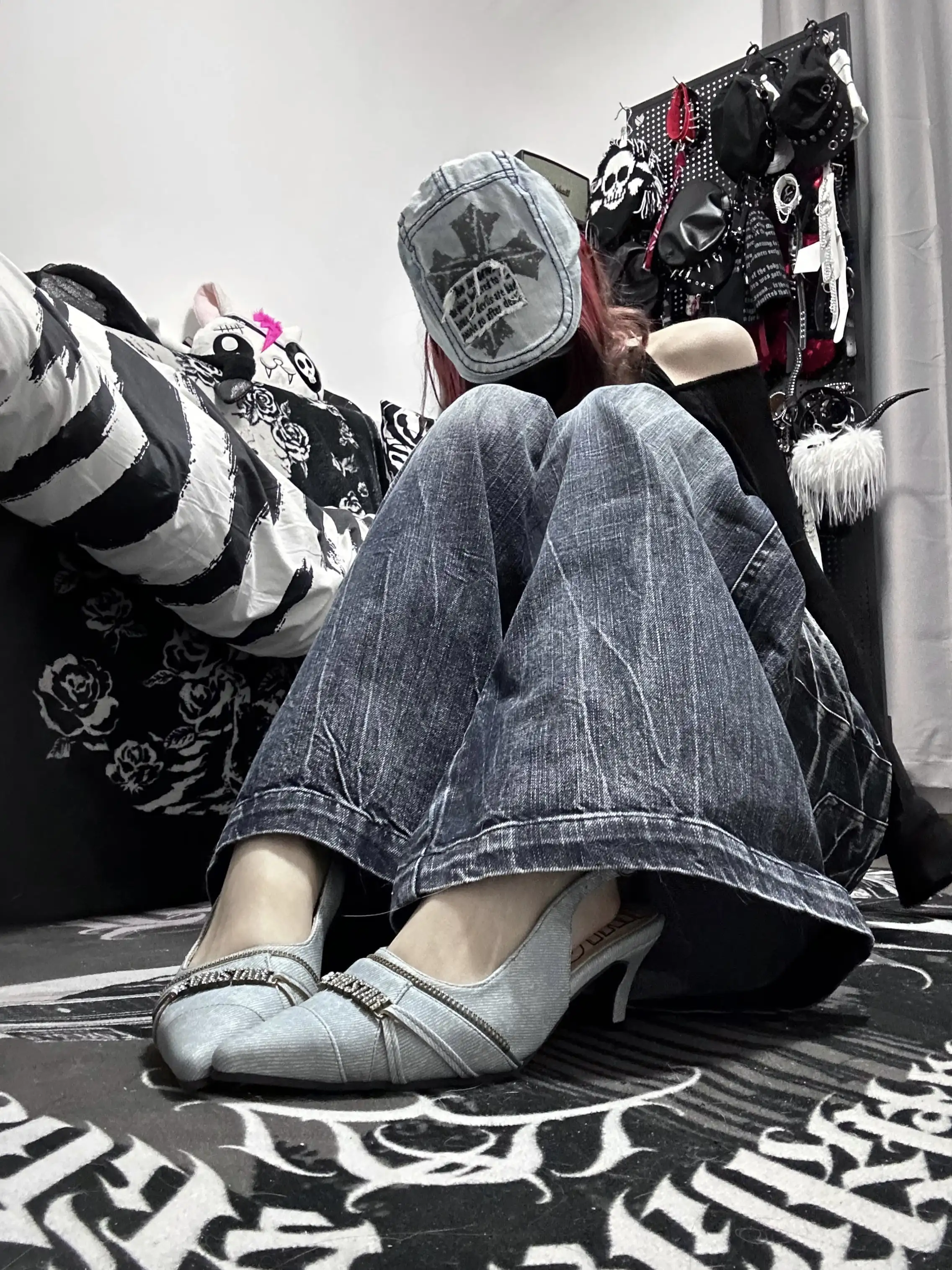 LBSFY - Fashion Retro Y2K Denim Slippers Low Heel Subculture Rhinestone Women Heels Spice Girls Party Women's Shoes