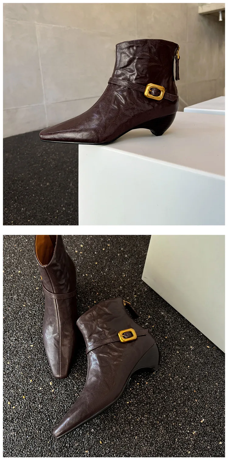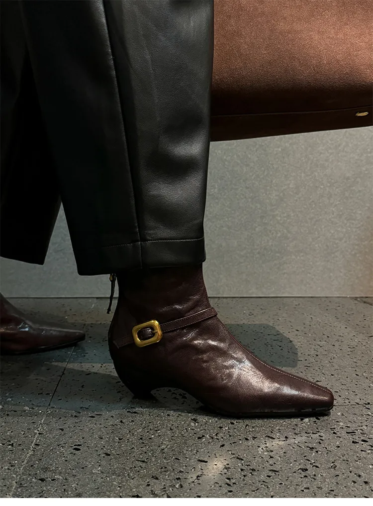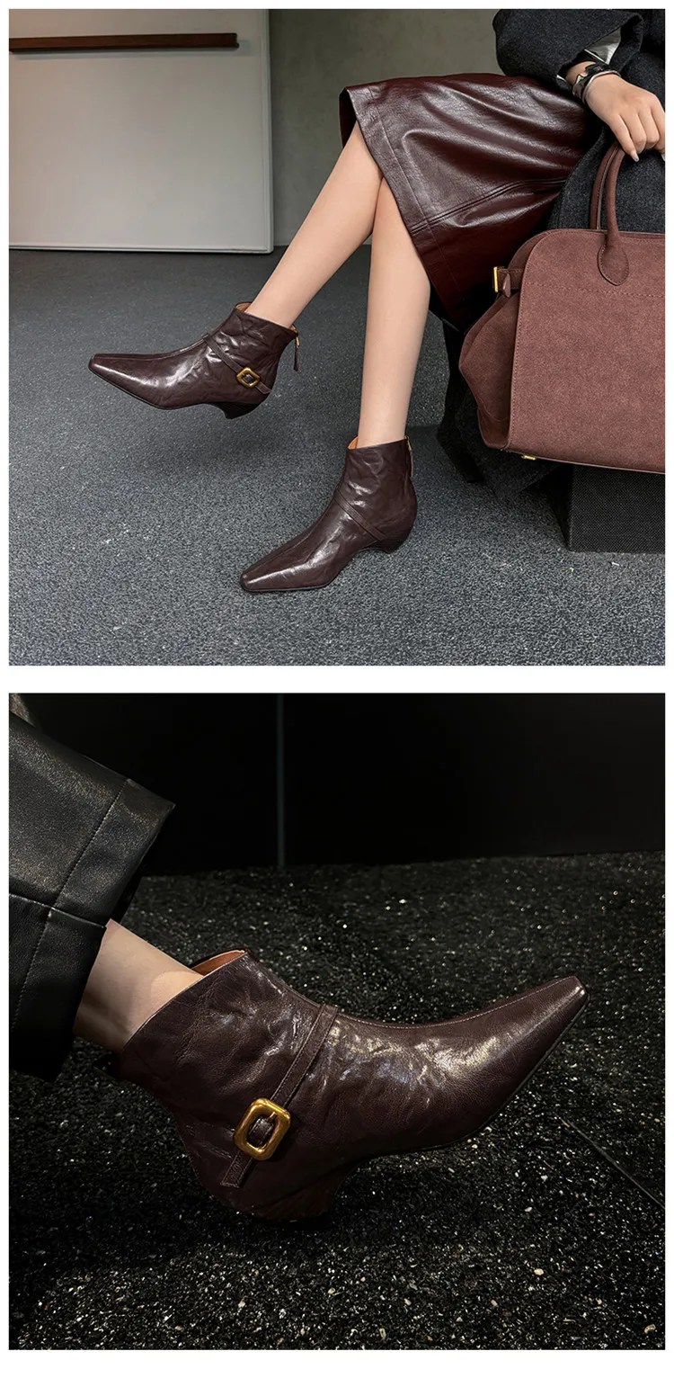 LBSFY - Fashion Short Boots Women's New High Quality Genuine Leather Boots Pointed Belt Buckle Cone Heel Zipper Women's Boots