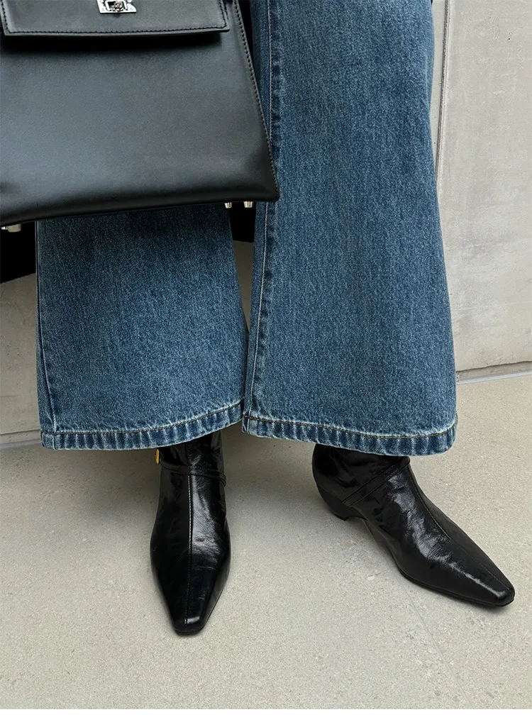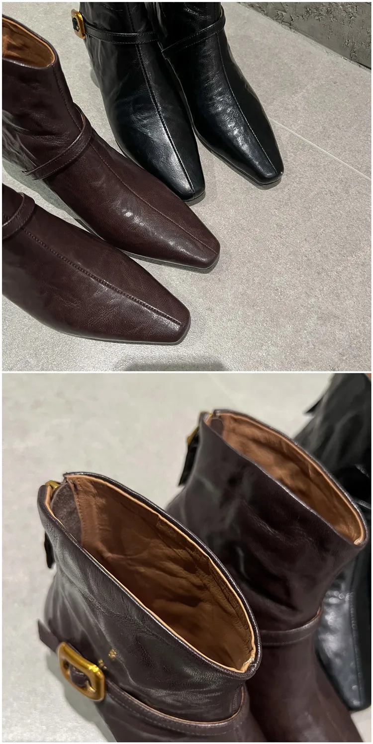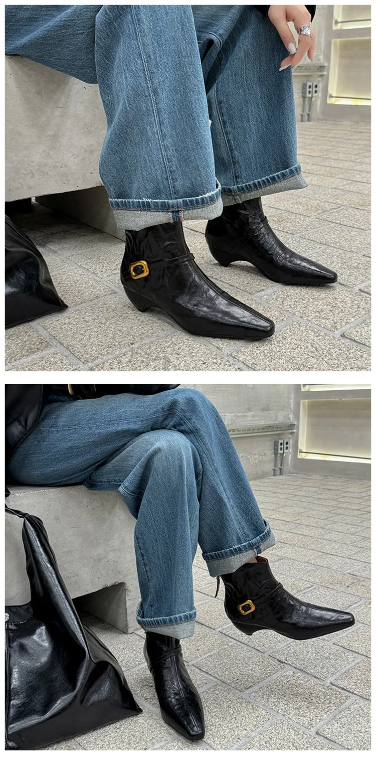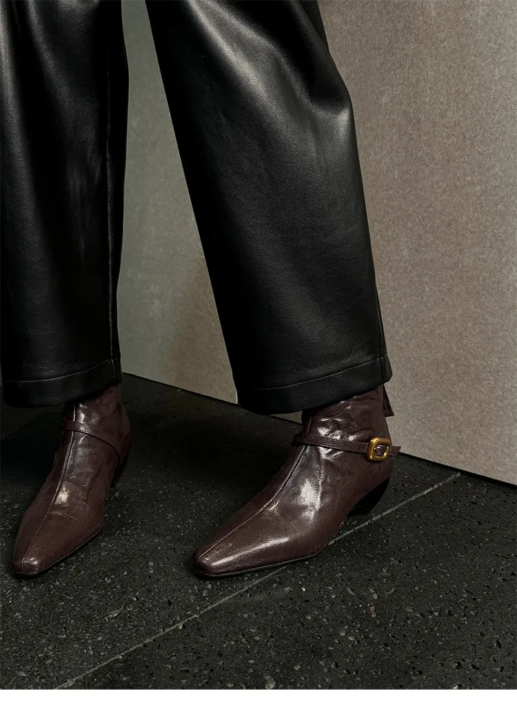 LBSFY - Fashion Short Boots Women's New High Quality Genuine Leather Boots Pointed Belt Buckle Cone Heel Zipper Women's Boots