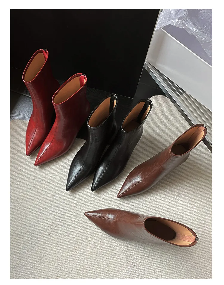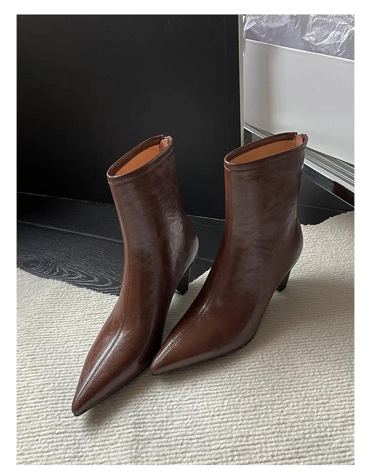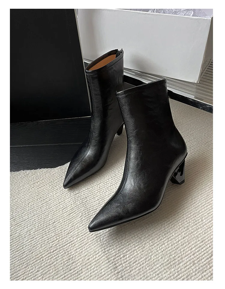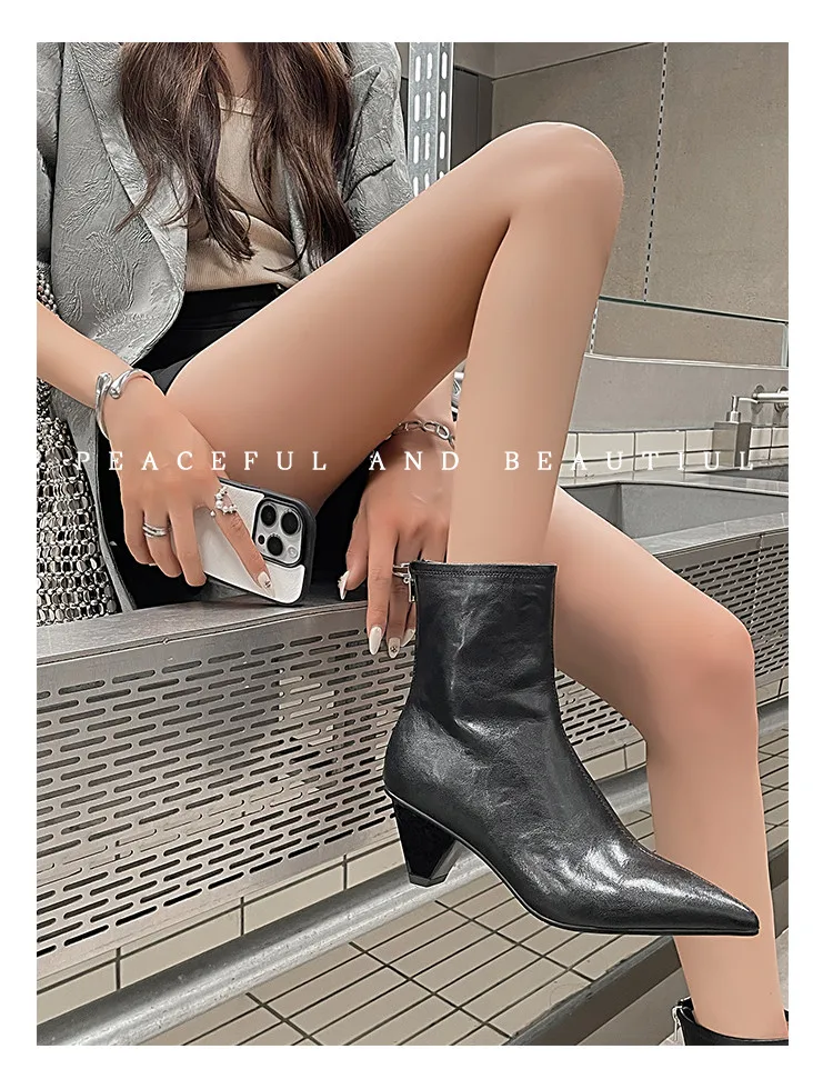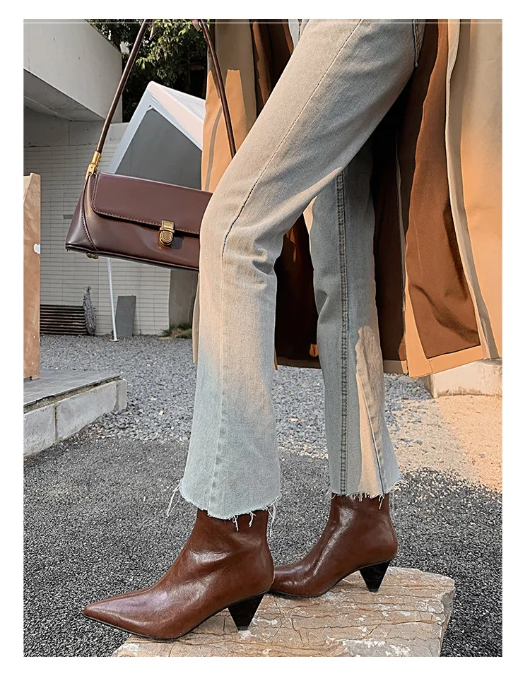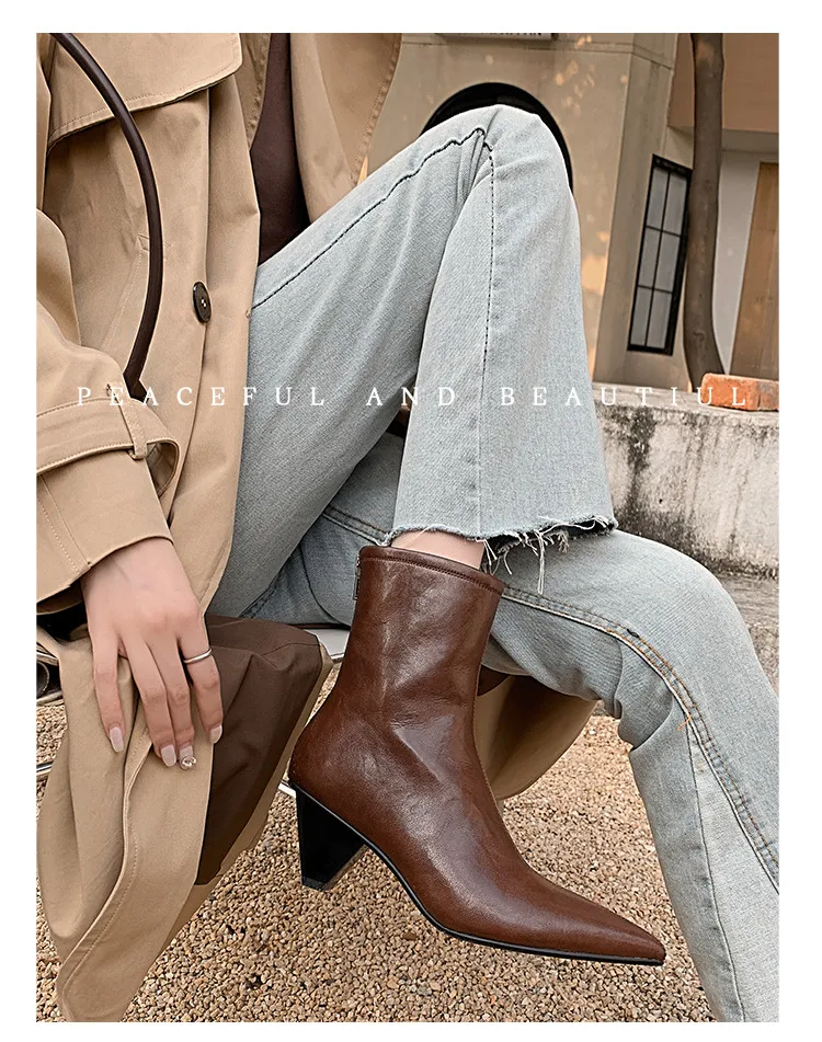 LBSFY - Fashion Short Boots Women's New High Quality Genuine Leather Pointed Head Cone Heel Boots Commuter Calf Ankle Boots