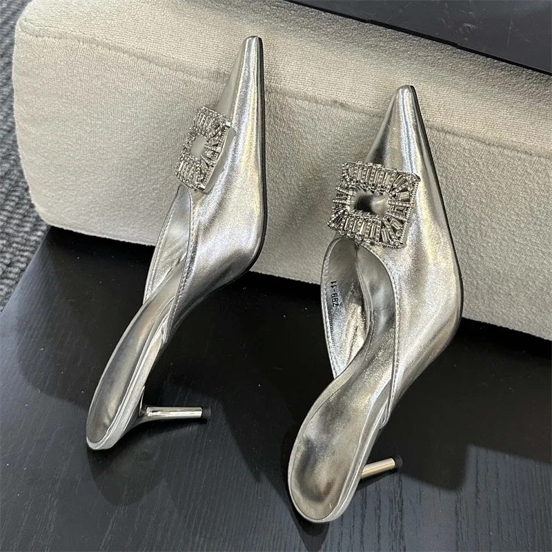 LBSFY - Fashion Spring Crystal Buckle Thin Heels Pointed Toe Women Slippers Mule Shoes Party Zapatos De Mujeres