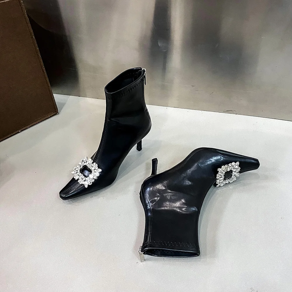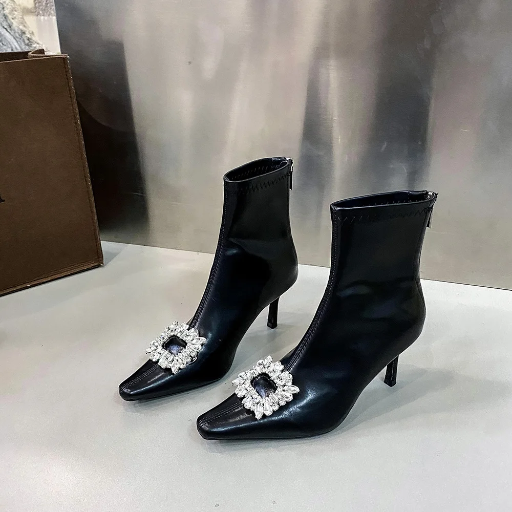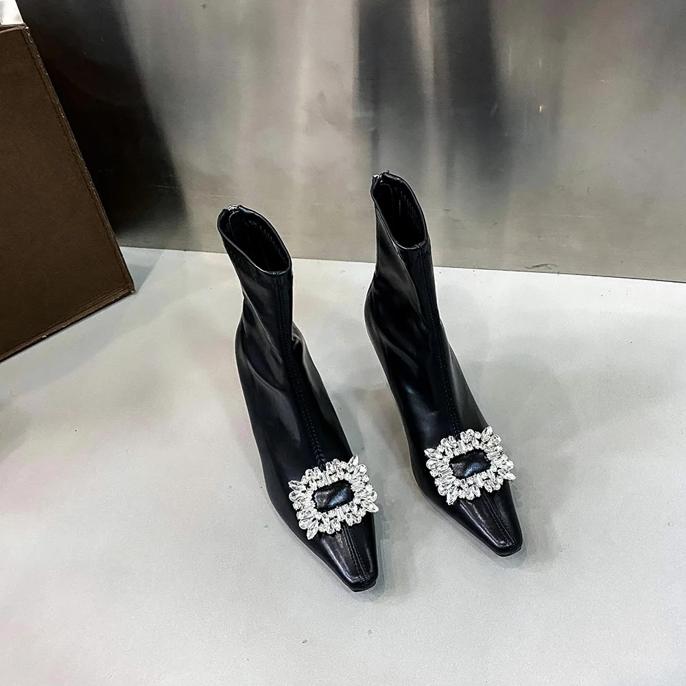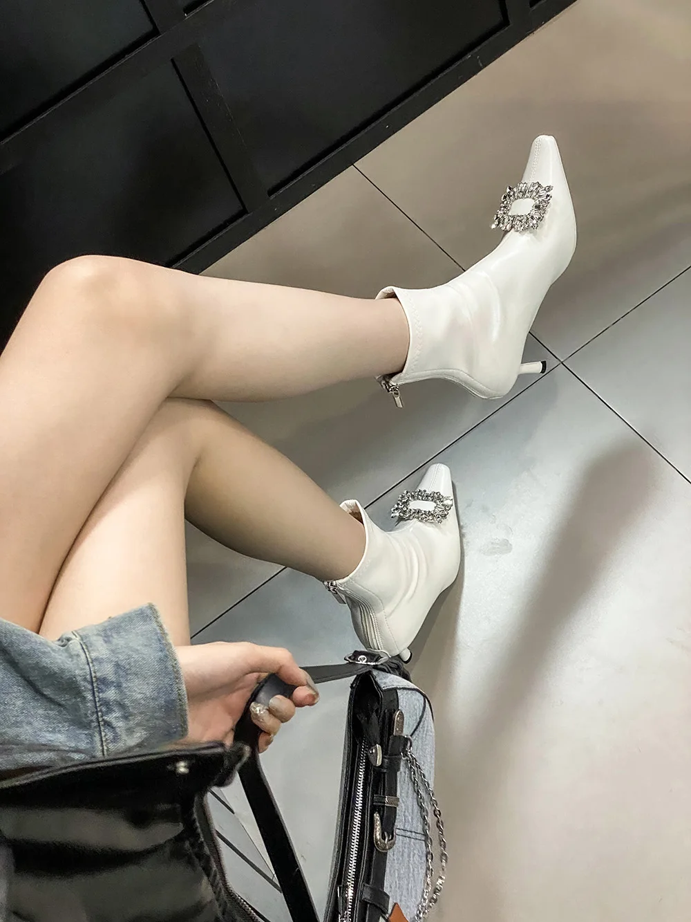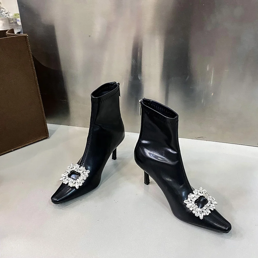 LBSFY - Fashion Women Ankle Boots Chelsea Botas Thin High Heels Sexy Back Zipper Crystal Design Rhinestone Buckle Winter Short Boots