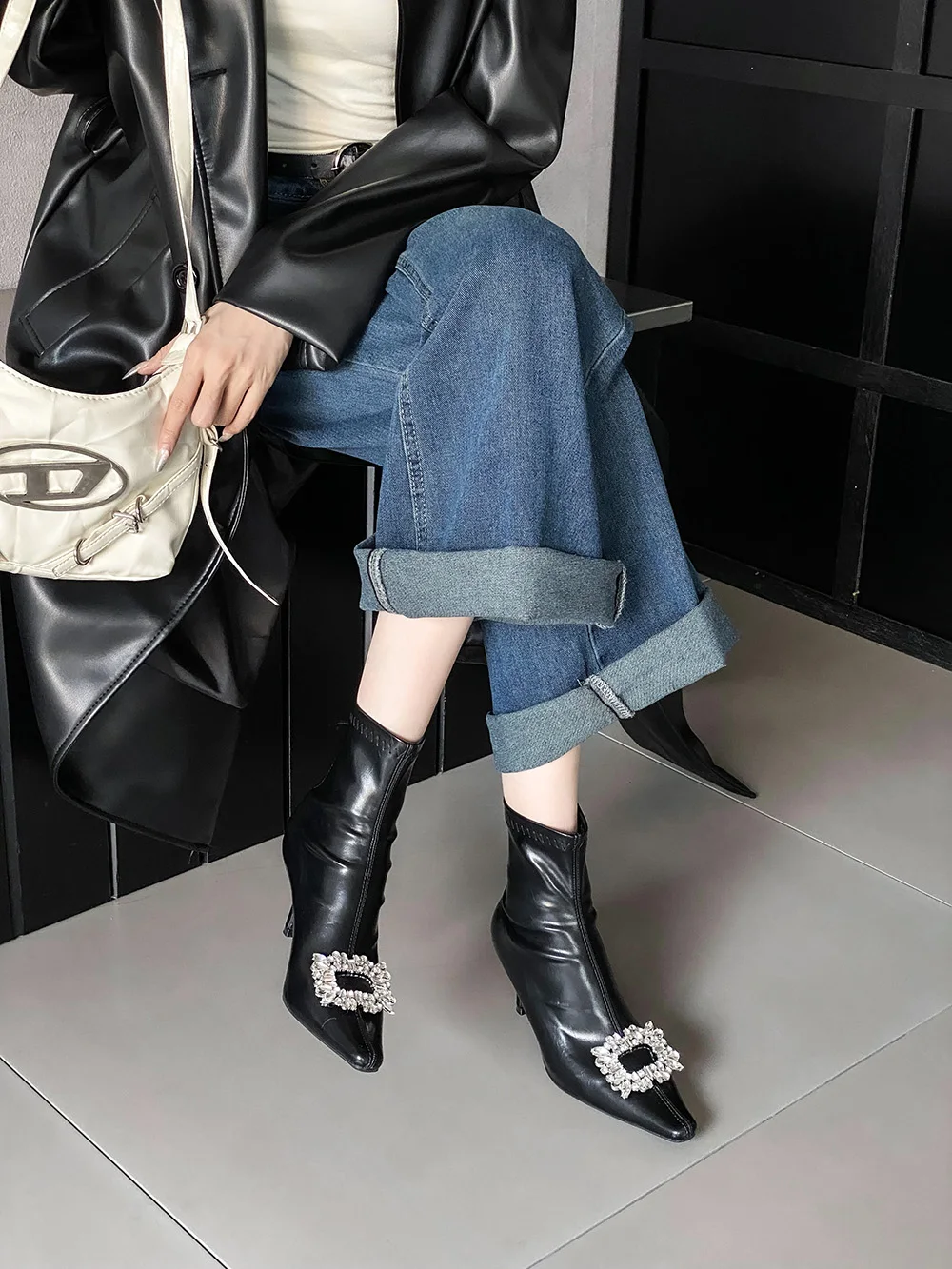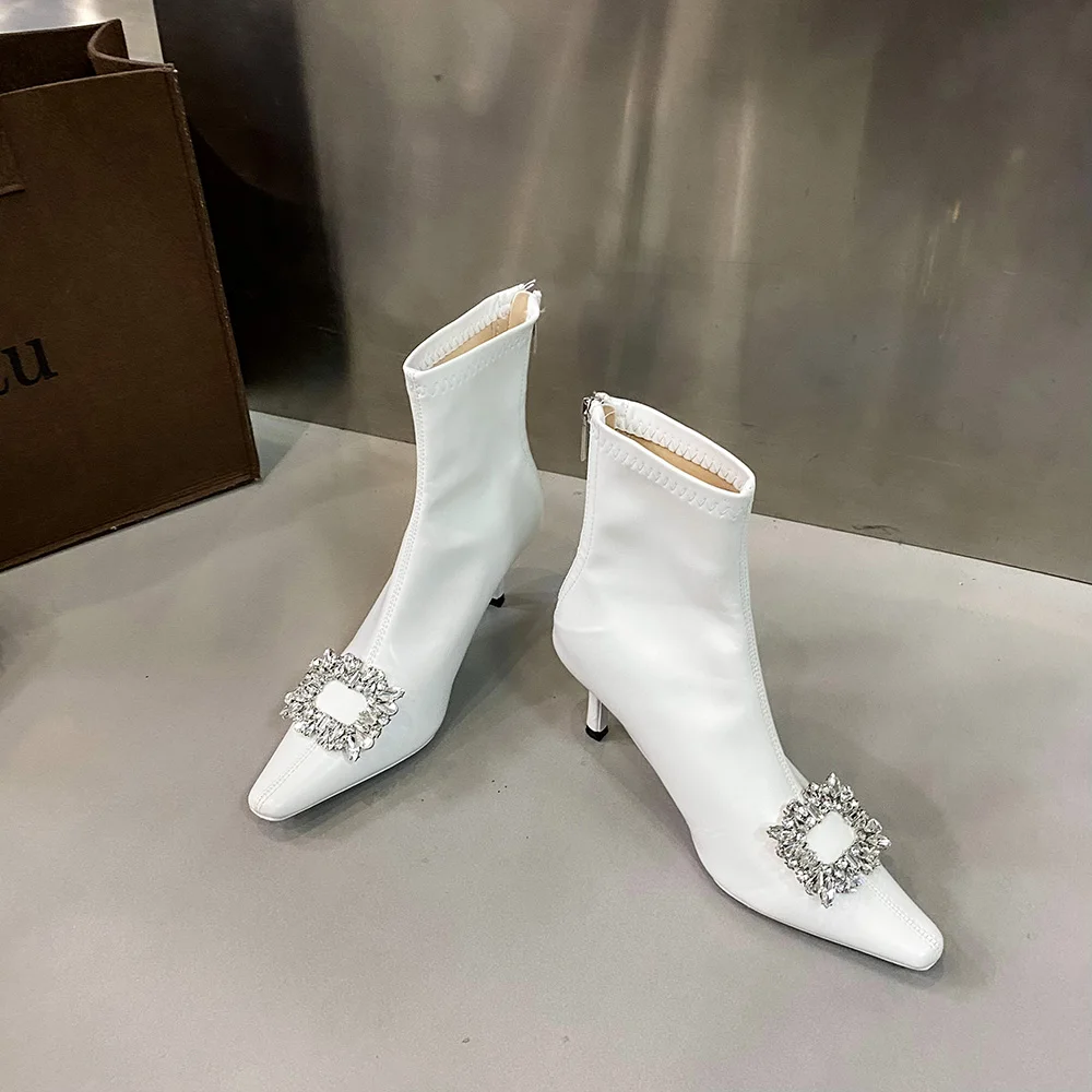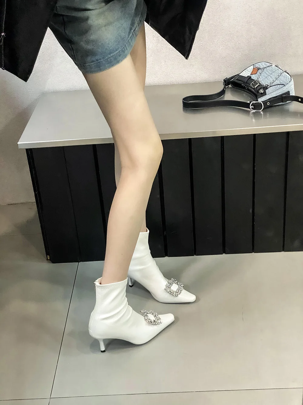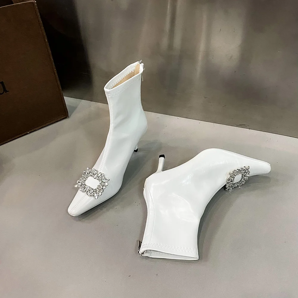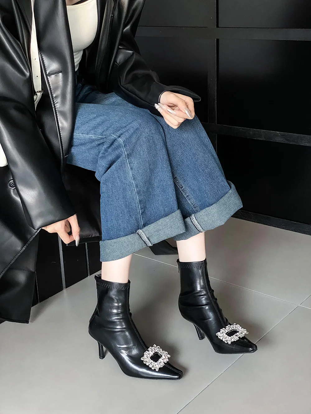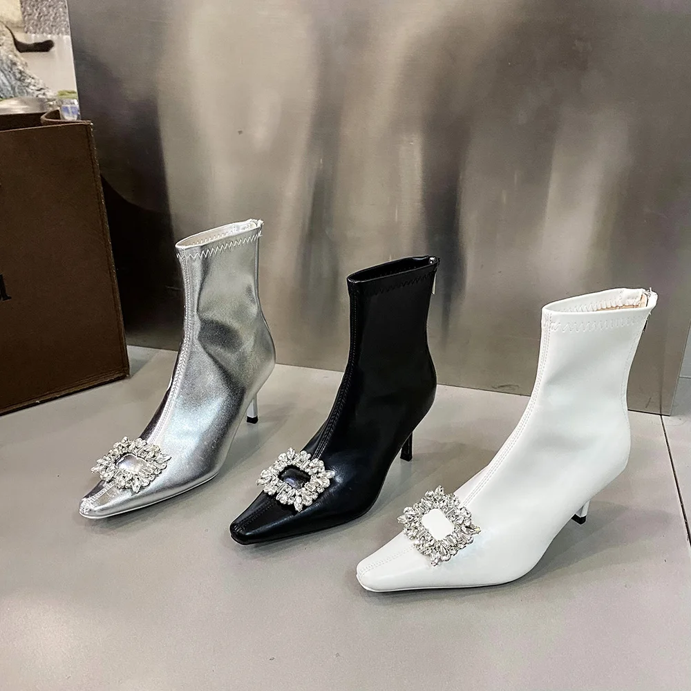 LBSFY - Fashion Women Ankle Boots Chelsea Botas Thin High Heels Sexy Back Zipper Crystal Design Rhinestone Buckle Winter Short Boots
