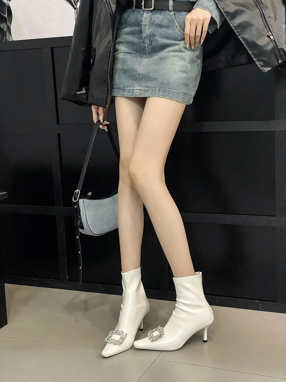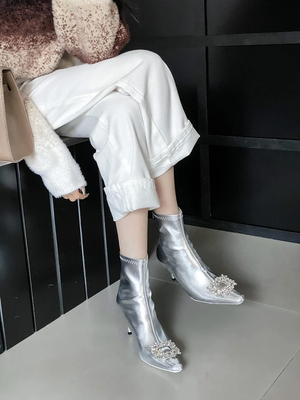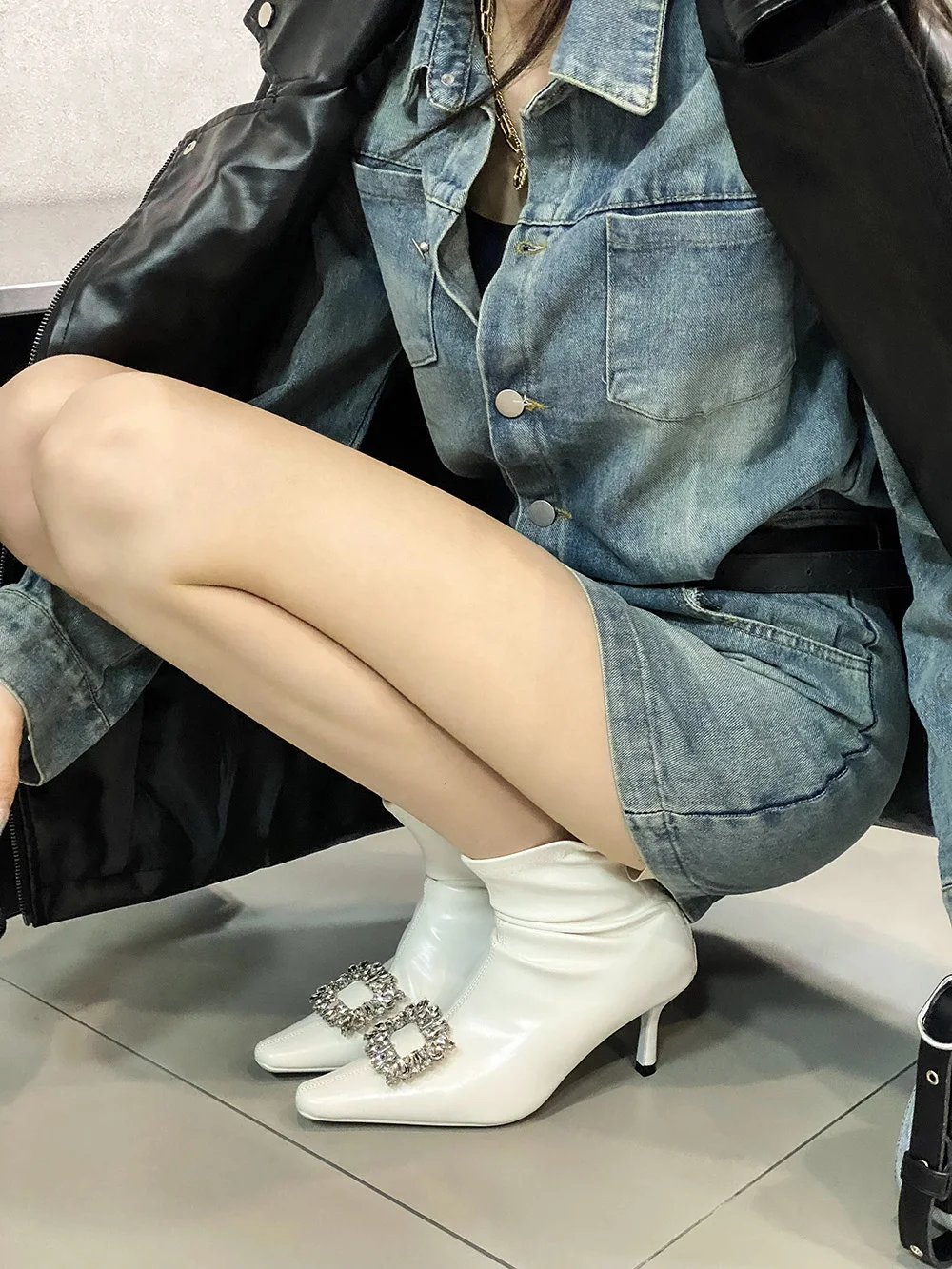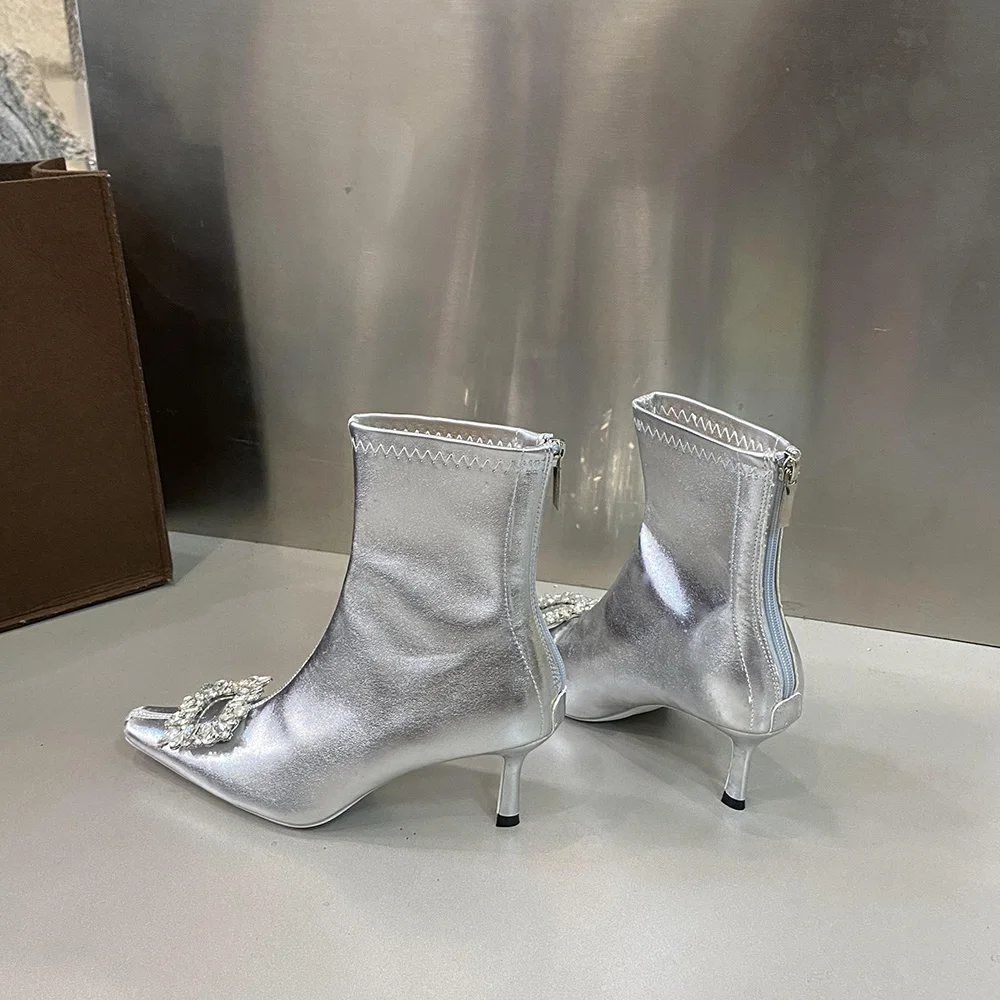 LBSFY - Fashion Women Ankle Boots Chelsea Botas Thin High Heels Sexy Back Zipper Crystal Design Rhinestone Buckle Winter Short Boots