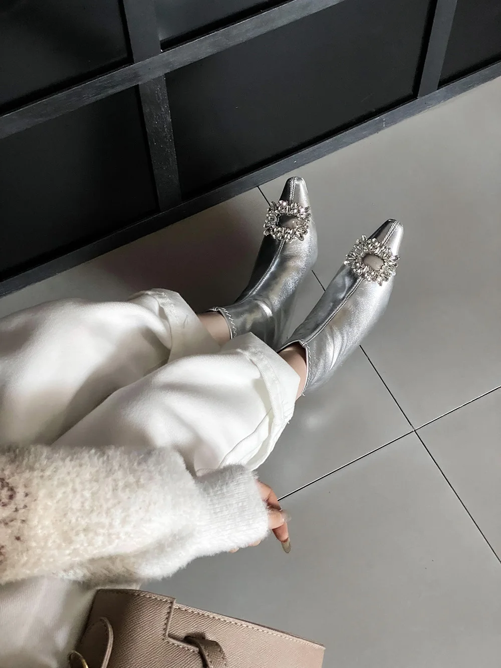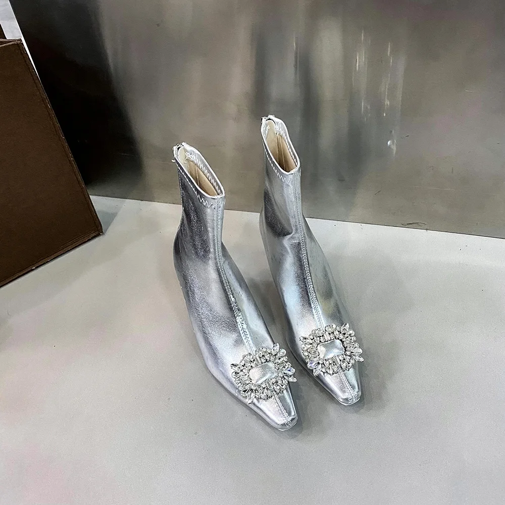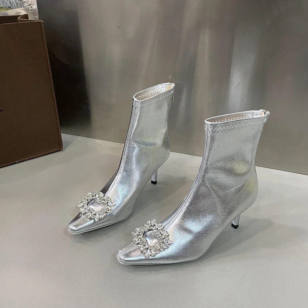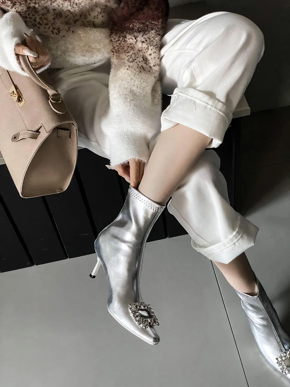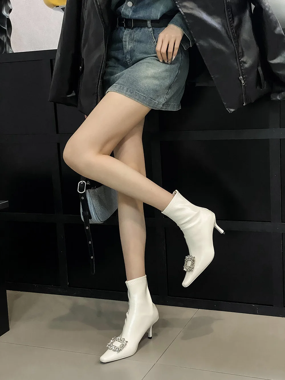 LBSFY - Fashion Women Ankle Boots Chelsea Botas Thin High Heels Sexy Back Zipper Crystal Design Rhinestone Buckle Winter Short Boots