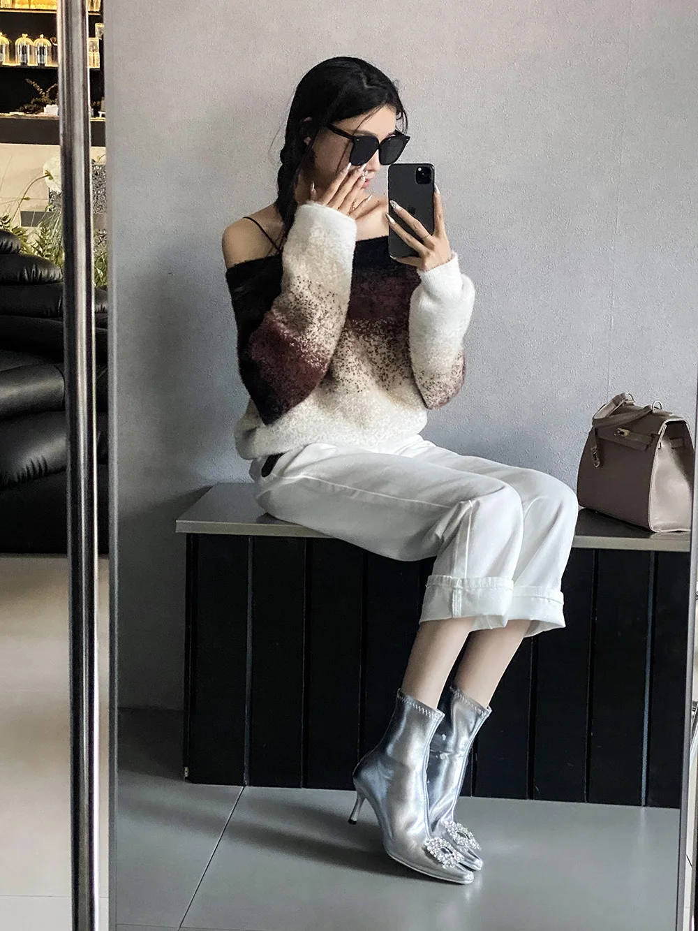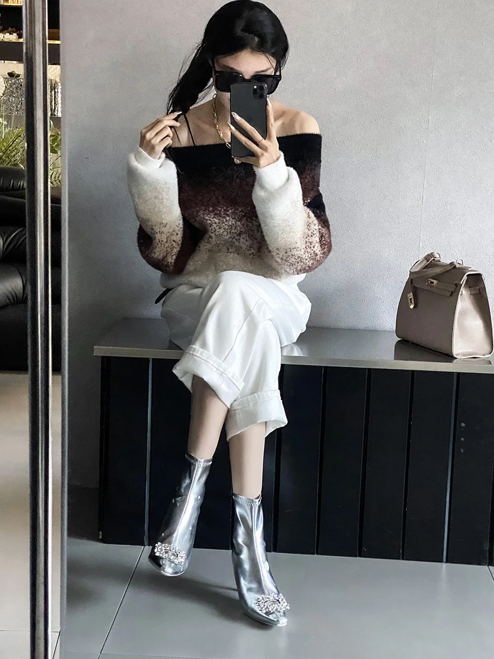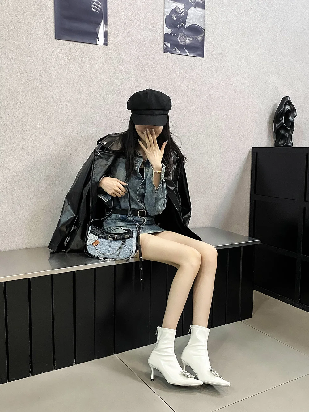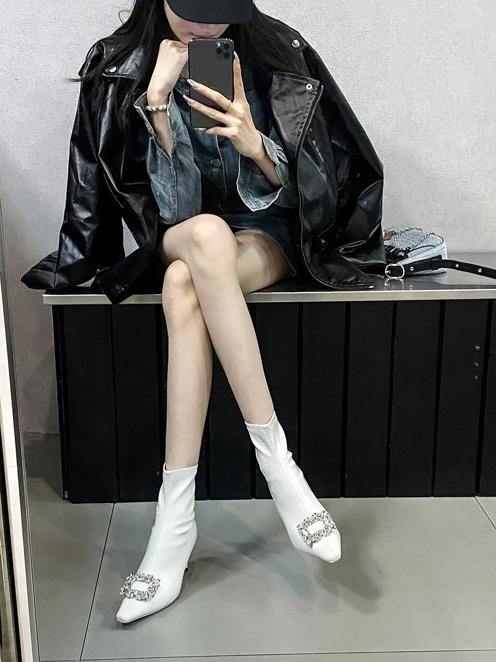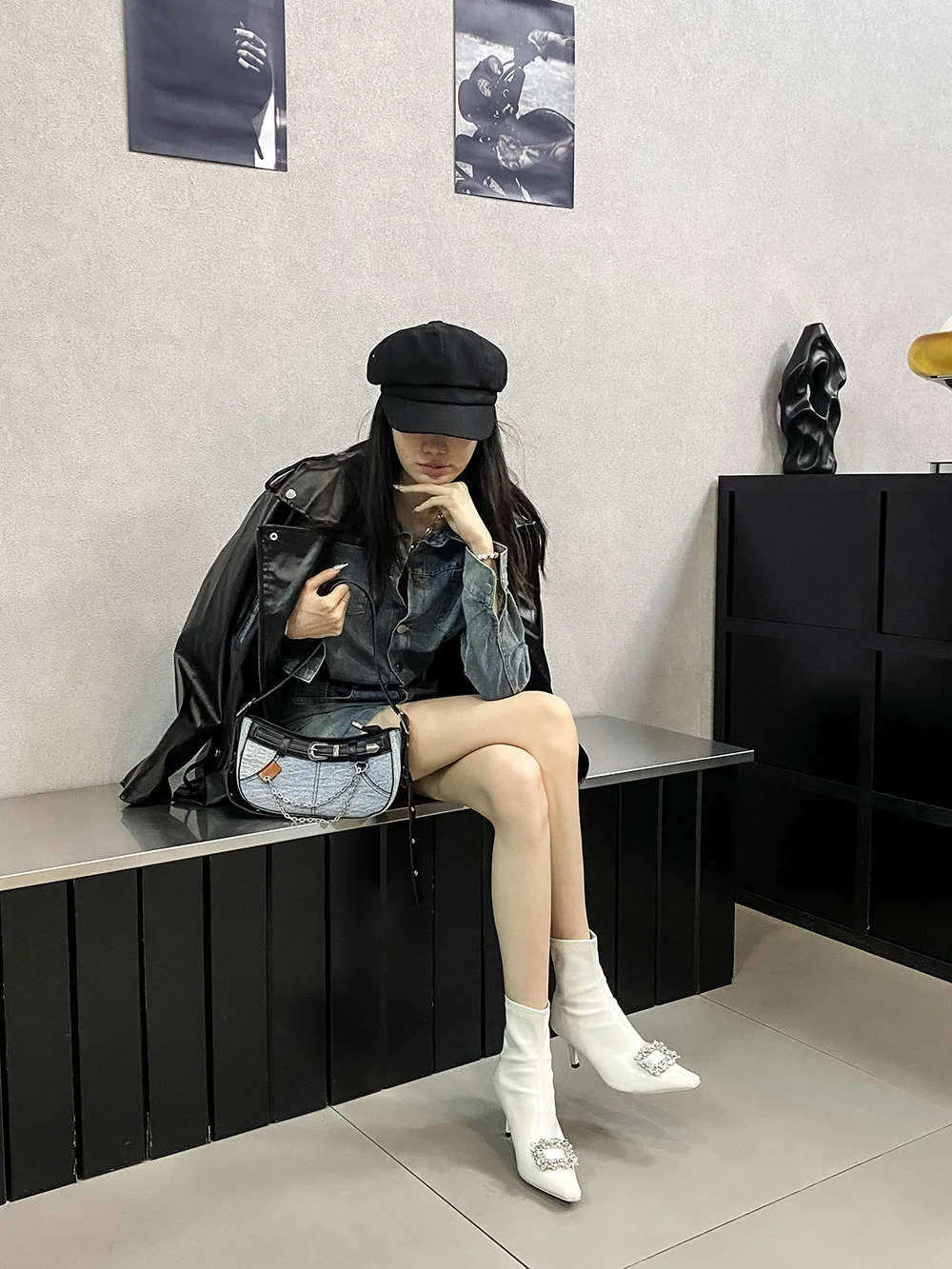 LBSFY - Fashion Women Ankle Boots Chelsea Botas Thin High Heels Sexy Back Zipper Crystal Design Rhinestone Buckle Winter Short Boots