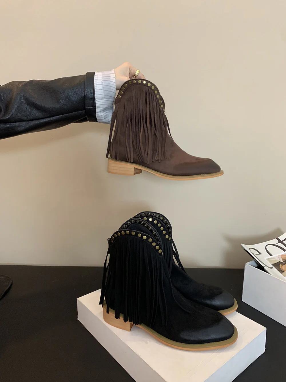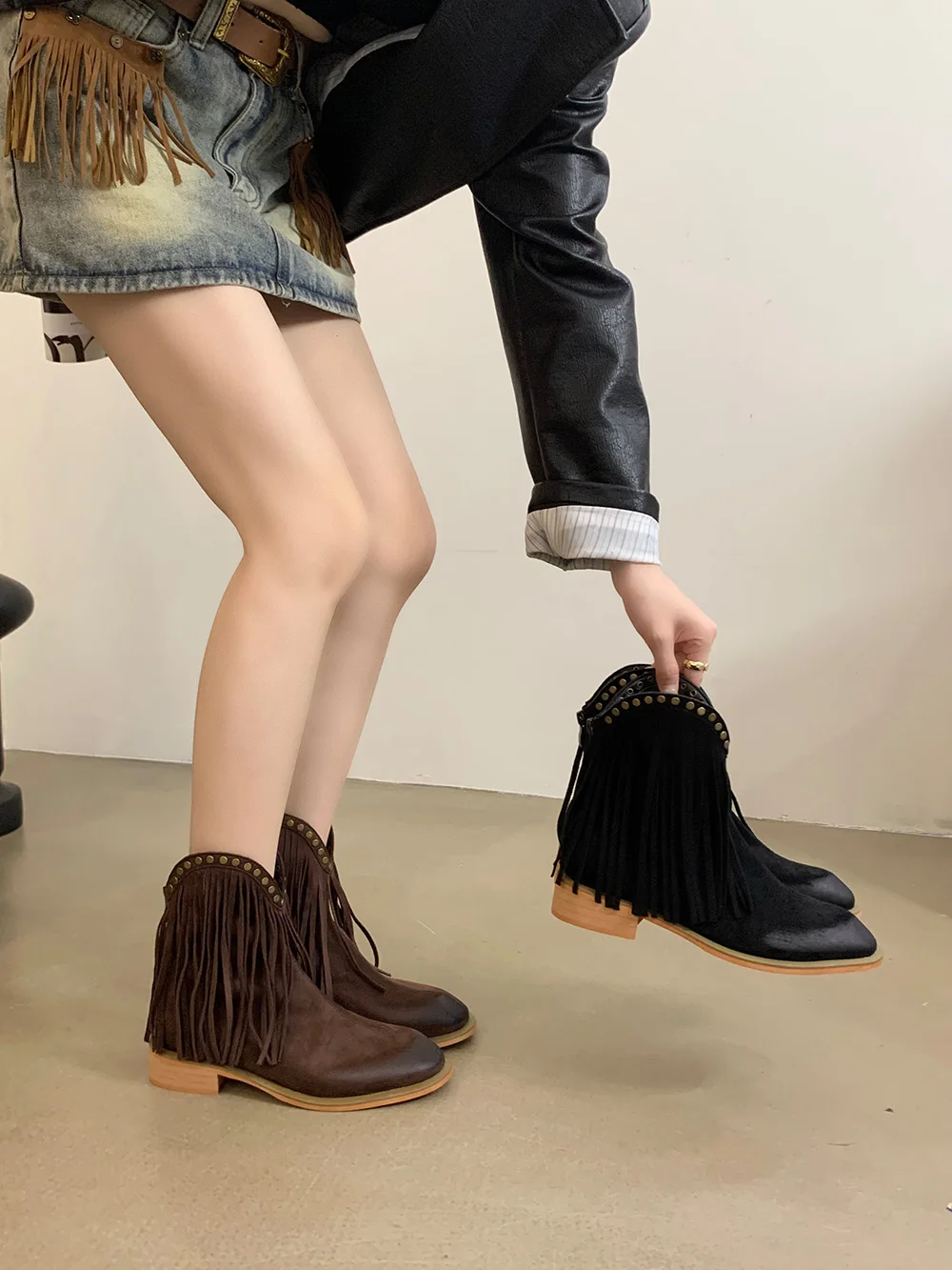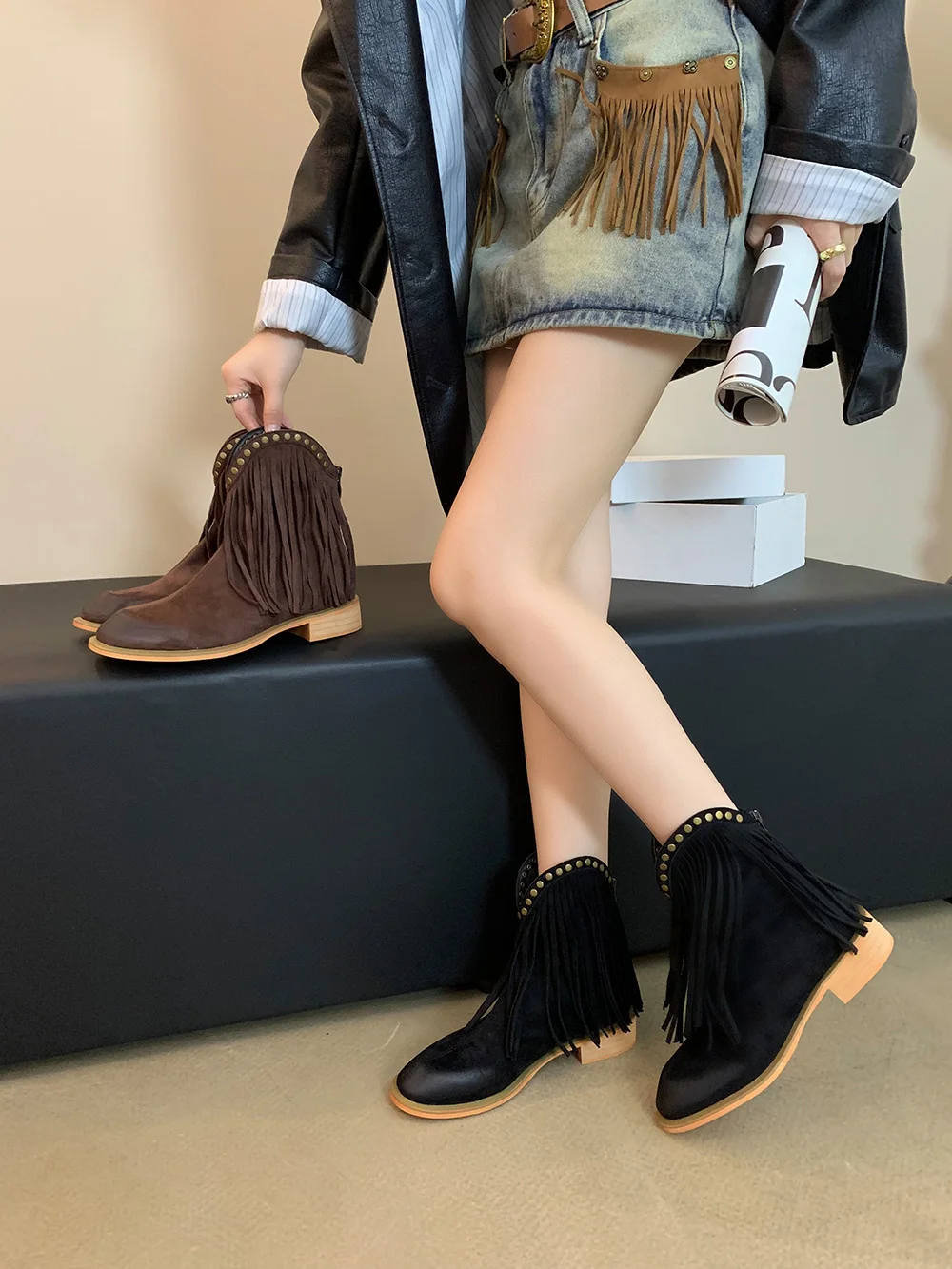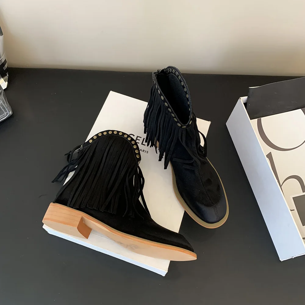 LBSFY - Fashion Women Ankle Boots Round Toe Suede Satin Black Brown Back Zipper Flat Low Heels Chelsea Booties Winter Party Short Botas
