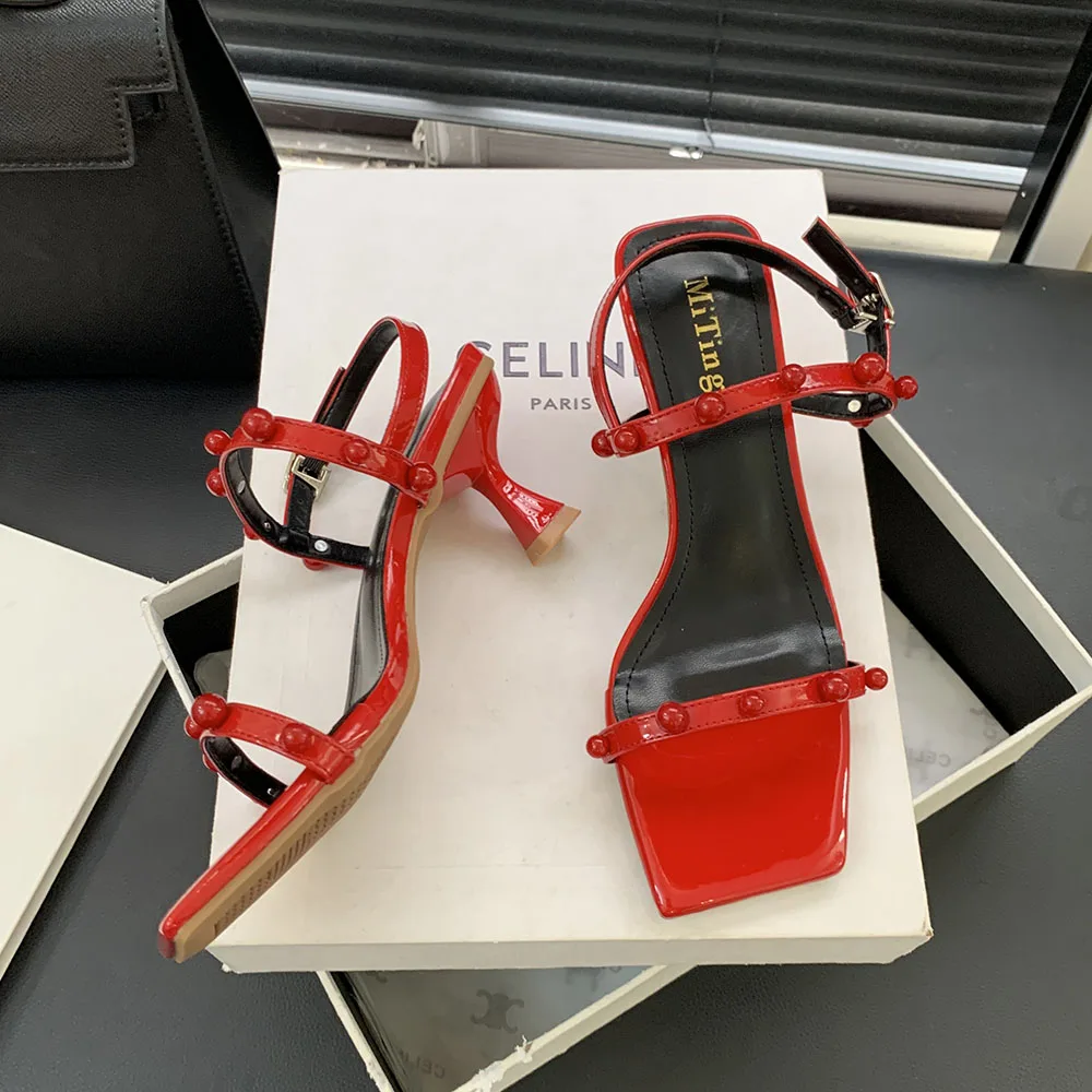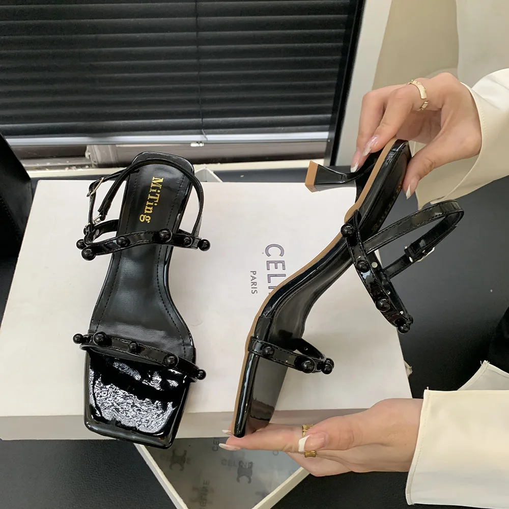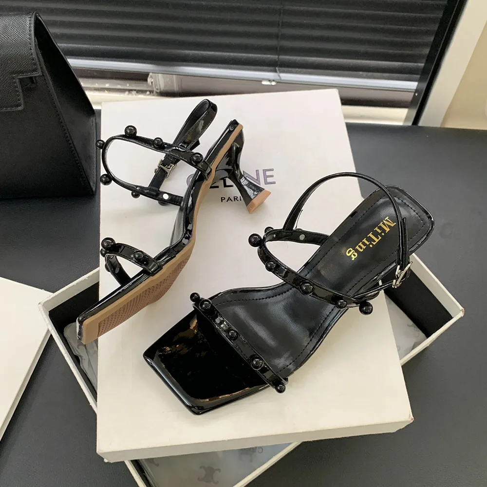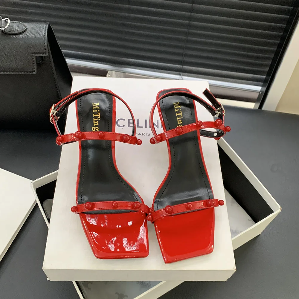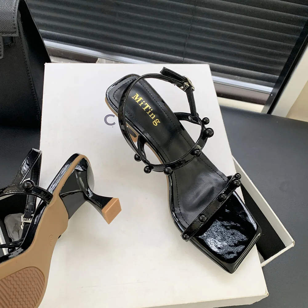 LBSFY - Fashion Women Sandals Narrow Band Patent Leather Summer Dress Shoes Thin High Heels Ankle Strap Party Slides Mules Shoes Size 39