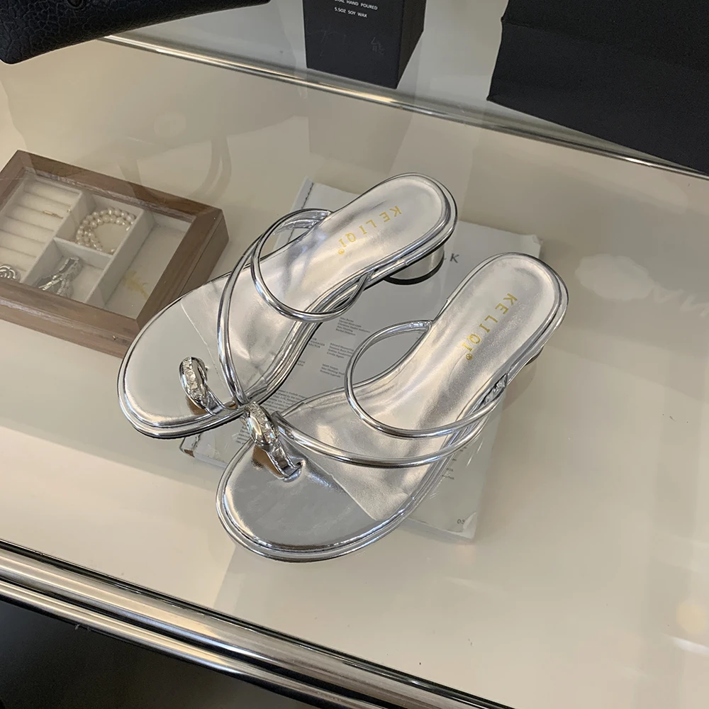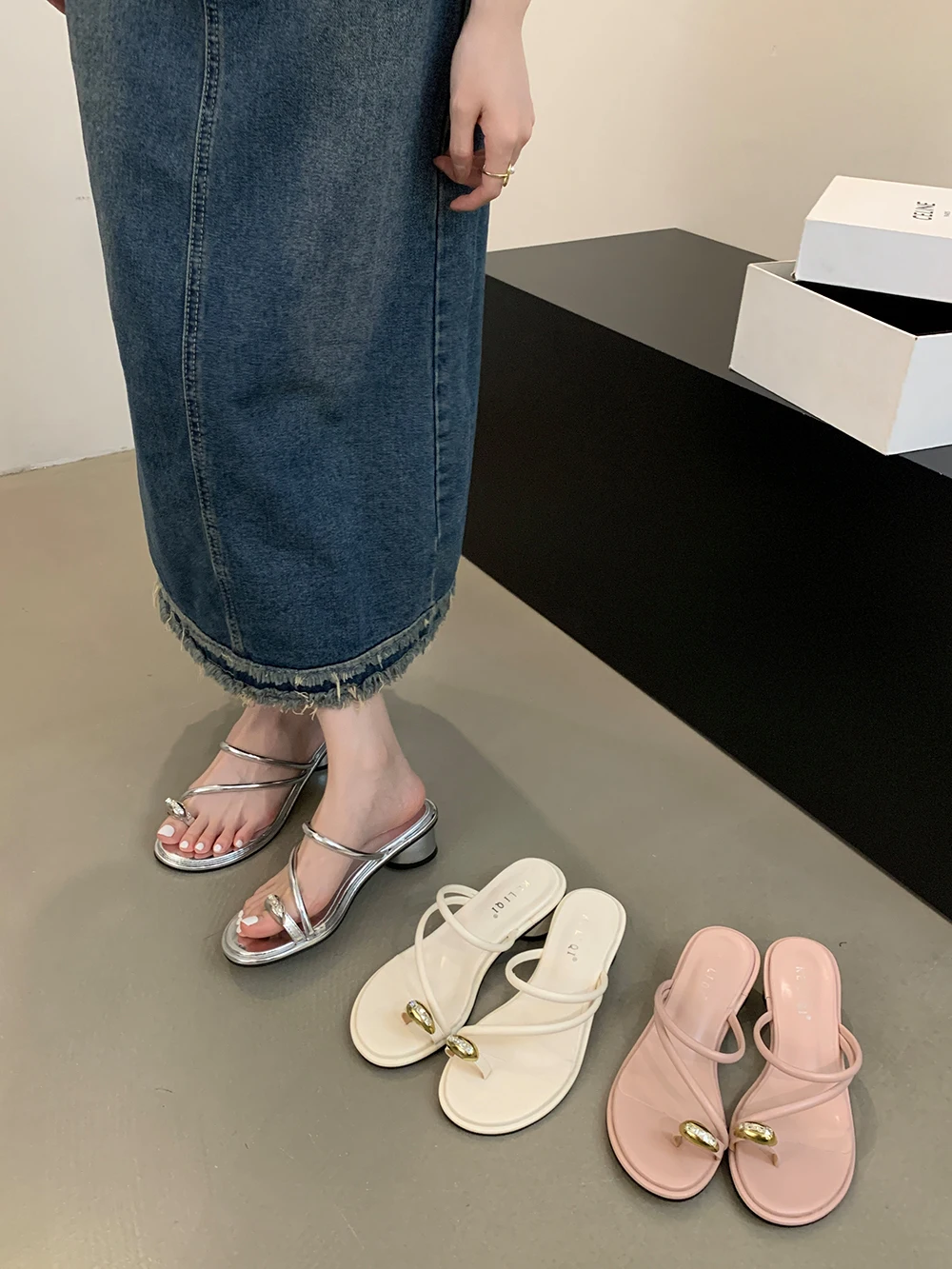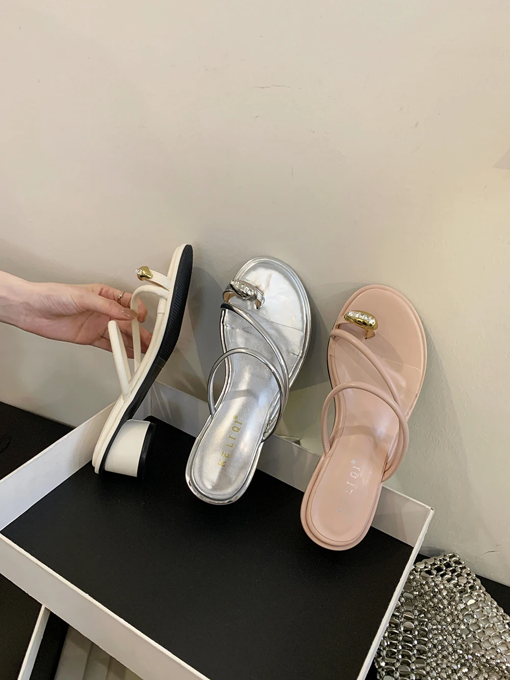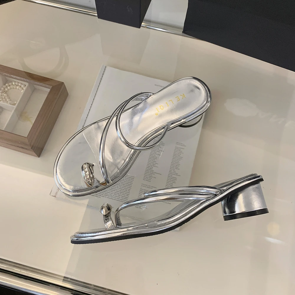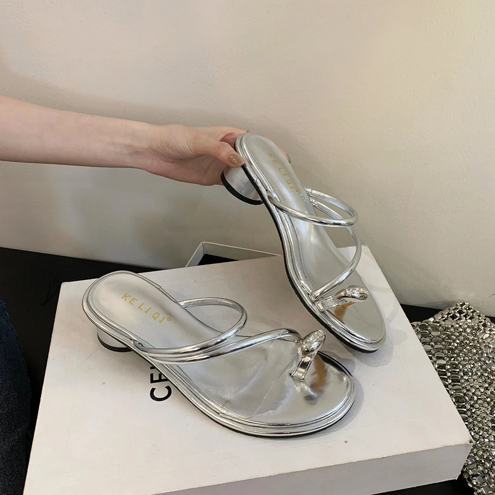 LBSFY - Fashion Women Slides Slippers Silver Pink White Narrow Band Summer Thick Mid Heels Slip On Party Pumps Dress Shoes Woman Size 39