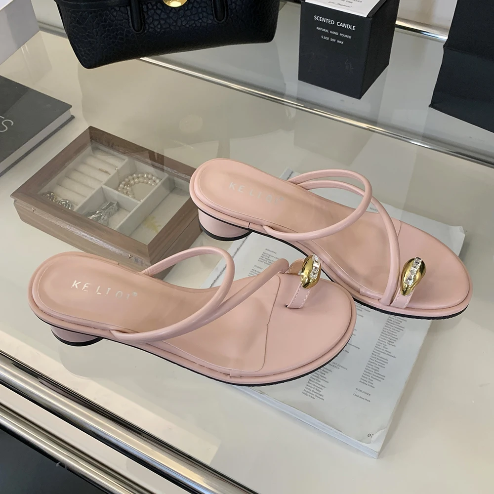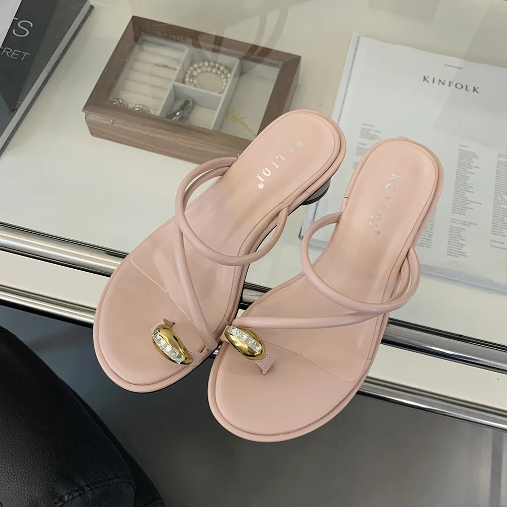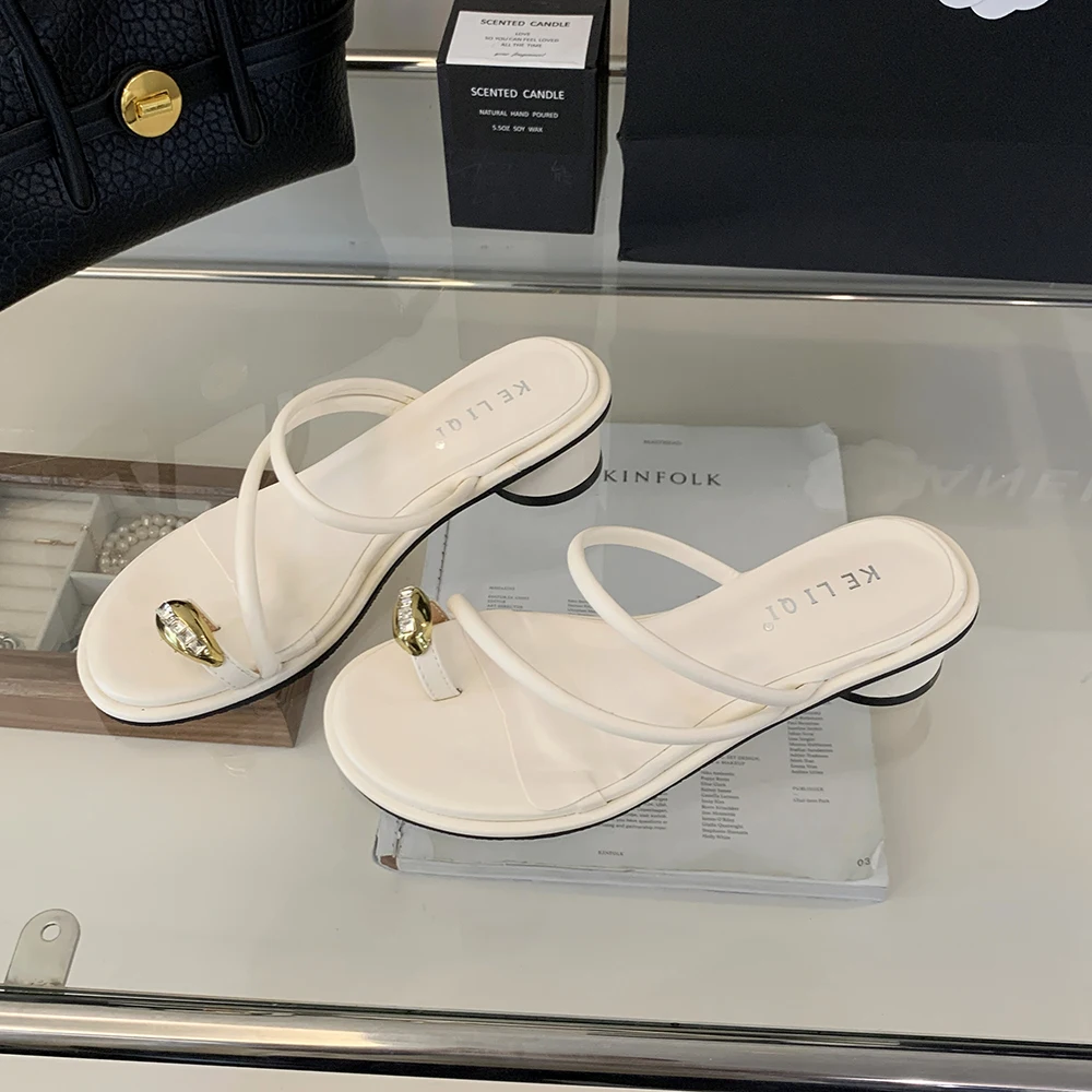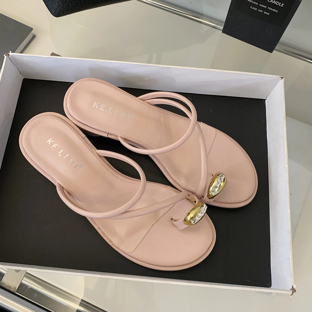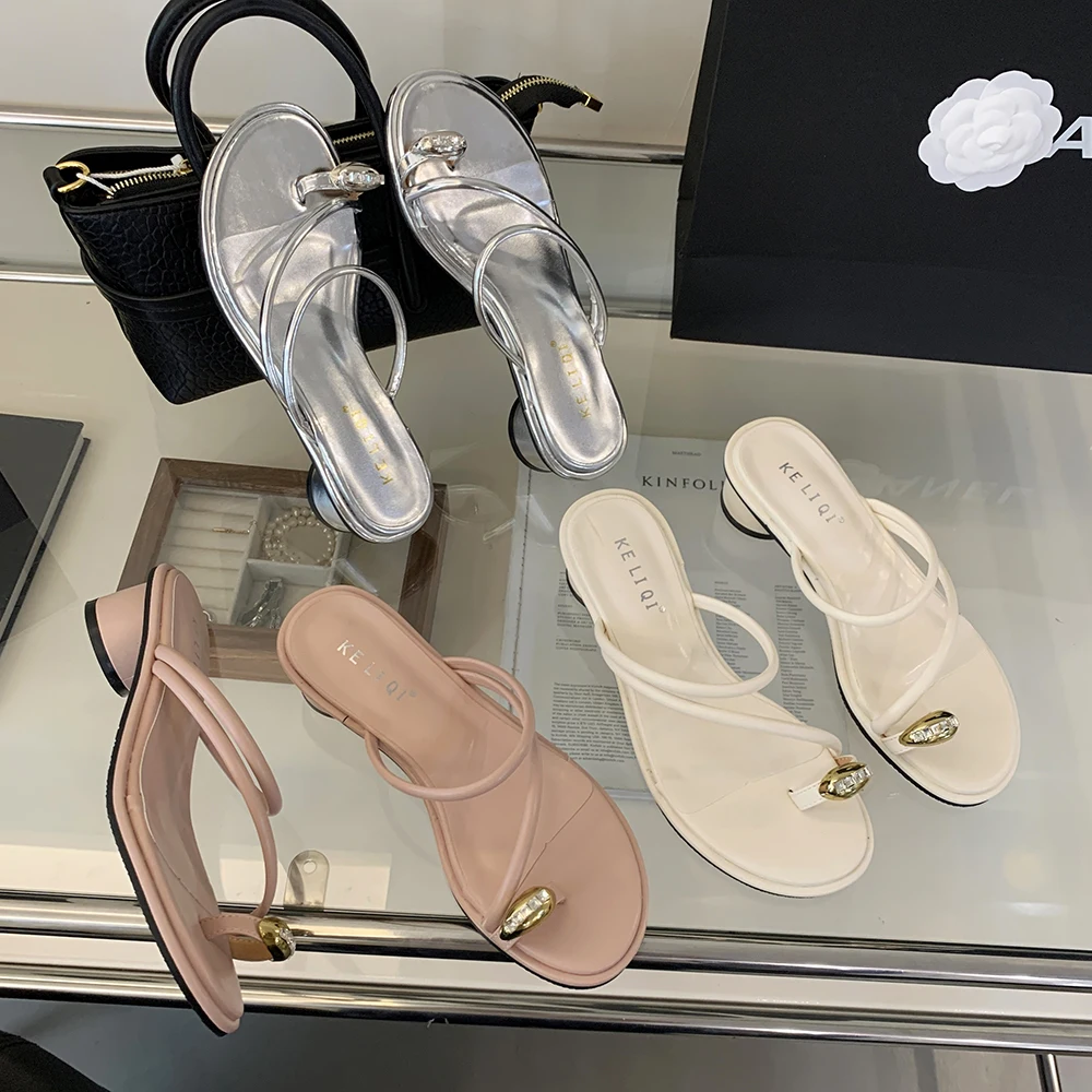 LBSFY - Fashion Women Slides Slippers Silver Pink White Narrow Band Summer Thick Mid Heels Slip On Party Pumps Dress Shoes Woman Size 39