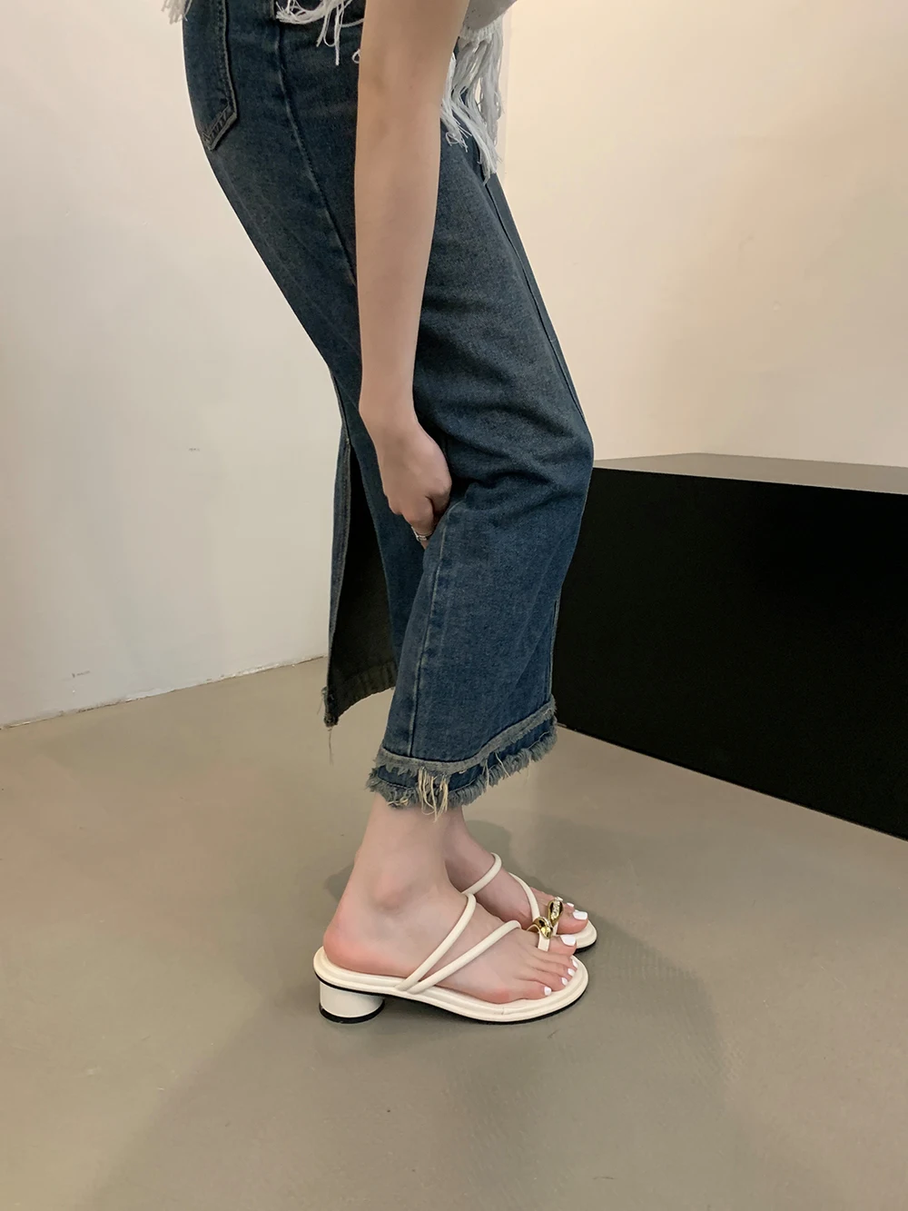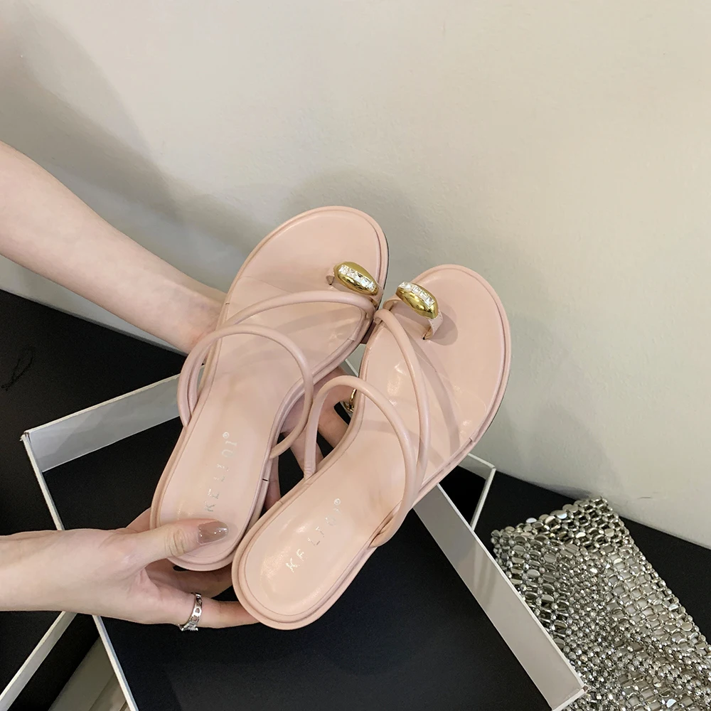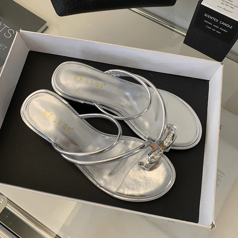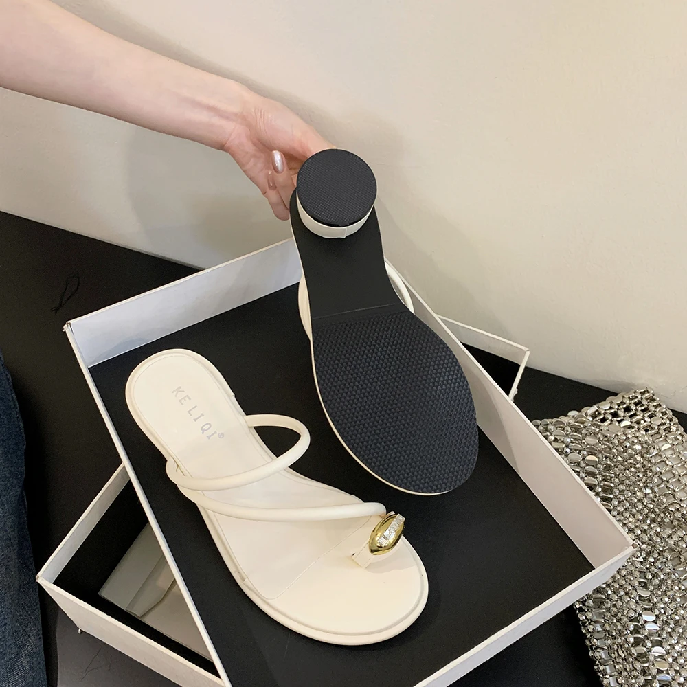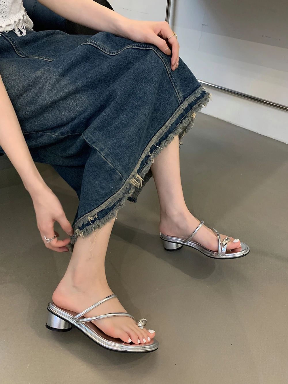 LBSFY - Fashion Women Slides Slippers Silver Pink White Narrow Band Summer Thick Mid Heels Slip On Party Pumps Dress Shoes Woman Size 39