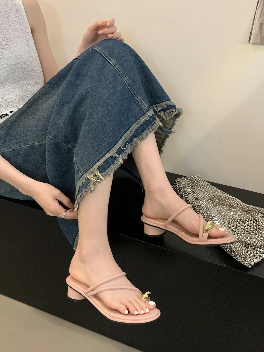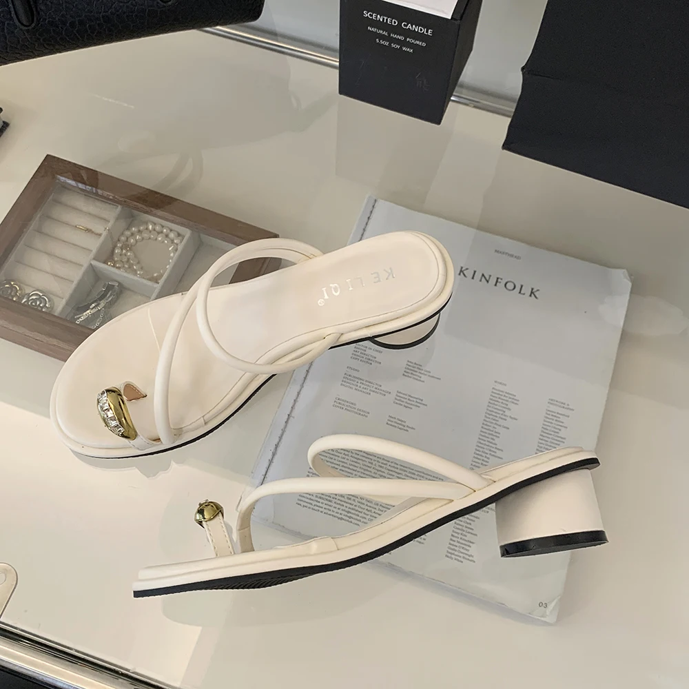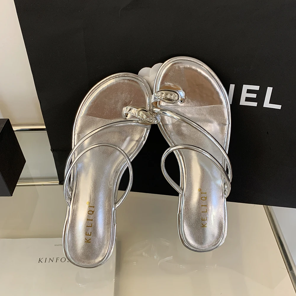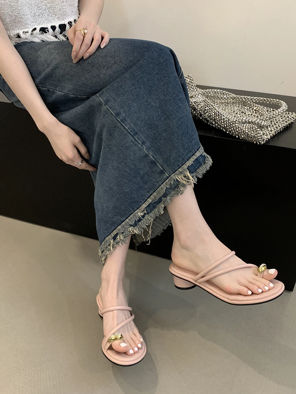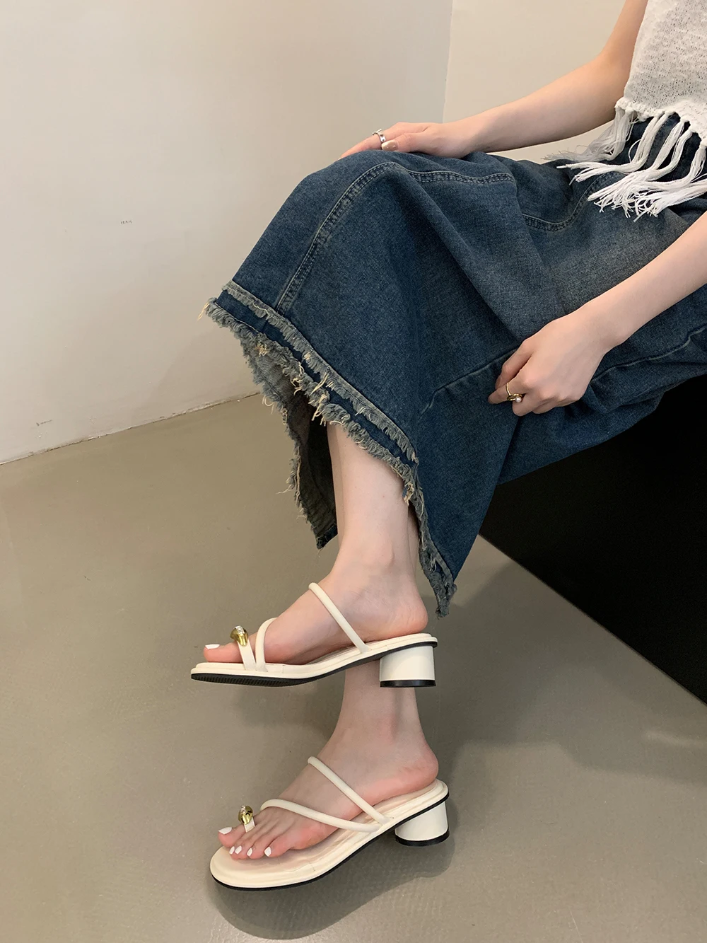 LBSFY - Fashion Women Slides Slippers Silver Pink White Narrow Band Summer Thick Mid Heels Slip On Party Pumps Dress Shoes Woman Size 39