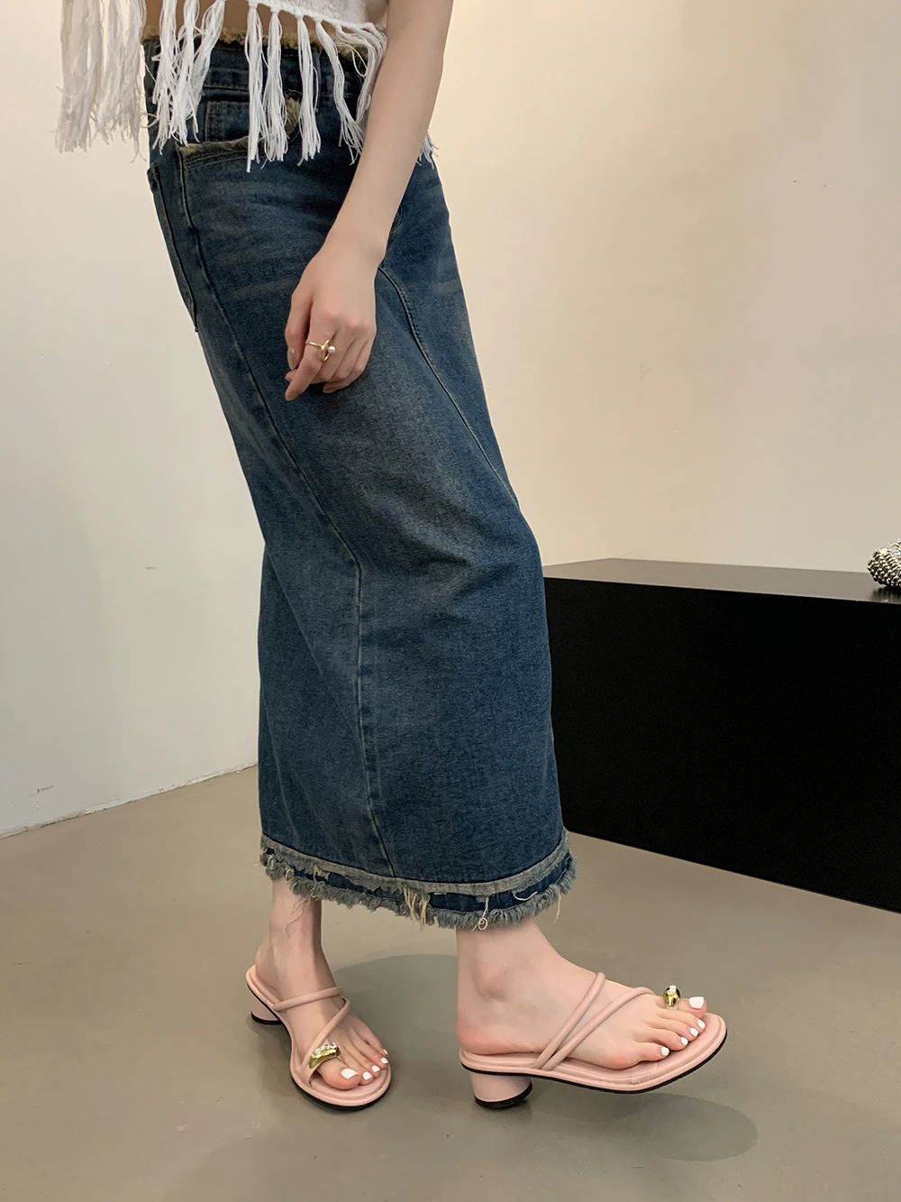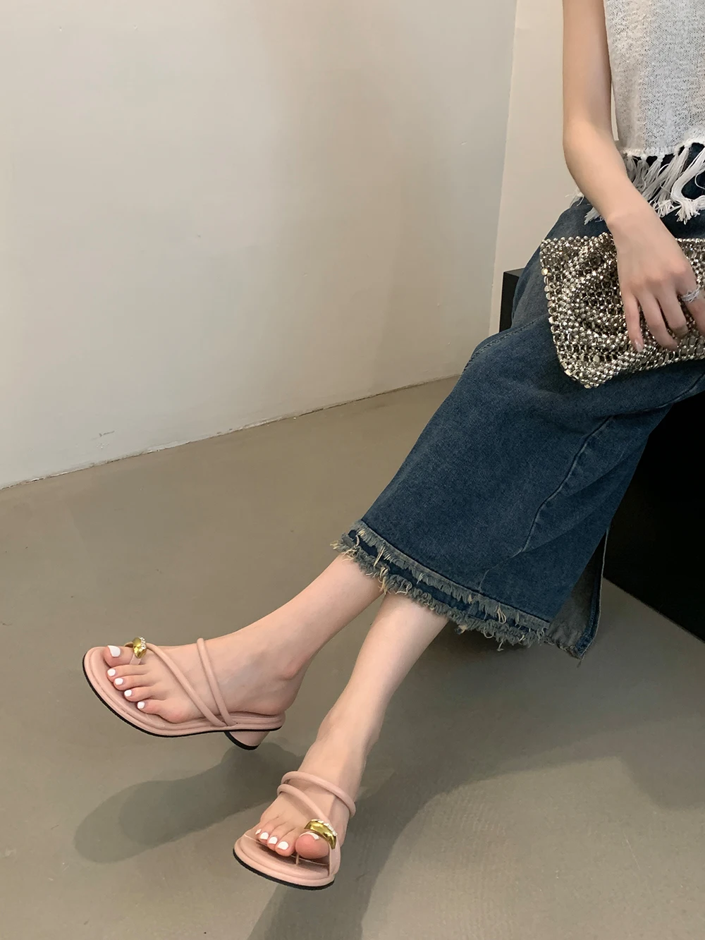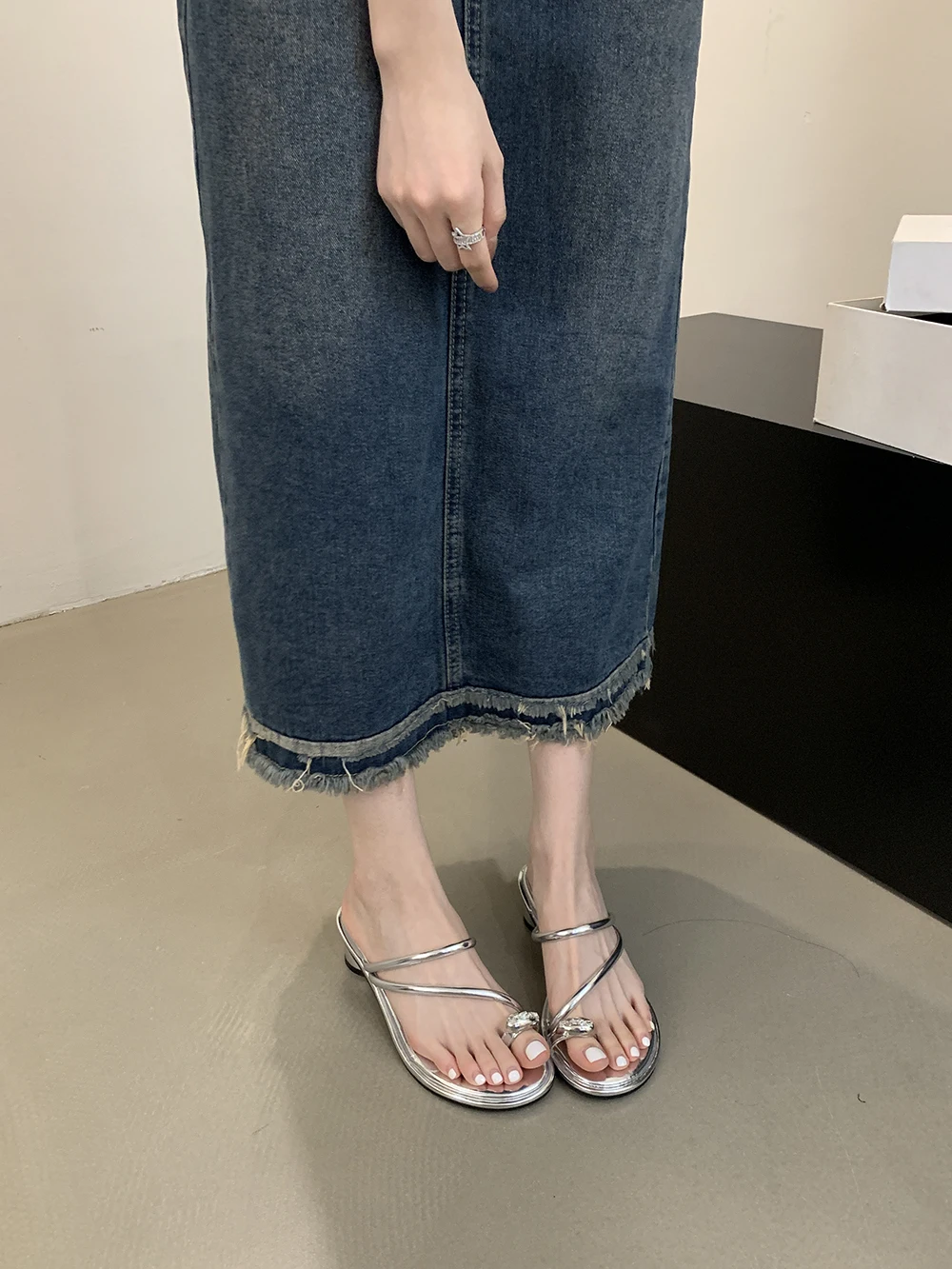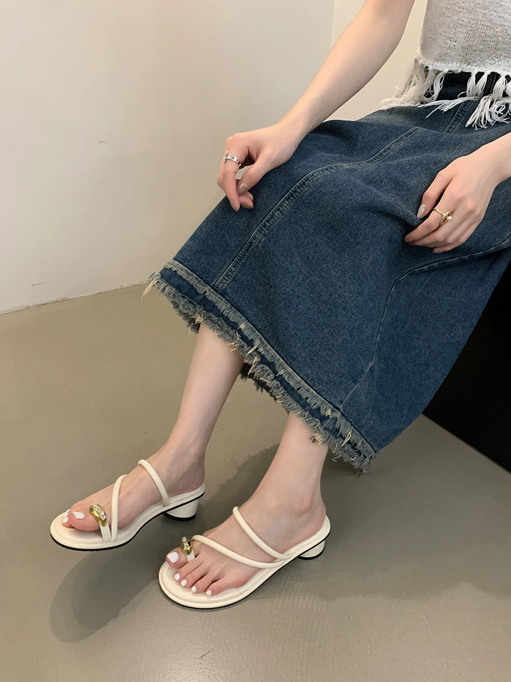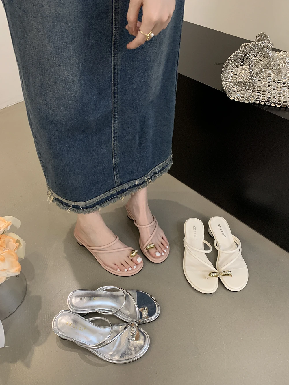 LBSFY - Fashion Women Slides Slippers Silver Pink White Narrow Band Summer Thick Mid Heels Slip On Party Pumps Dress Shoes Woman Size 39