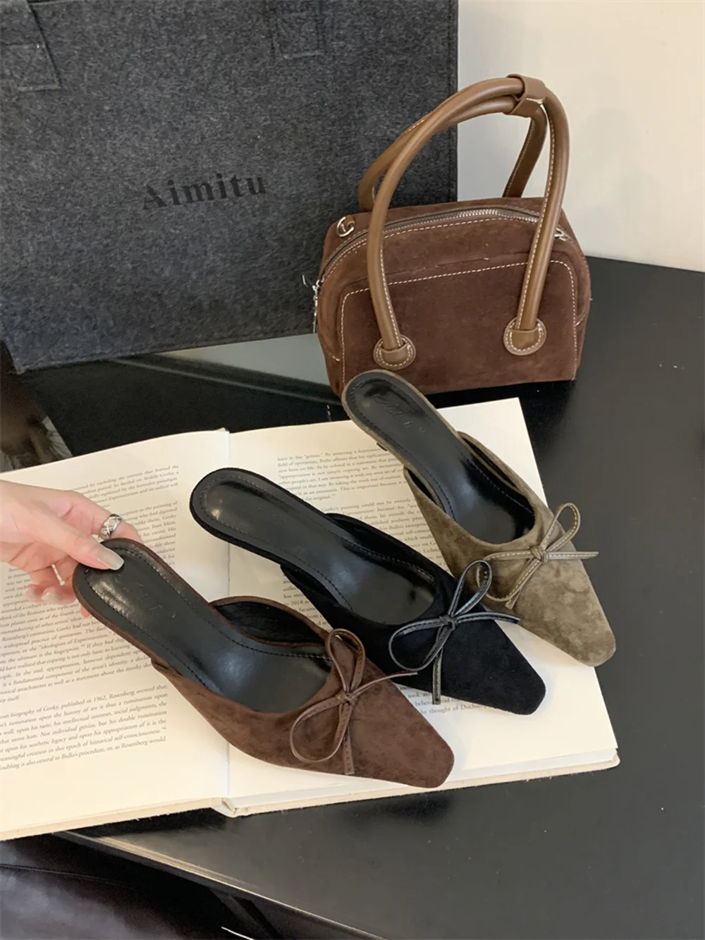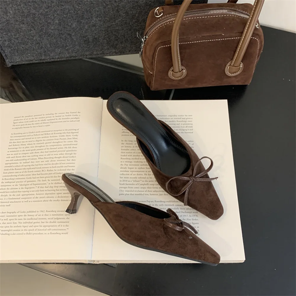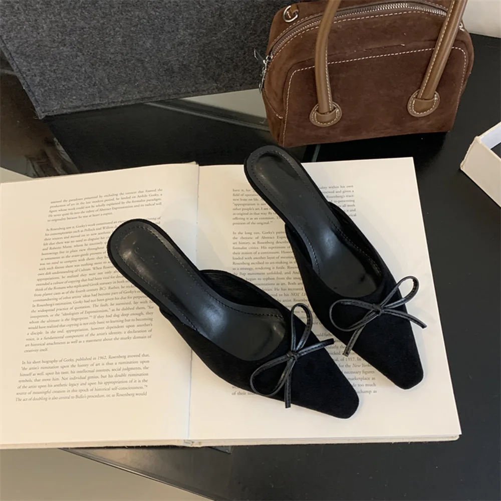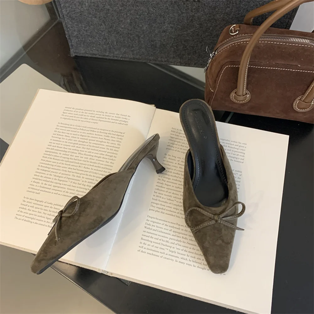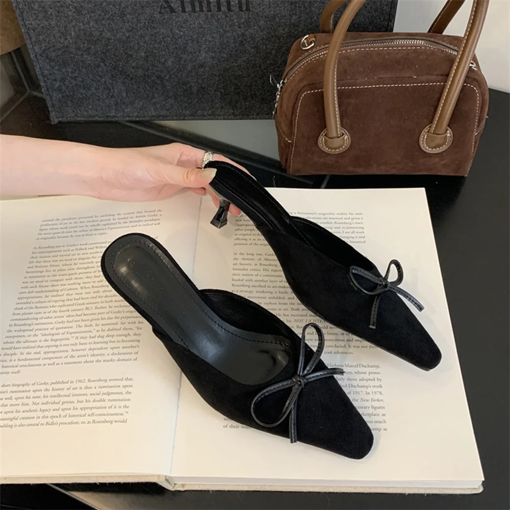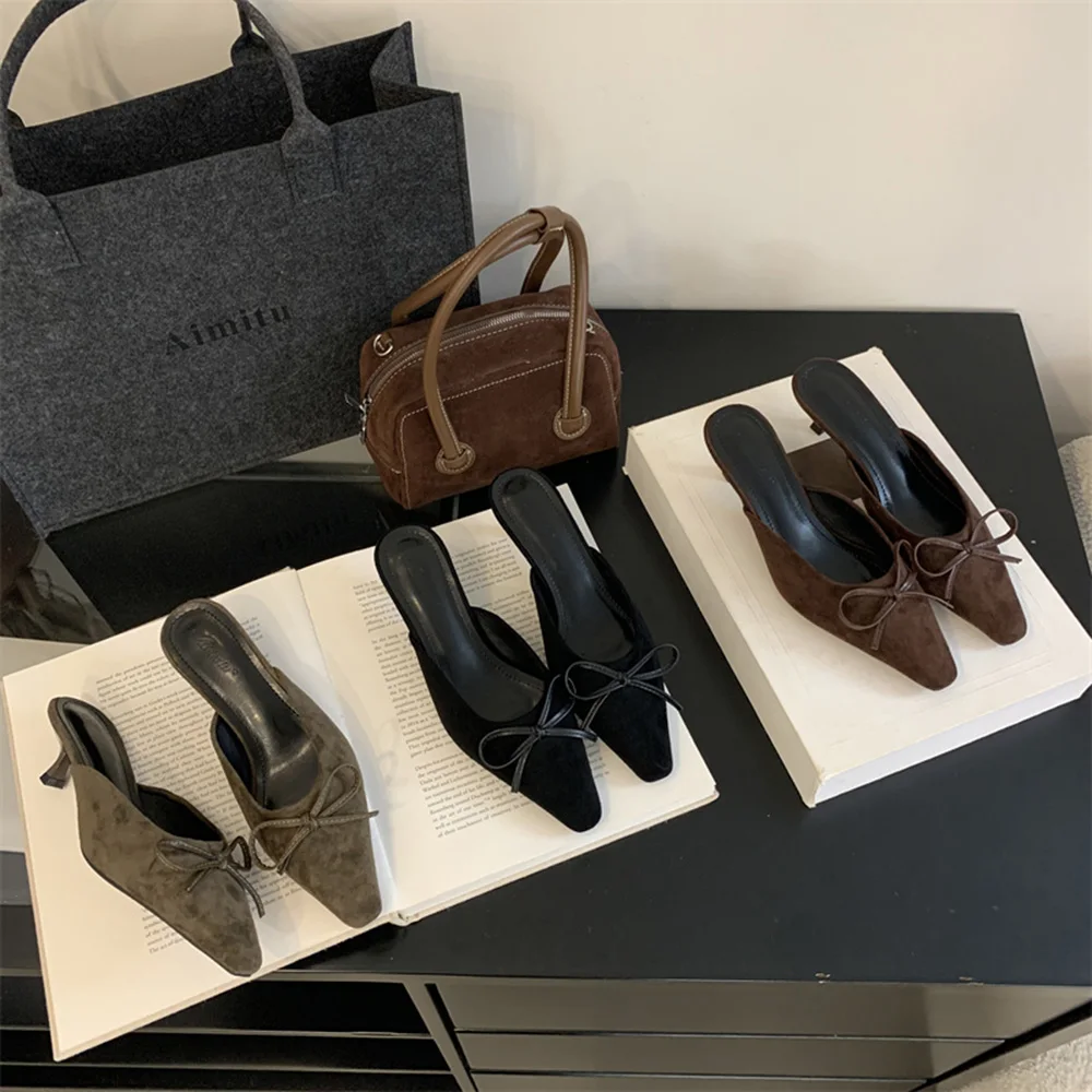 LBSFY - Fashion Women Slippers Pointed Toe Black Brown Khaki Thin Mid Heels Bow Design Shallow Slip On Party Outside Mules Shoes 35-39