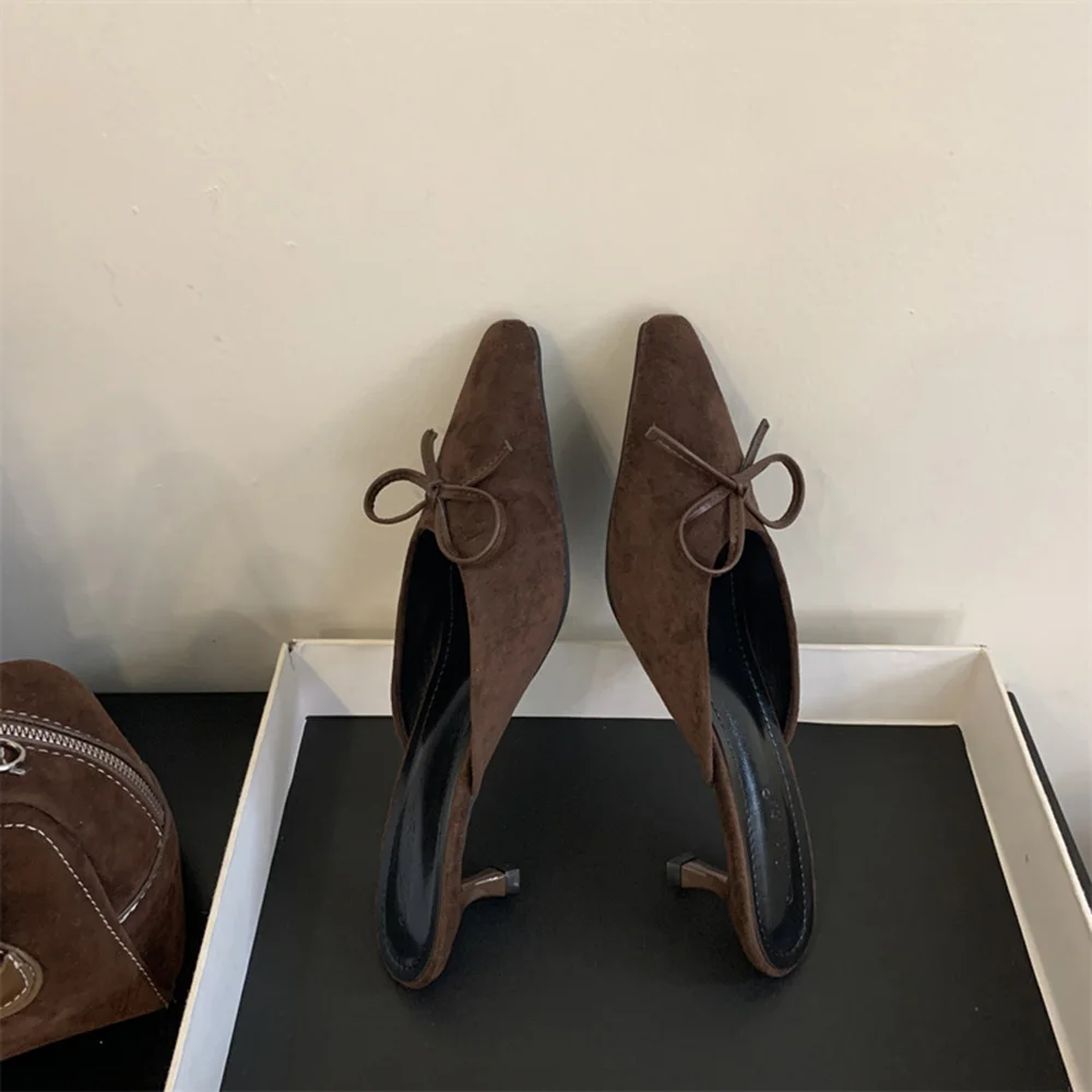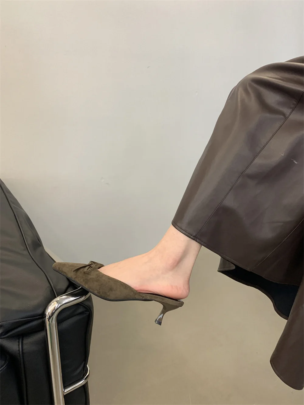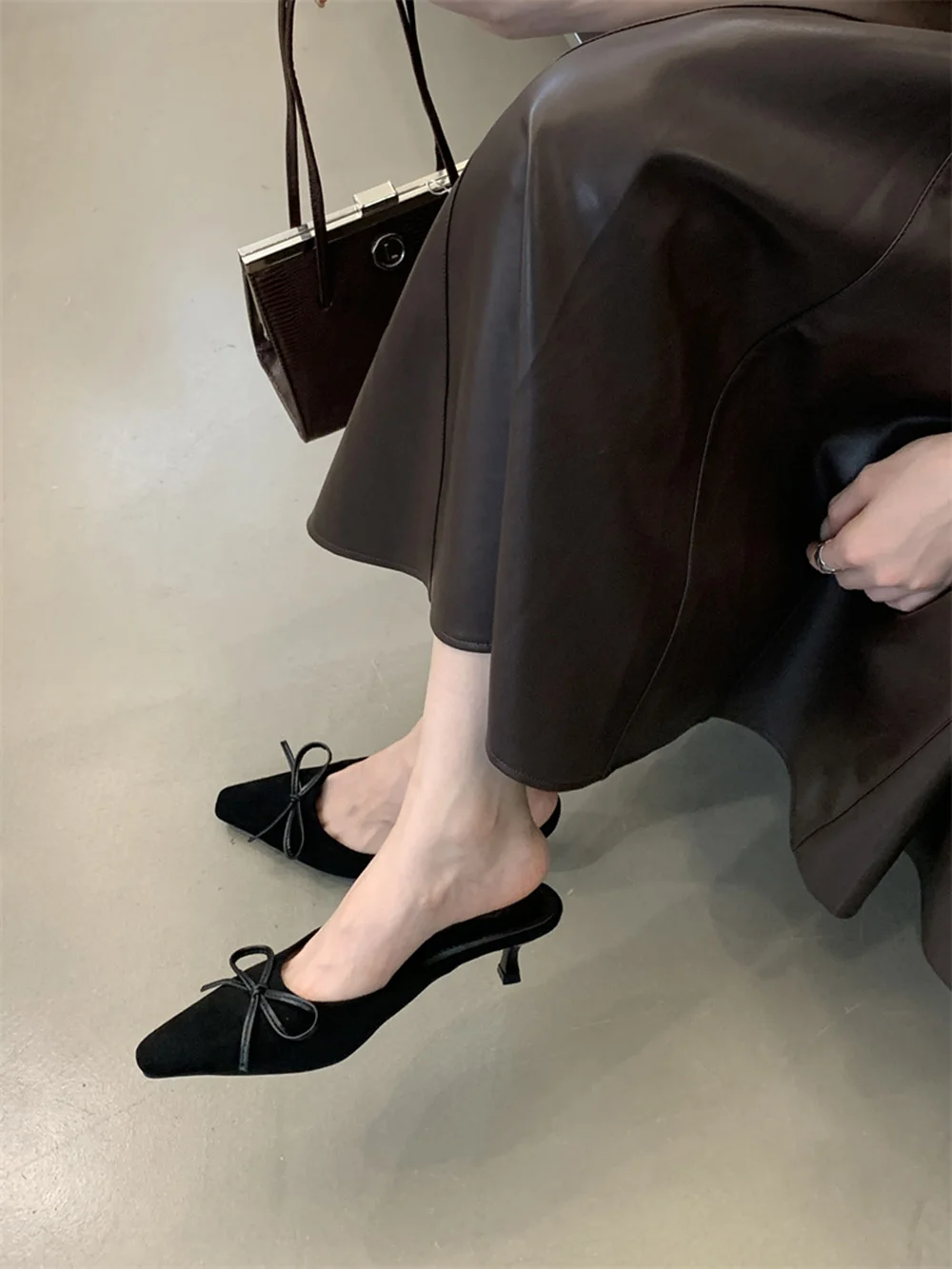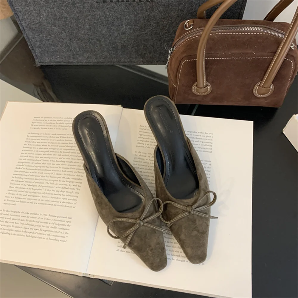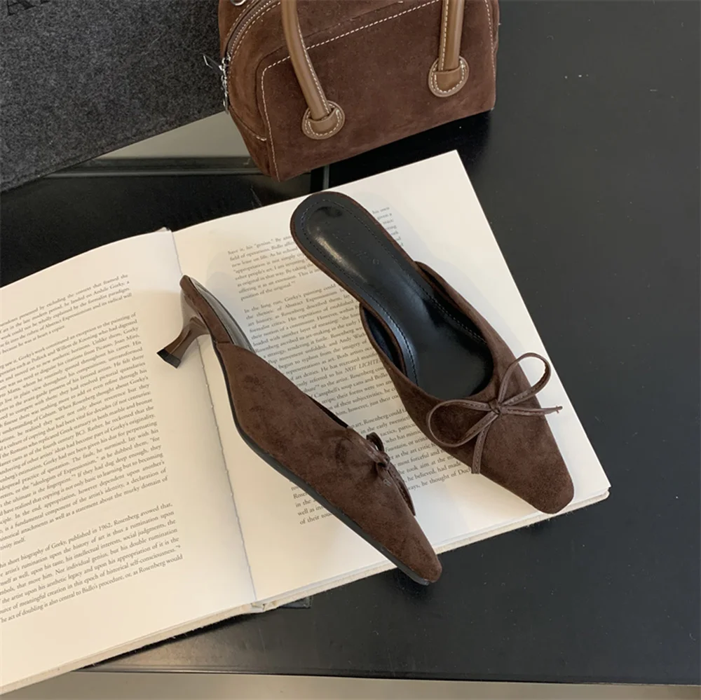 LBSFY - Fashion Women Slippers Pointed Toe Black Brown Khaki Thin Mid Heels Bow Design Shallow Slip On Party Outside Mules Shoes 35-39