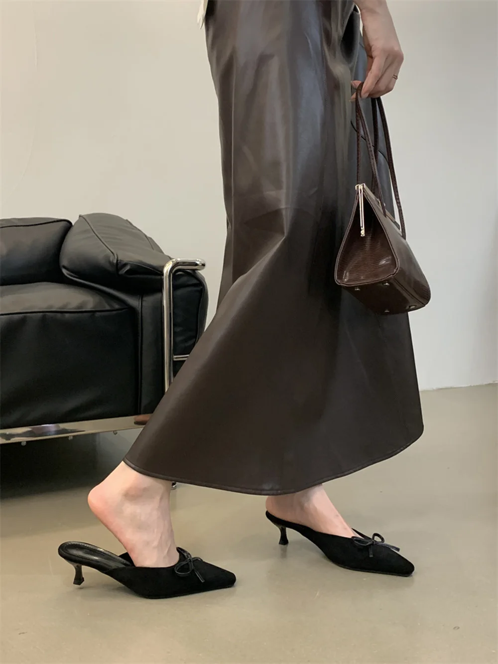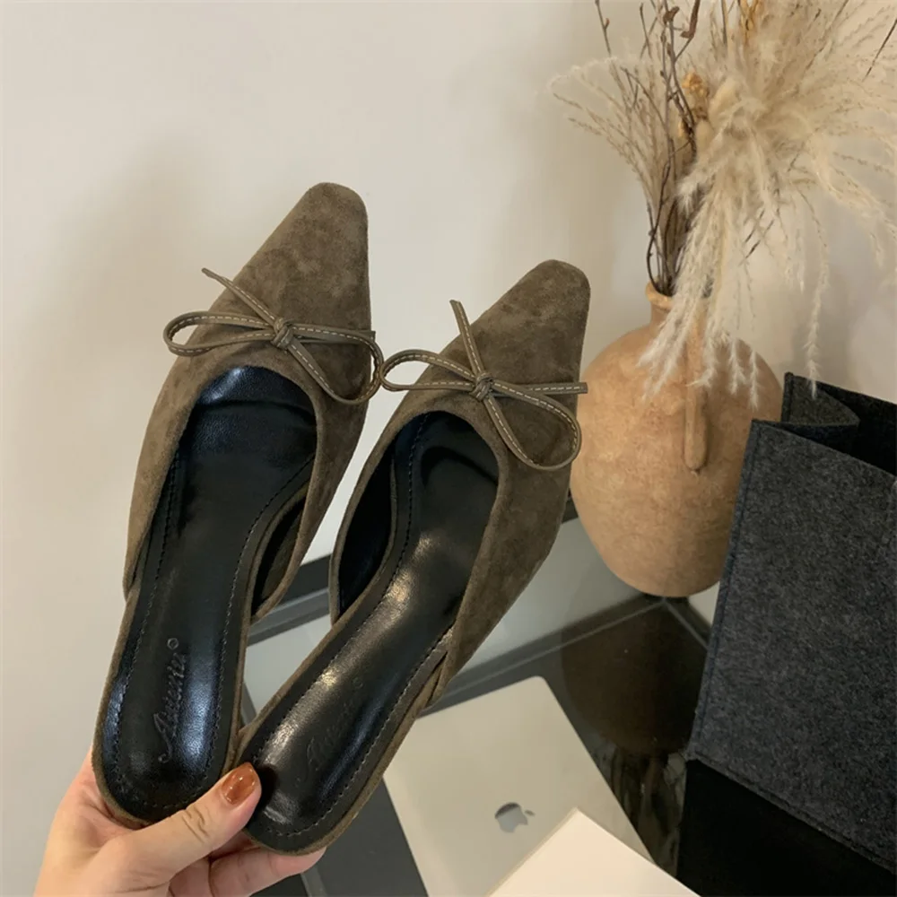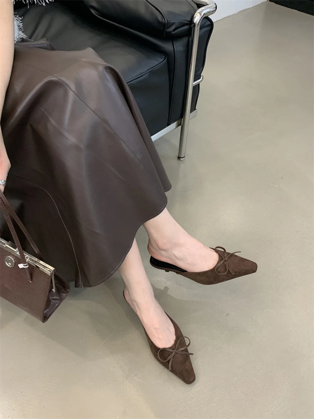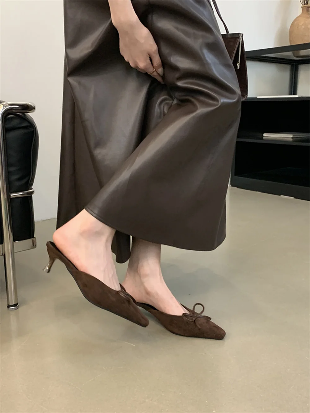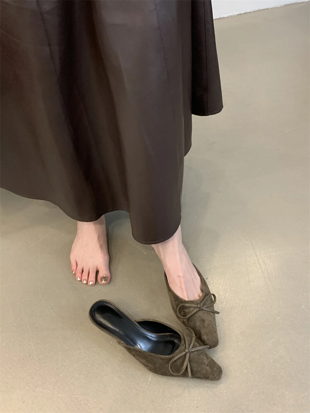 LBSFY - Fashion Women Slippers Pointed Toe Black Brown Khaki Thin Mid Heels Bow Design Shallow Slip On Party Outside Mules Shoes 35-39