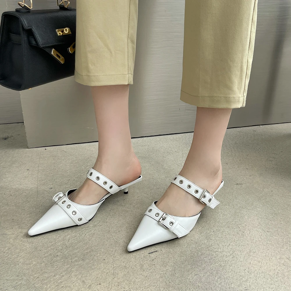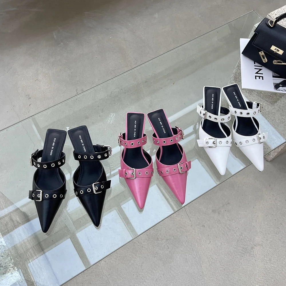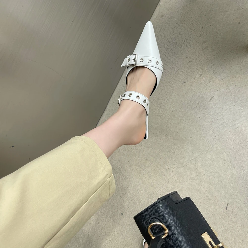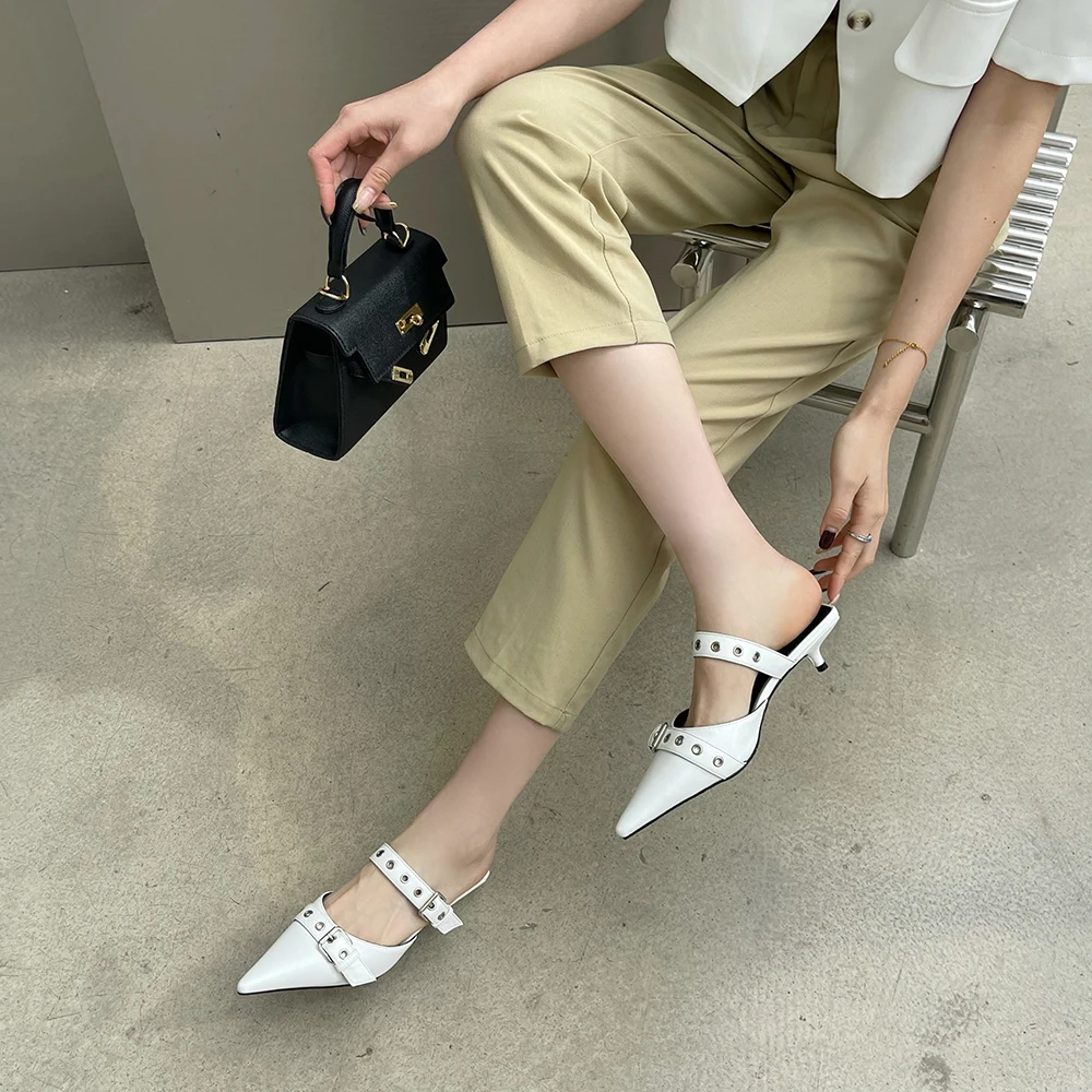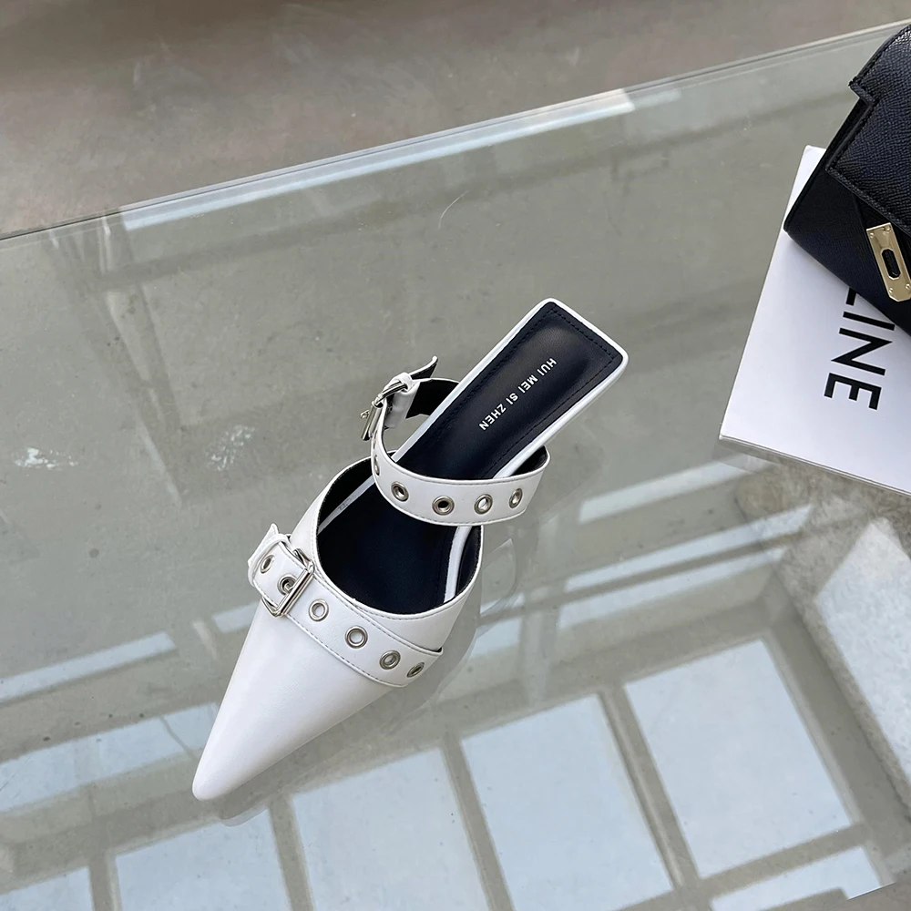 LBSFY - Fashion Women Slippers Pointed Toe Summer Outside Slides Thin Low Heels Black White Pink Rivet Design Fashion Outside Mules Shoe