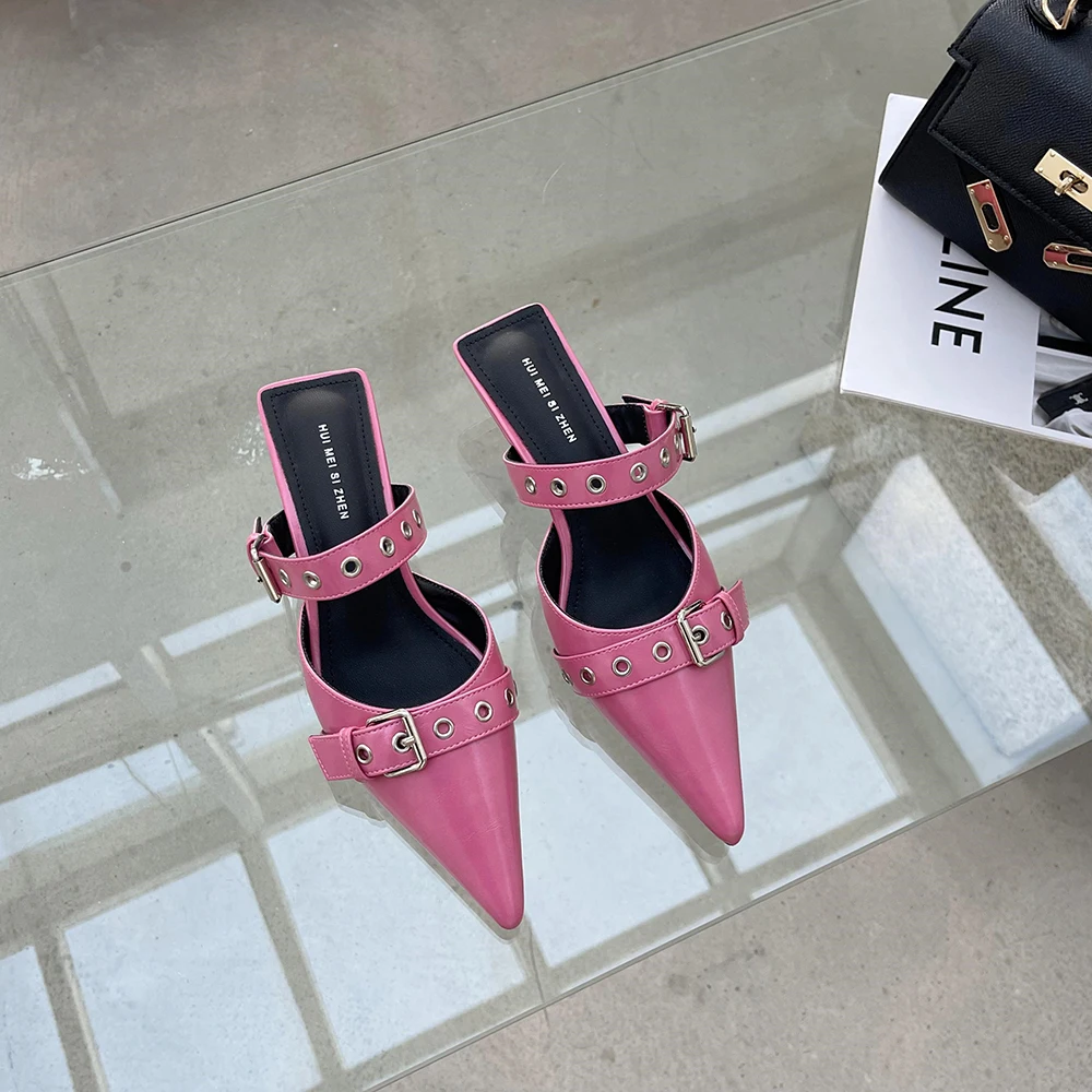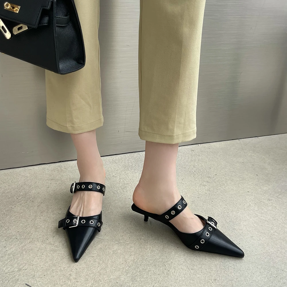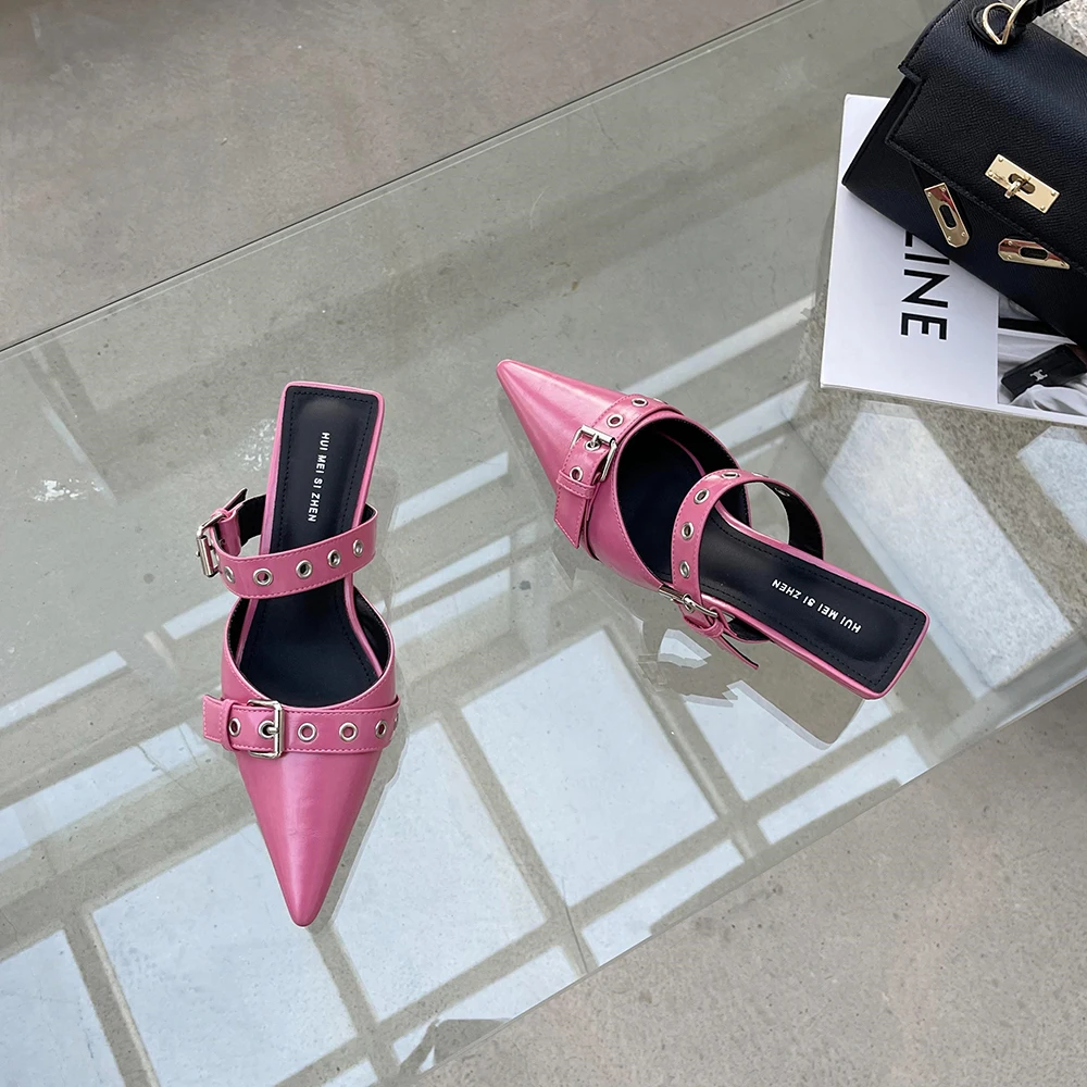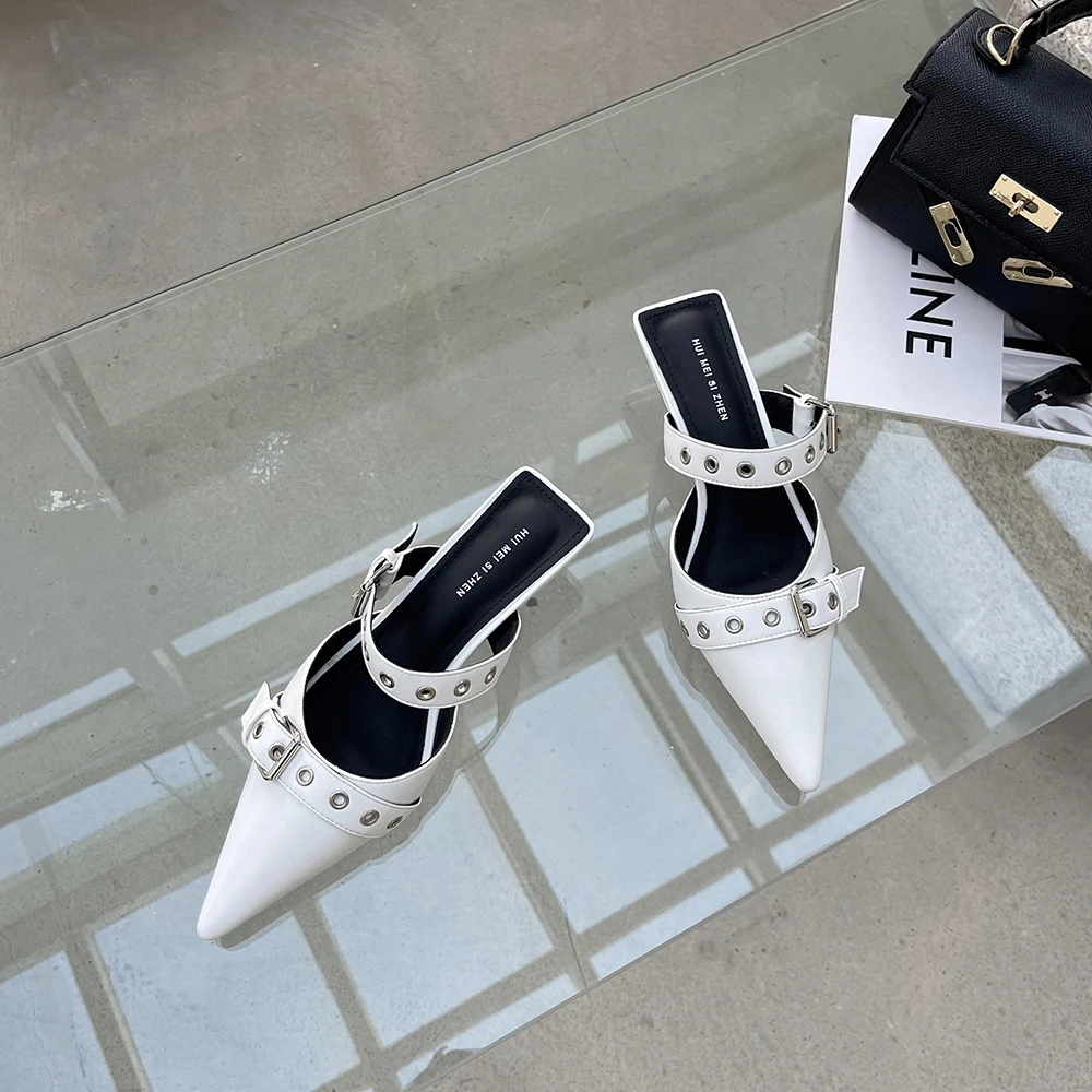LBSFY - Fashion Women Slippers Pointed Toe Summer Outside Slides Thin Low Heels Black White Pink Rivet Design Fashion Outside Mules Shoe