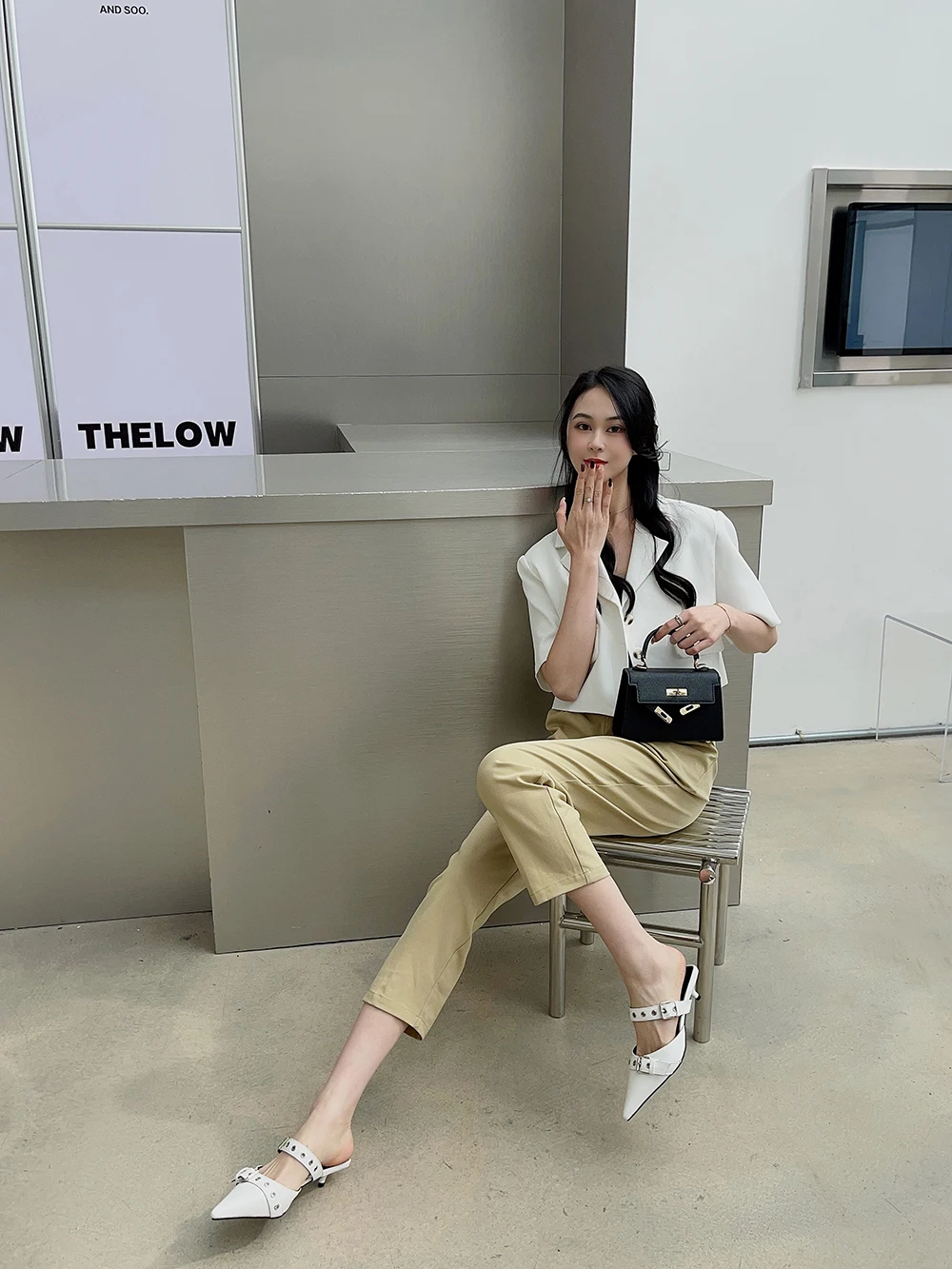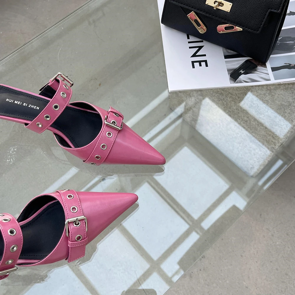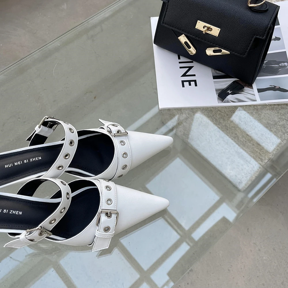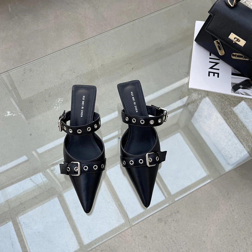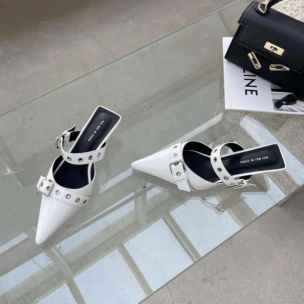 LBSFY - Fashion Women Slippers Pointed Toe Summer Outside Slides Thin Low Heels Black White Pink Rivet Design Fashion Outside Mules Shoe