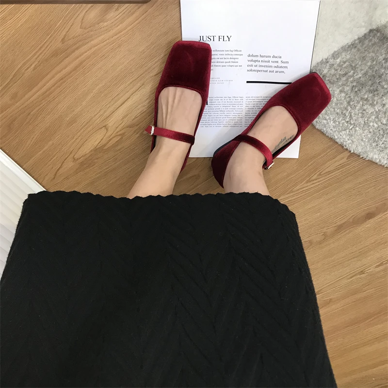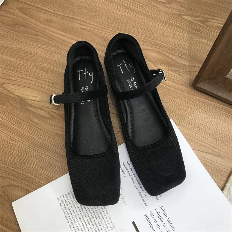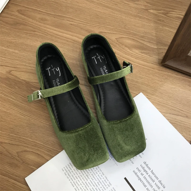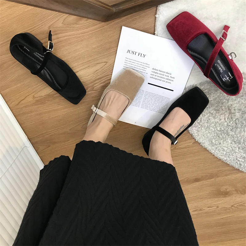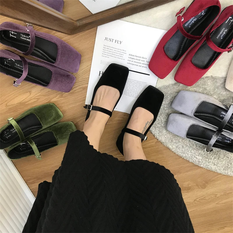 LBSFY -Fashion Women's Velvet Flats Ladies Square Toe Shallow Buckle Casual Ballet Shoes Slip-on Outdoor Mary Jane Shoes