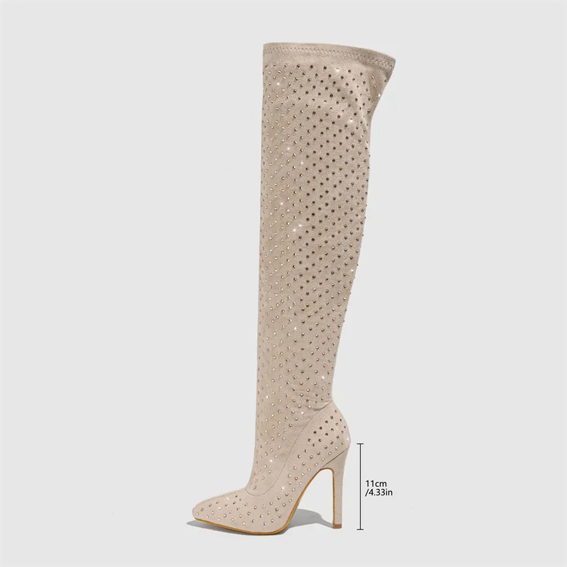 LBSFY - Fashion Zip Thigh High Sock Boots Women Red Rhinestone Stretch Fabric Pointed Toe Stiletto Heels Over The Knee Long Shoes
