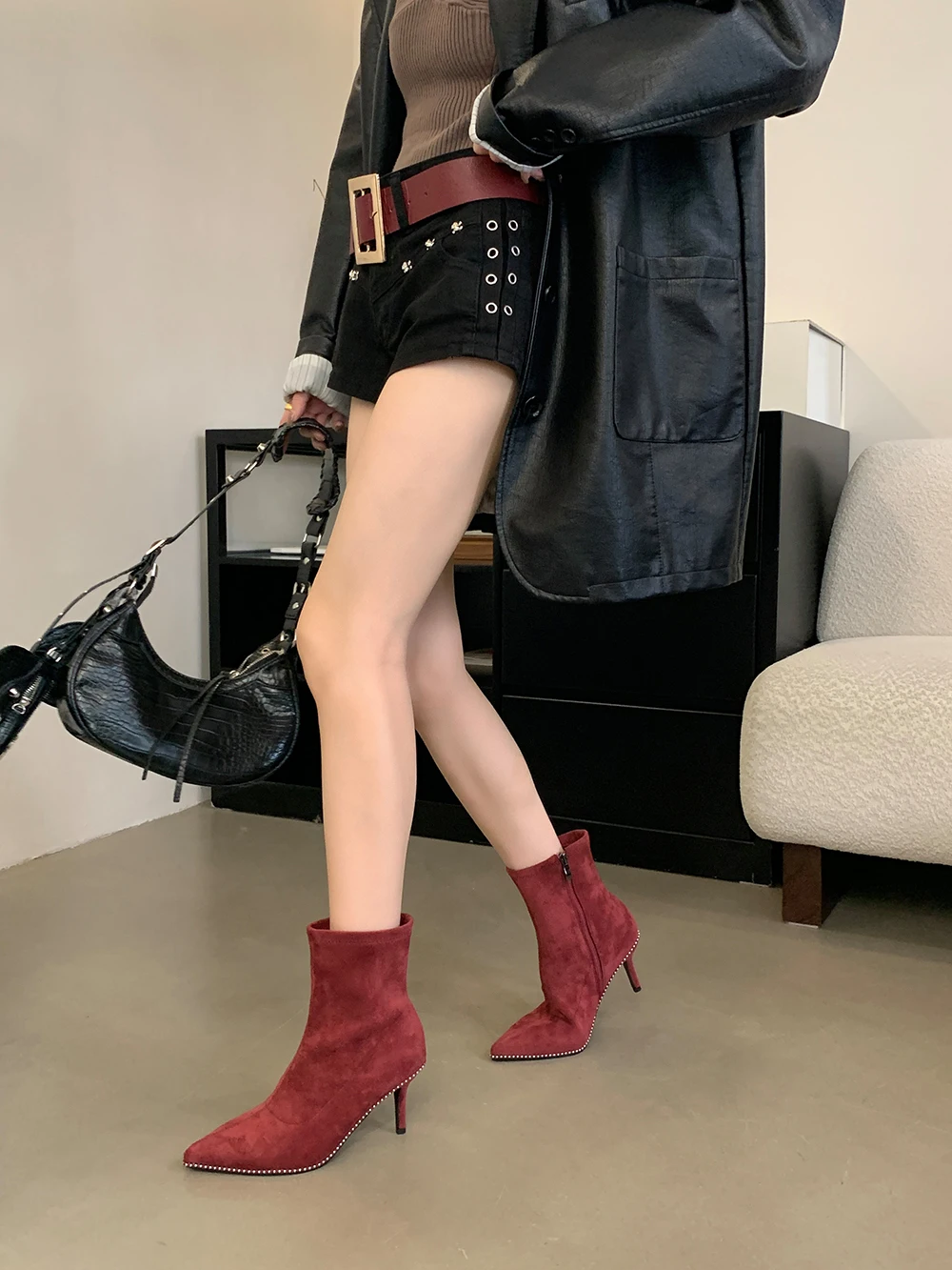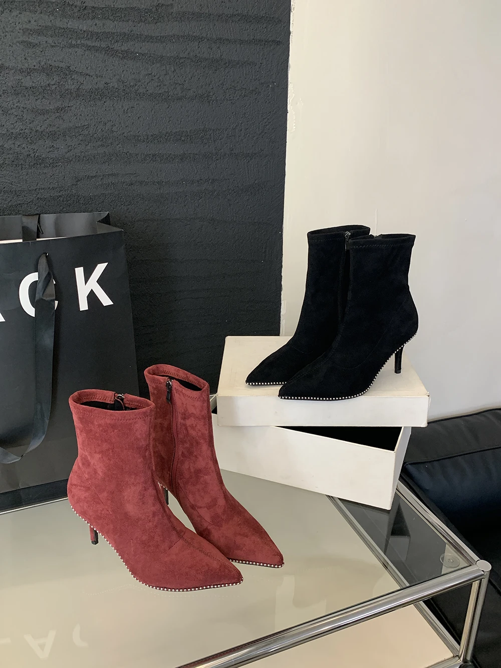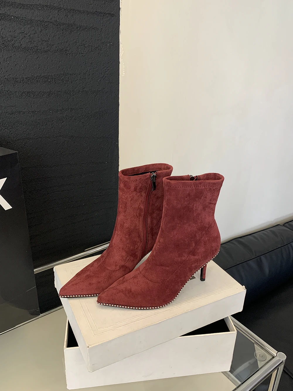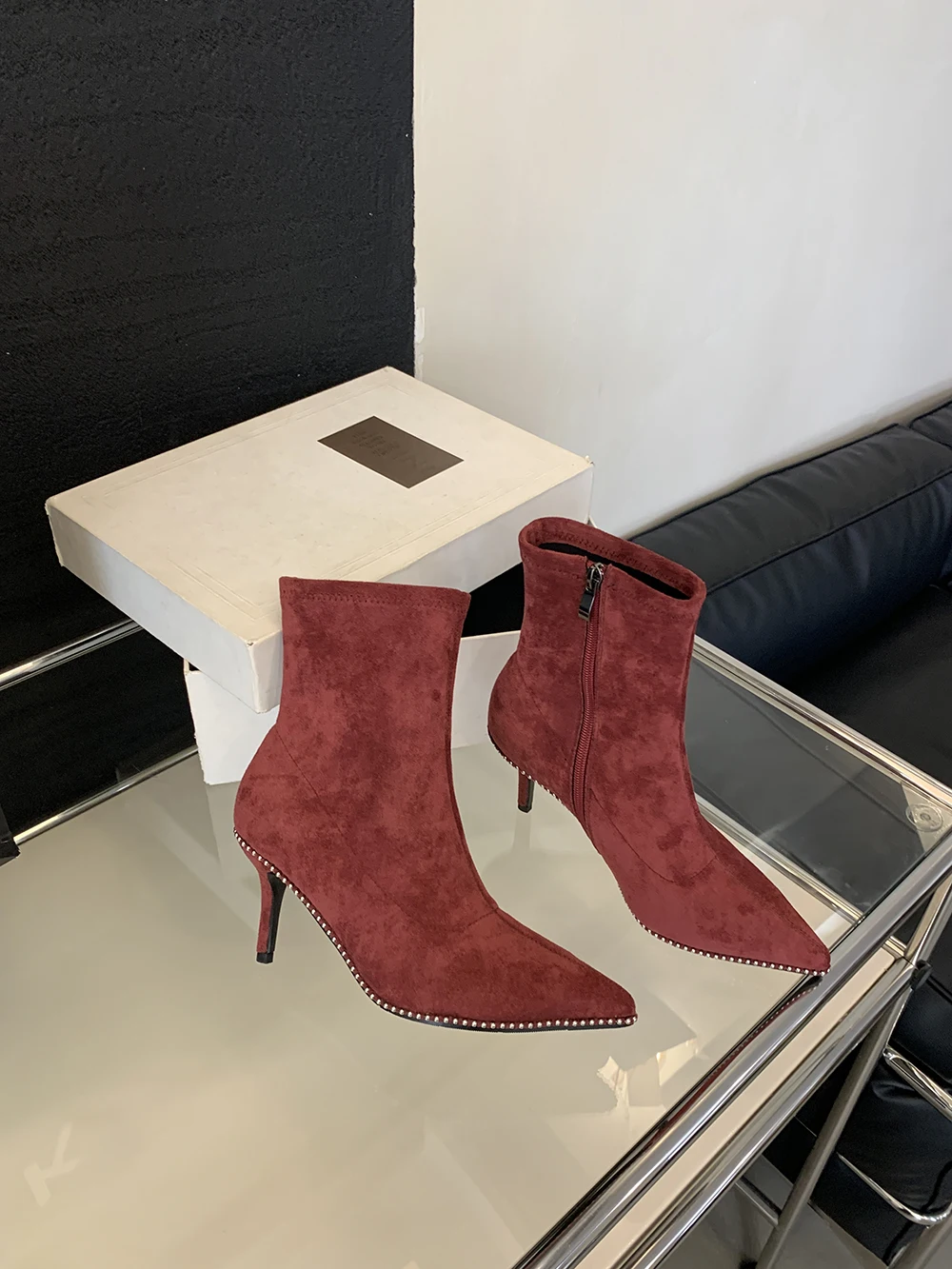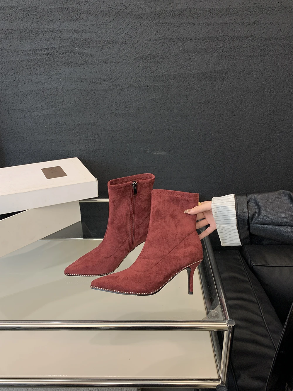 LBSFY - Flock Women Ankle Boots Chelsea Botas Thin High Heels Side Zipper 2024 New Arrivals Fashion Party Pumps Shoes Woman Size 35-39
