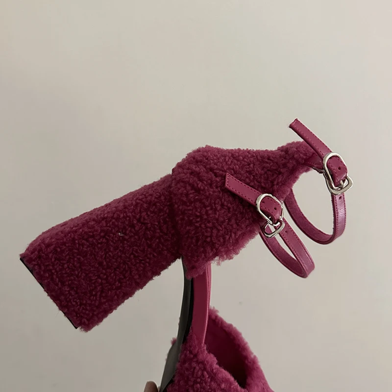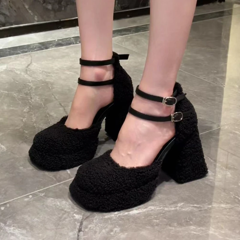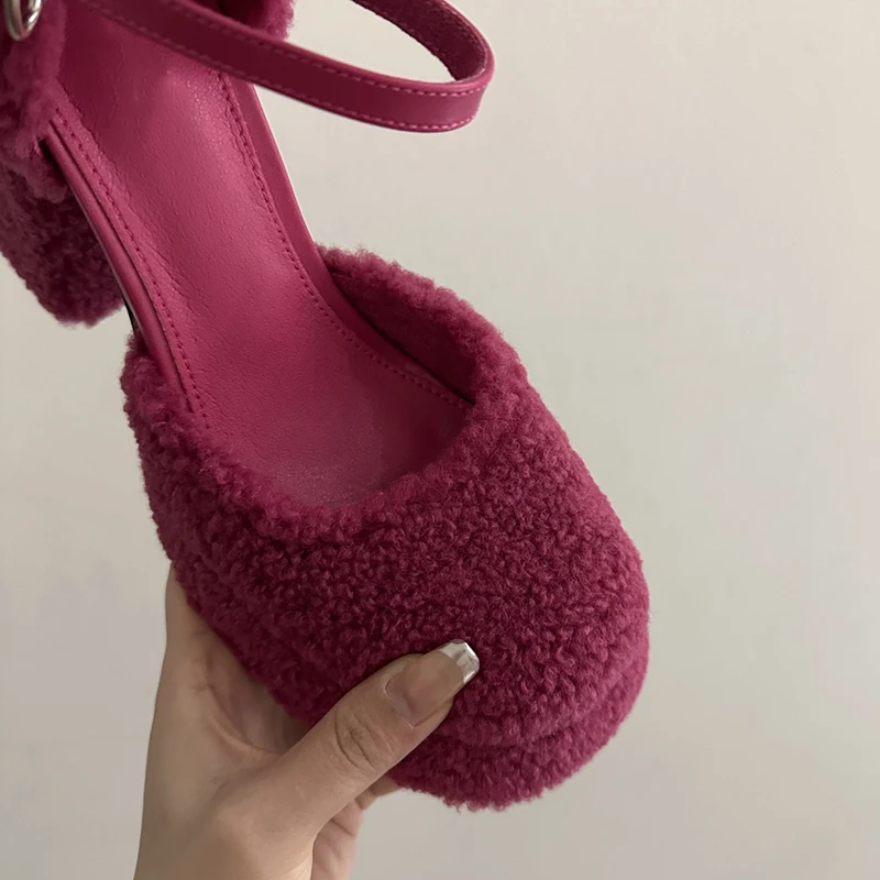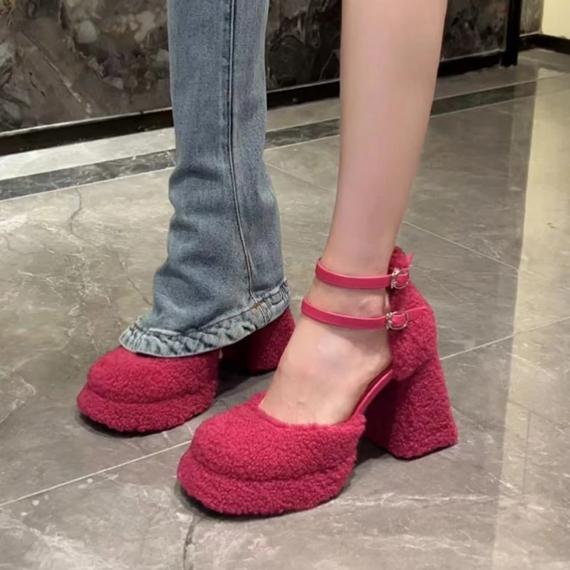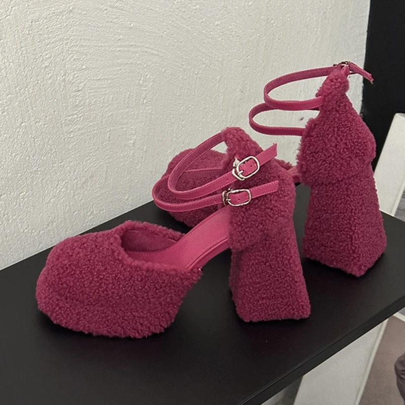 LBSFY - Fluffy Fur High Heels Pumps Women 2024 Spring Ankle Straps Red Mary Jane Shoes Woman Chunky Platform Thick Heeled Party Shoes