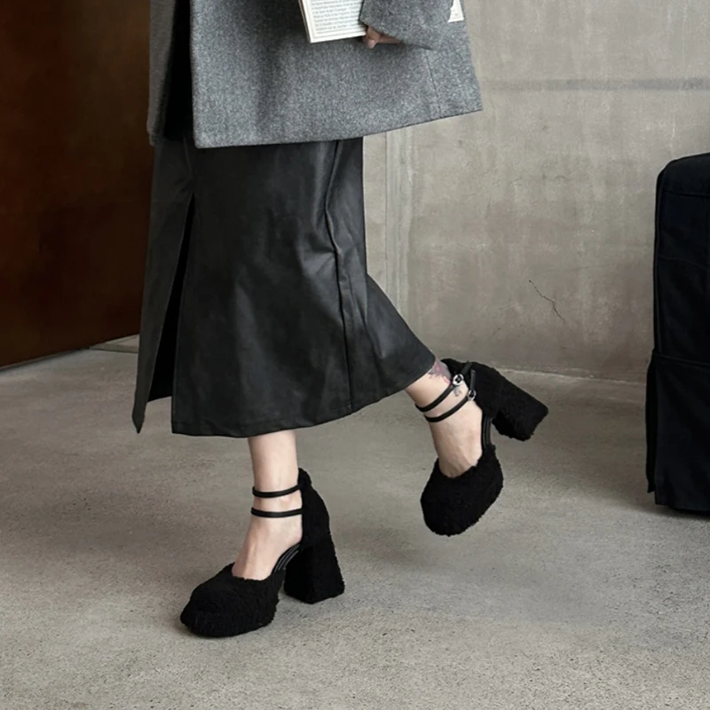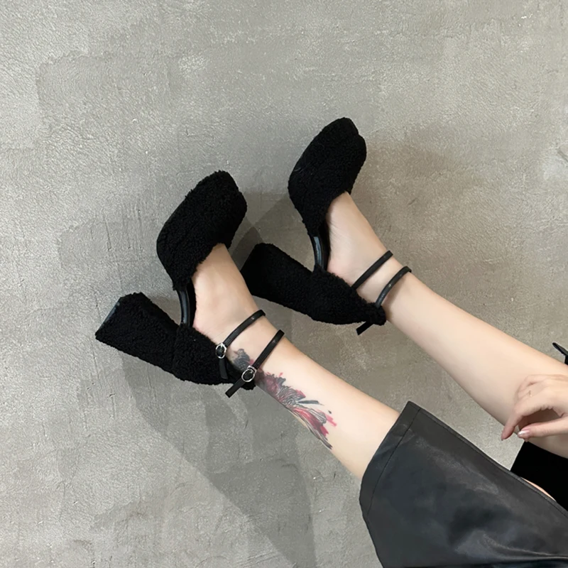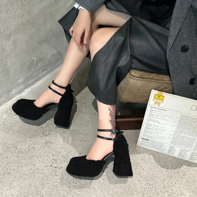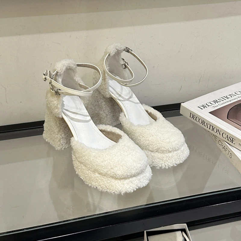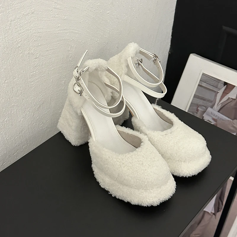 LBSFY - Fluffy Fur High Heels Pumps Women 2024 Spring Ankle Straps Red Mary Jane Shoes Woman Chunky Platform Thick Heeled Party Shoes